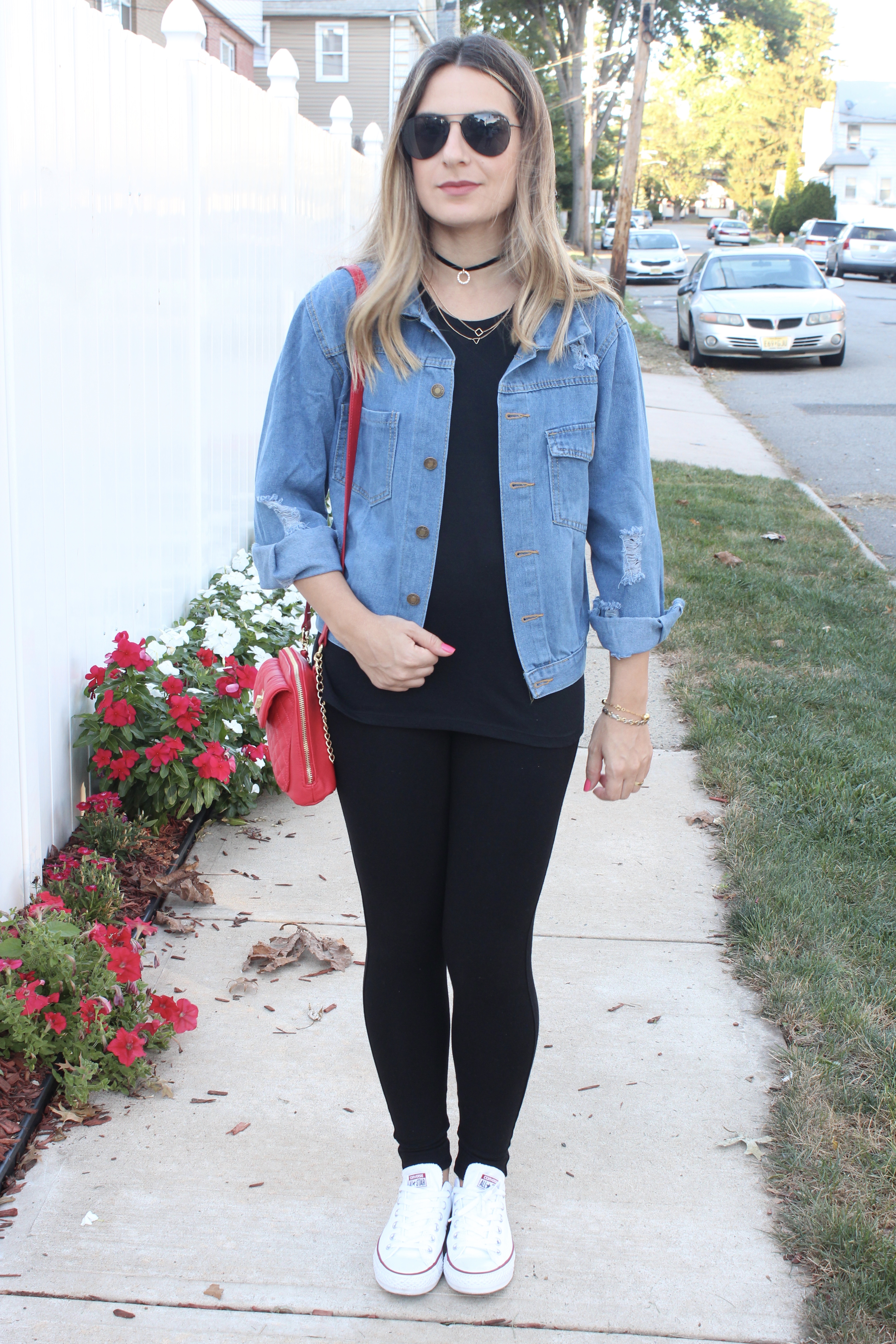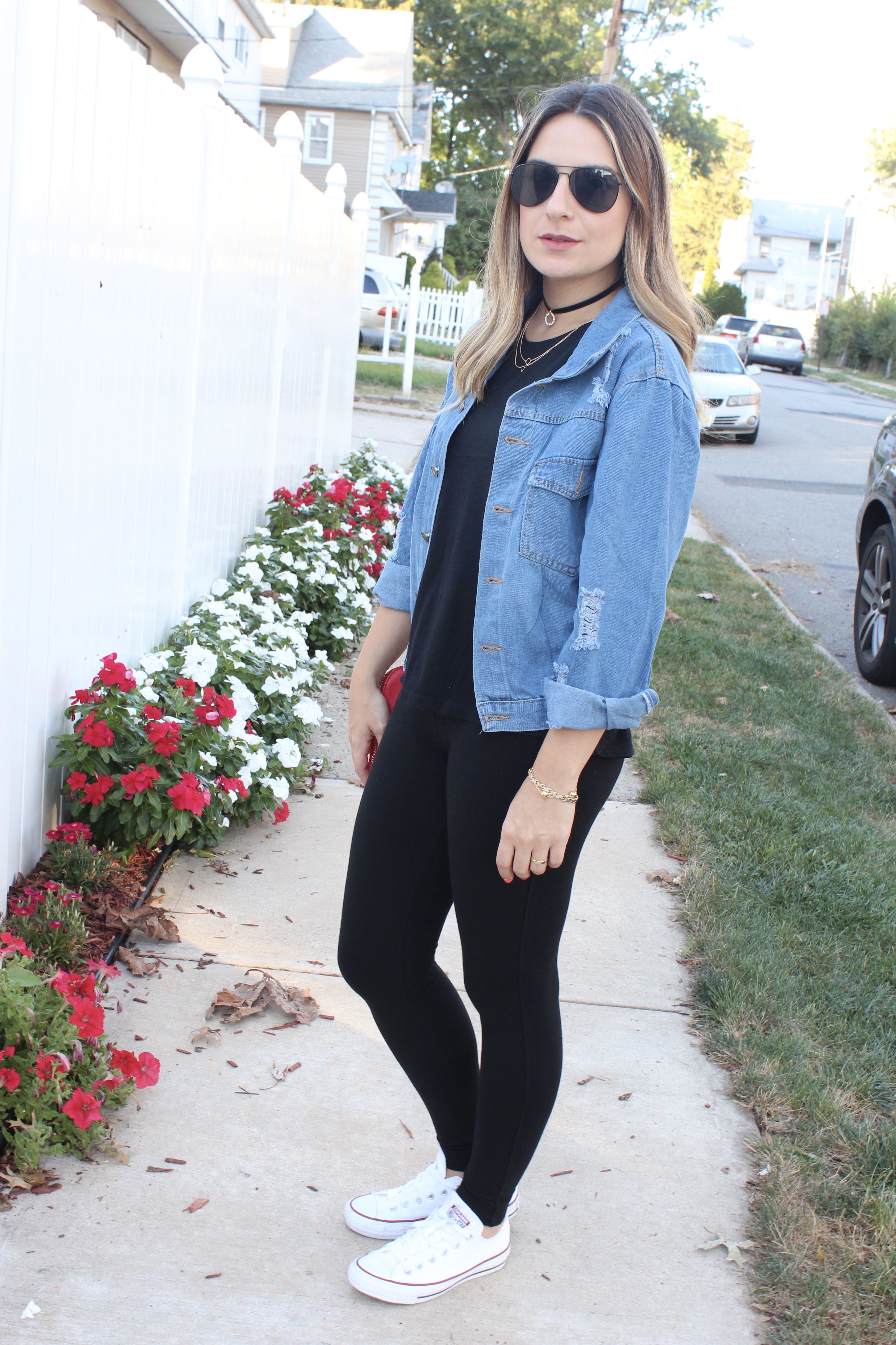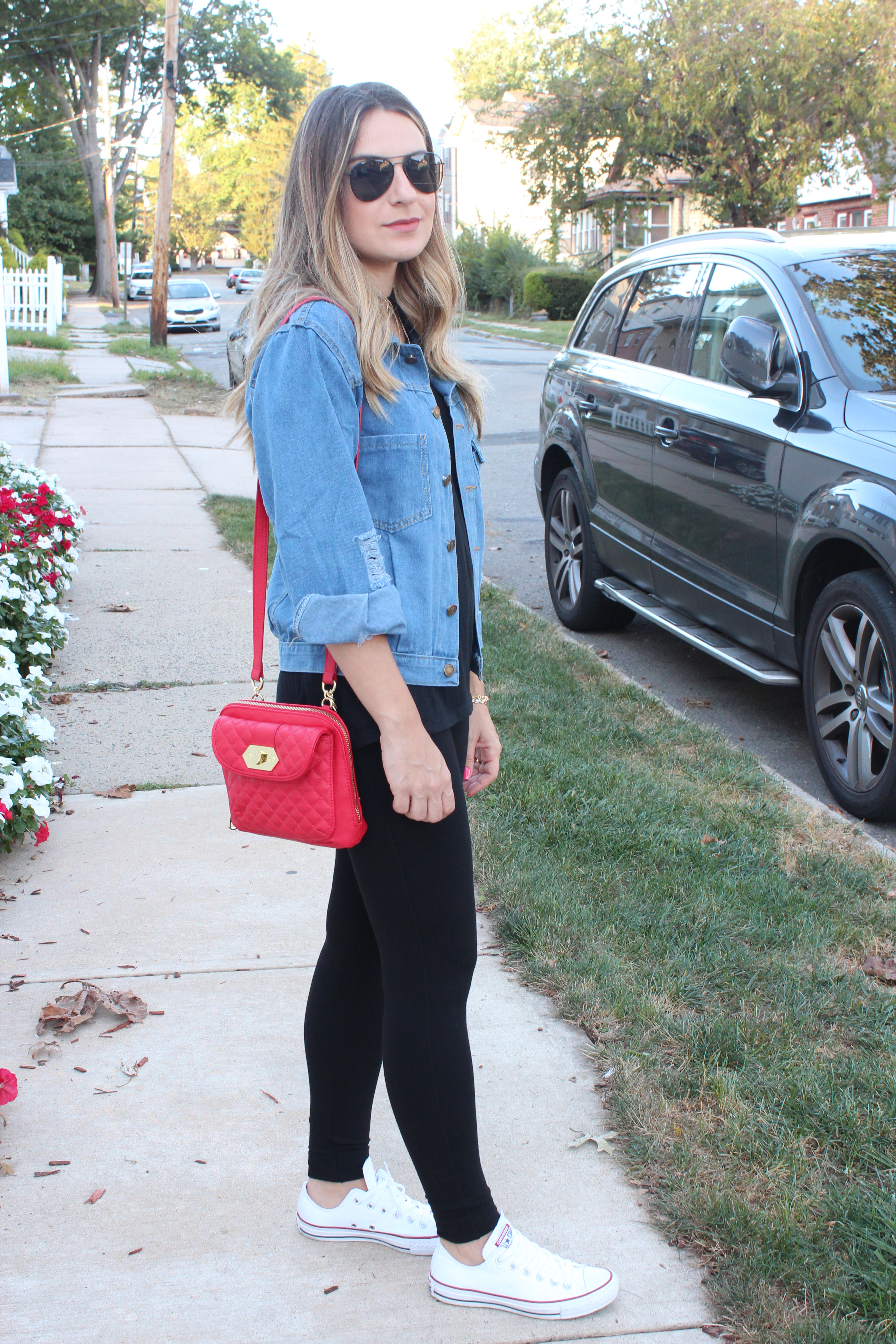Hoje tem look do dia super básico e relax. Sabe aqueles dias que queremos um look fácil de compor e com peças confortáveis!? Nada como uma legging, all star e jaqueta jeans!!!! Adoro!!!! E foi essa a escolha para inspirar o seu final de semana! Usei legging e camiseta preta com uma jaquetinha jeans destroyed e all star branco, mais clássico impossível!!! Finalizei com uma bolsa vermelha para dar um toque de cor e deixar o look mais interessante! Sempre que opto por outfits básicos e neutros escolho um toque de cor 🙂 Vejam como ficou….