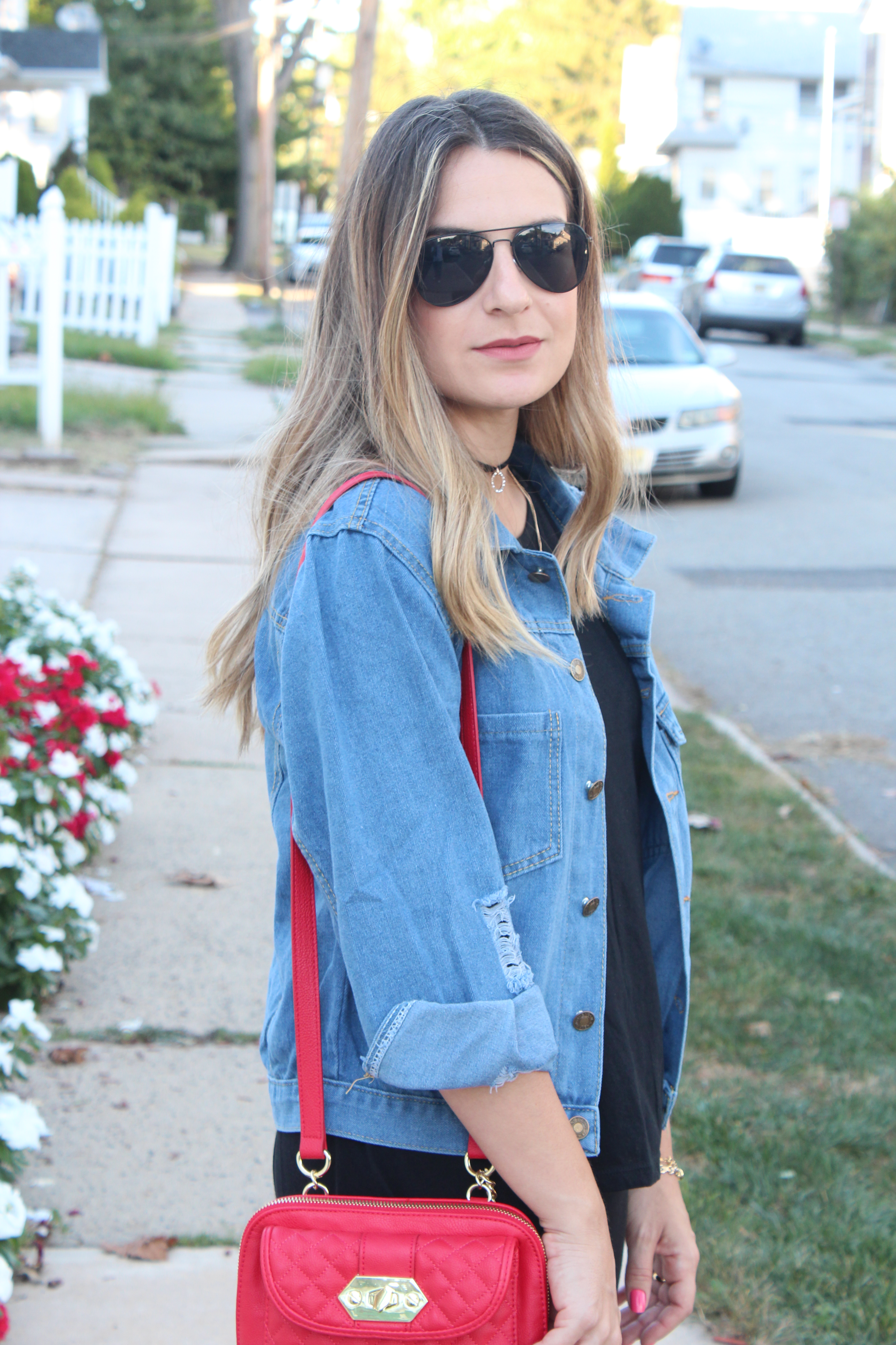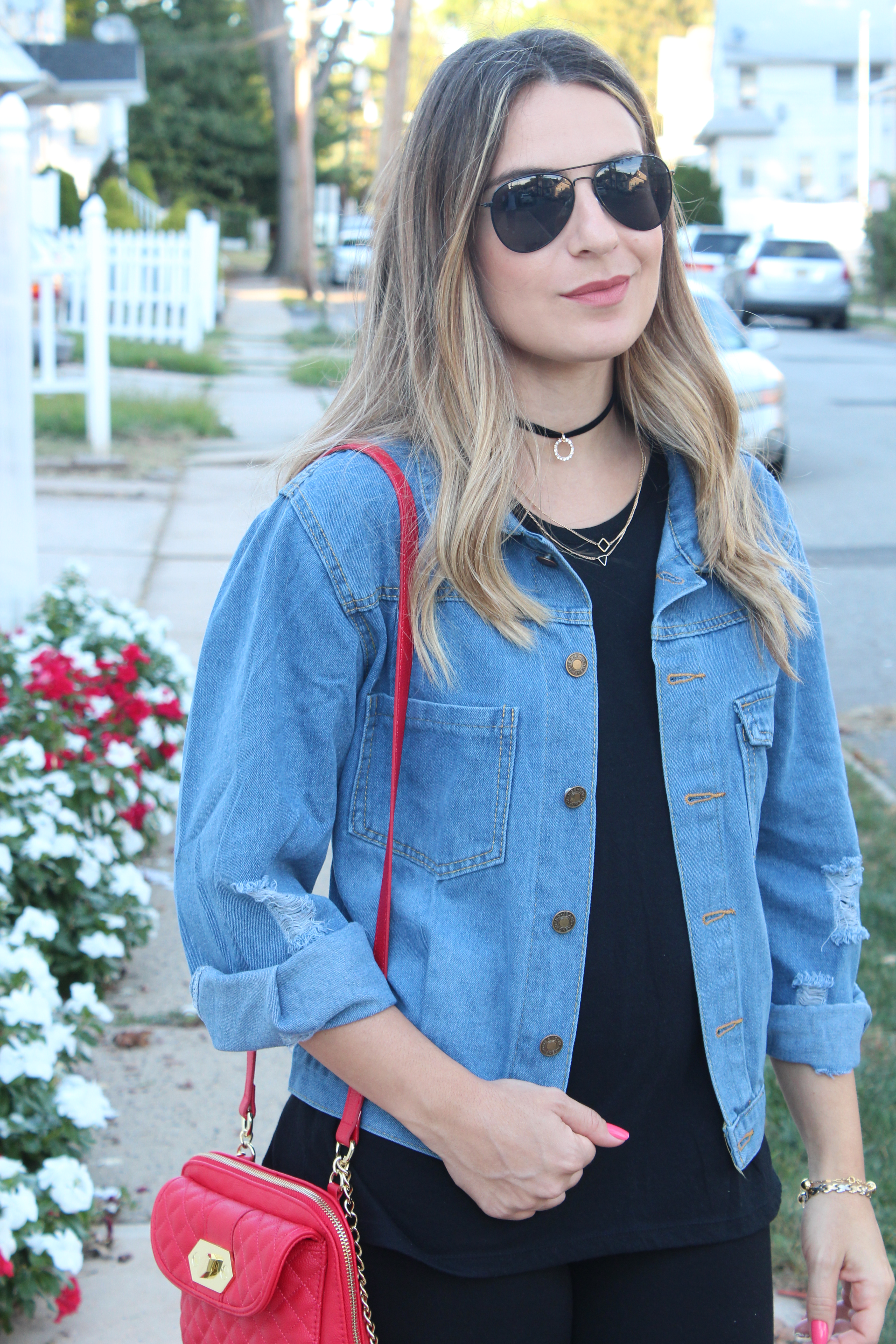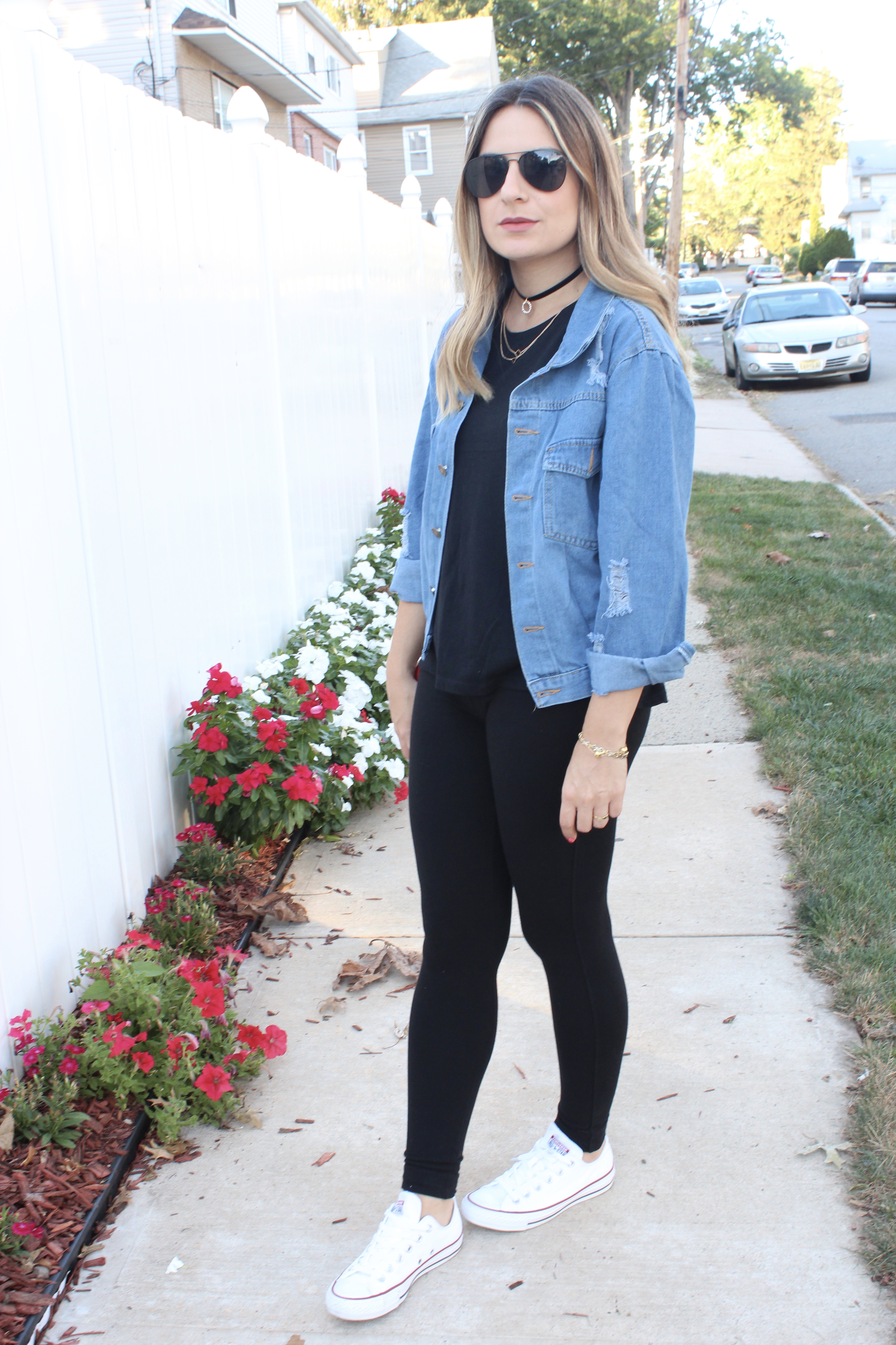 Hoje tem look do dia super básico e relax. Sabe aqueles dias que queremos um look fácil de compor e com peças confortáveis!? Nada como uma legging, all star e jaqueta jeans!!!! Adoro!!!! E foi essa a escolha para inspirar o seu final de semana! Usei legging e camiseta preta com uma jaquetinha jeans destroyed e all star branco, mais clássico impossível!!! Finalizei com uma bolsa vermelha para dar um toque de cor e deixar o look mais interessante! Sempre que opto por outfits básicos e neutros escolho um toque de cor 🙂 Vejam como ficou….