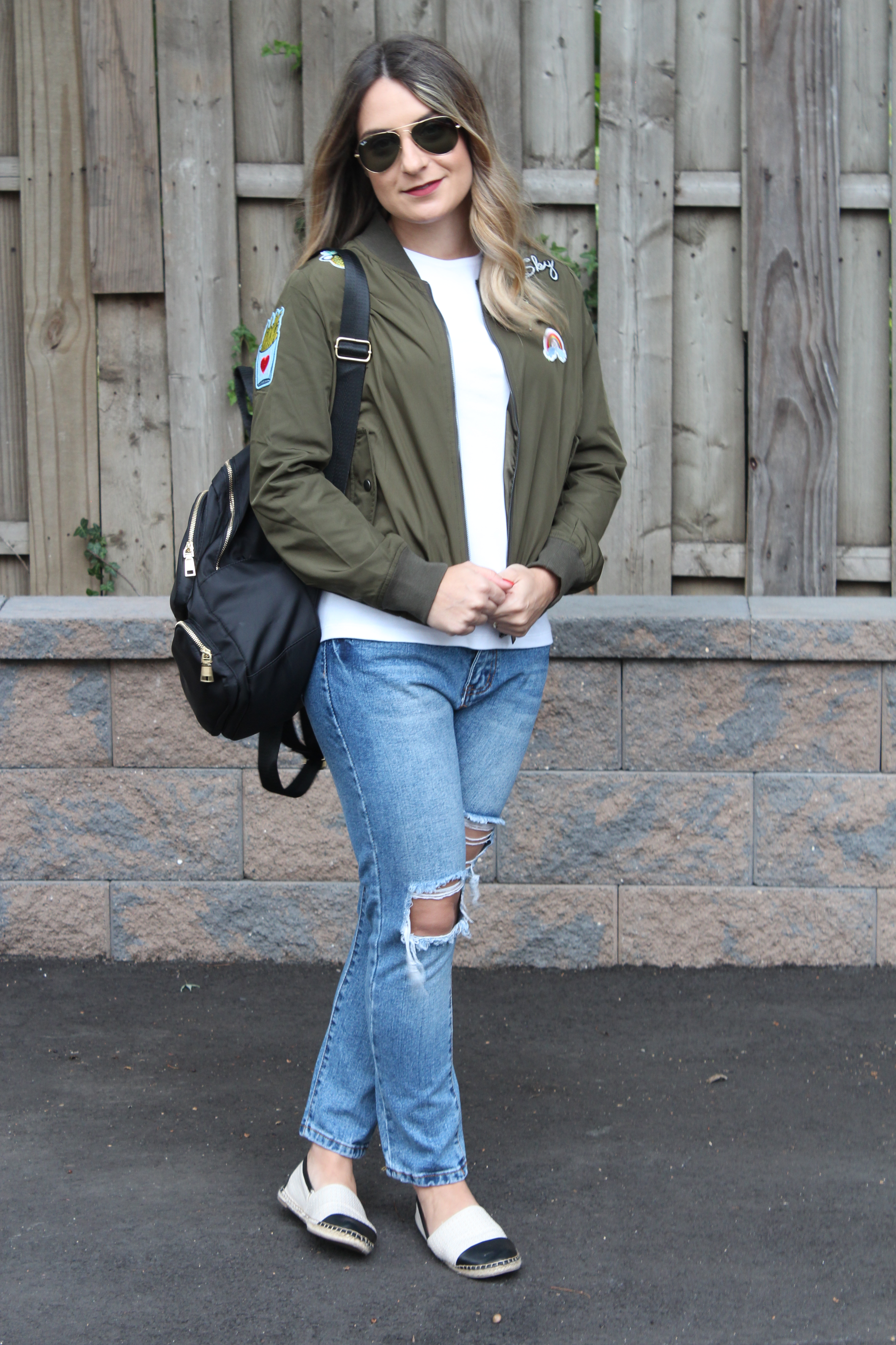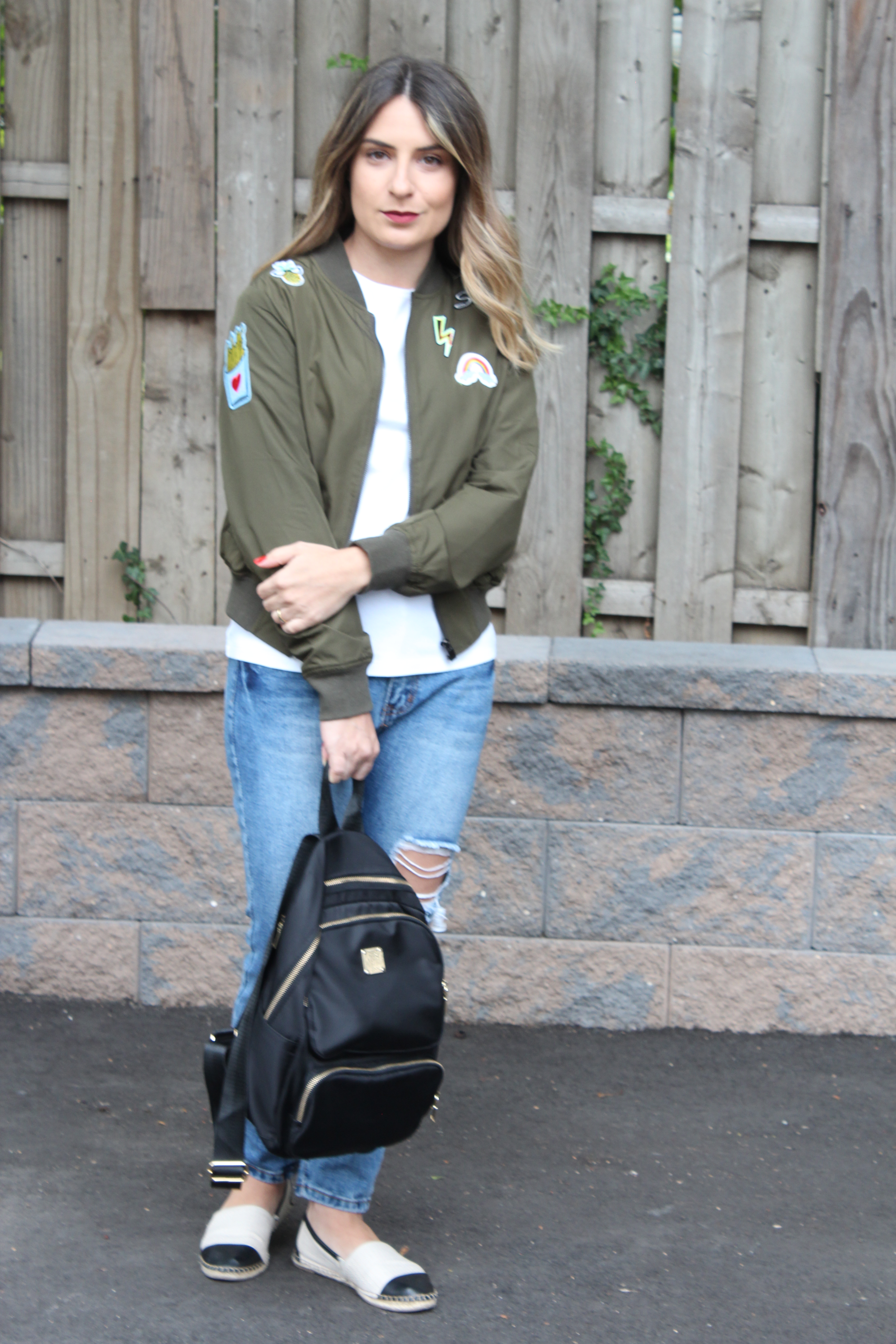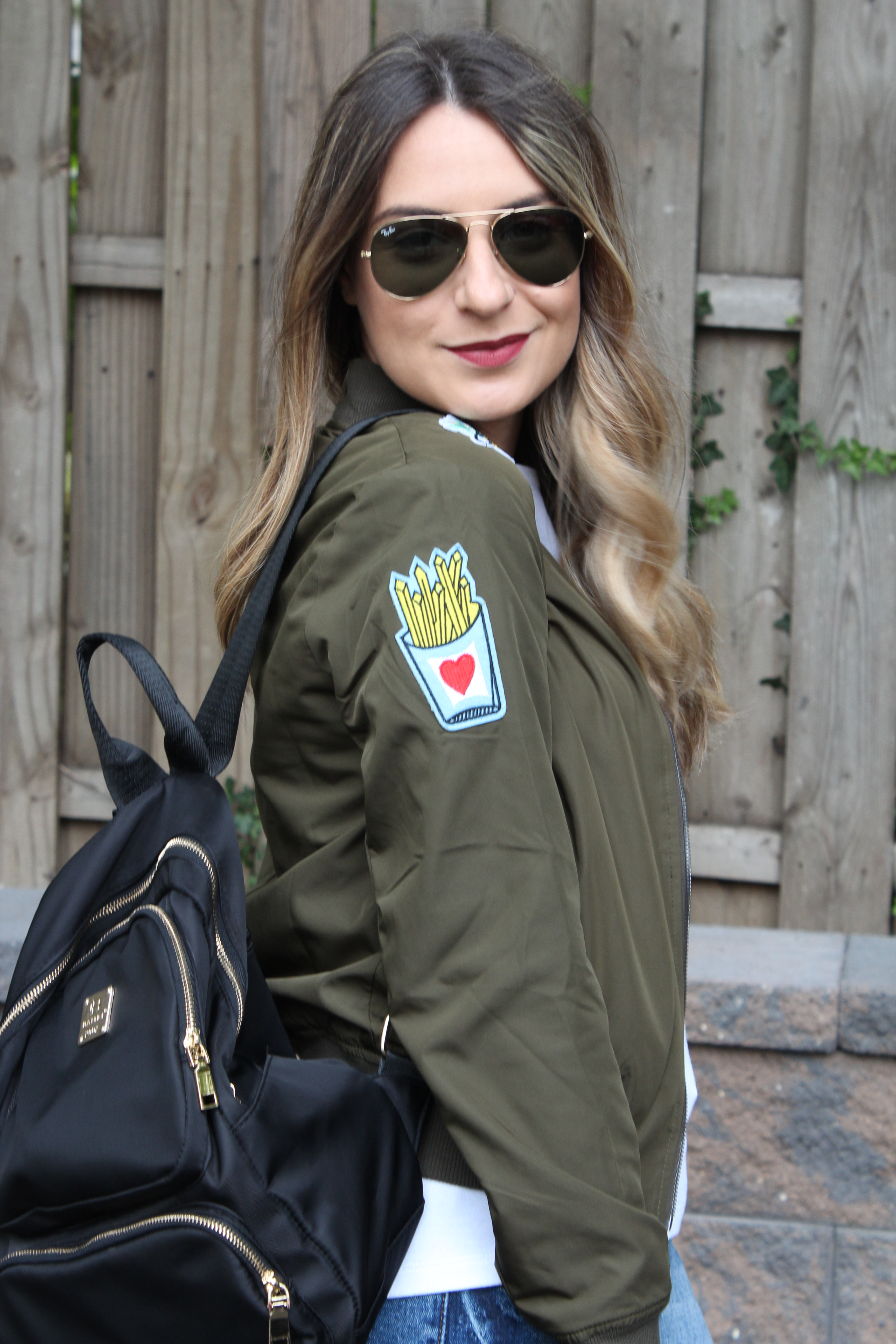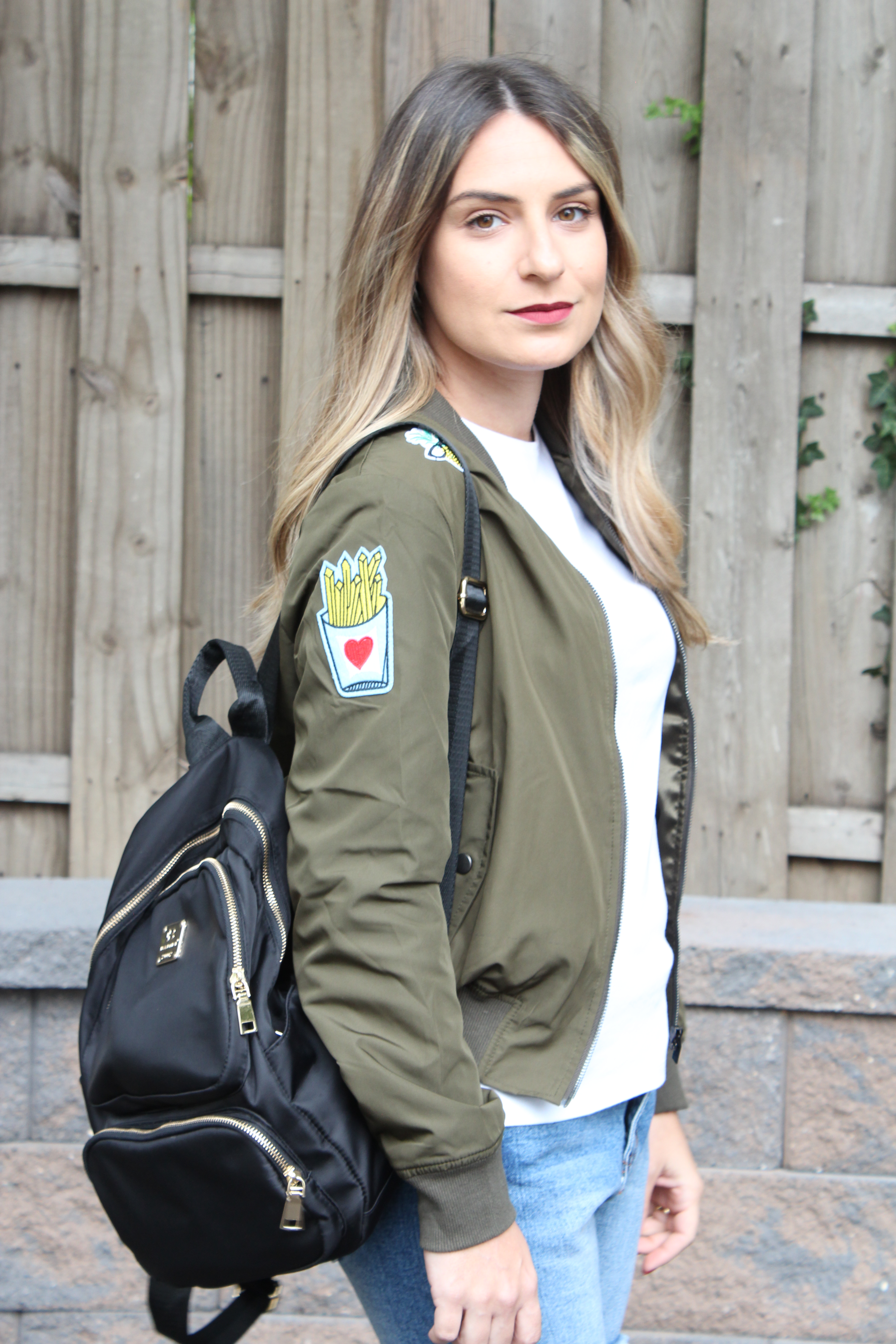 O look de hoje tem um toque especial direto dos anos 90: os patches! Esta tendência esta super em alta, mas ainda não tinha nenhuma peça para chamar de minha ate a Make me Chic me enviar essa jaqueta bomber lindaaaa! Estou amando os modelos bomber, e com patches ficam ainda mais charmosas e divertidas. A cor verde militar também é tendência e fica super legal com looks neutros e casuais. O look de hoje esta bem básico mas cheio de informações de moda! Combinei a bomber com uma t-shirt branca, jeans destroyed, sapatilha espadrille e mini mochila. Vejam só: