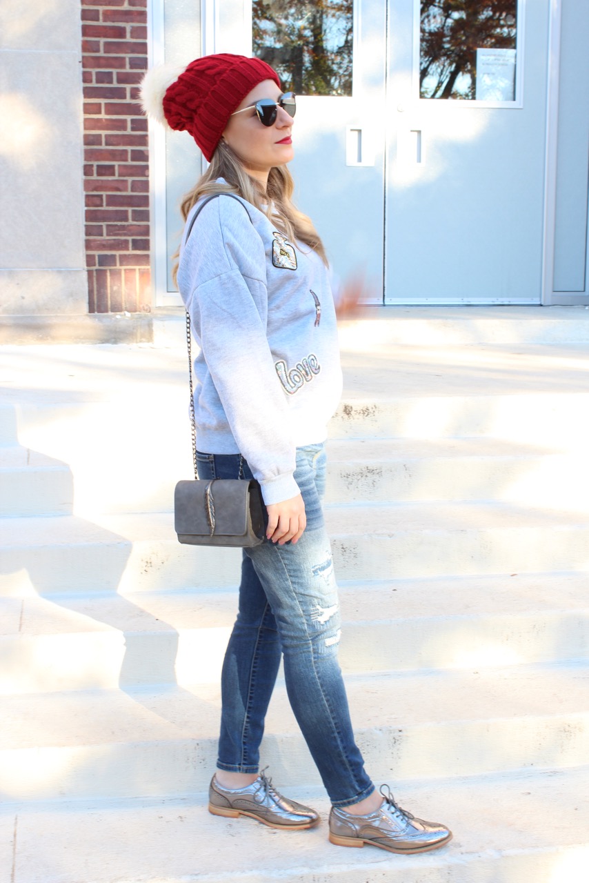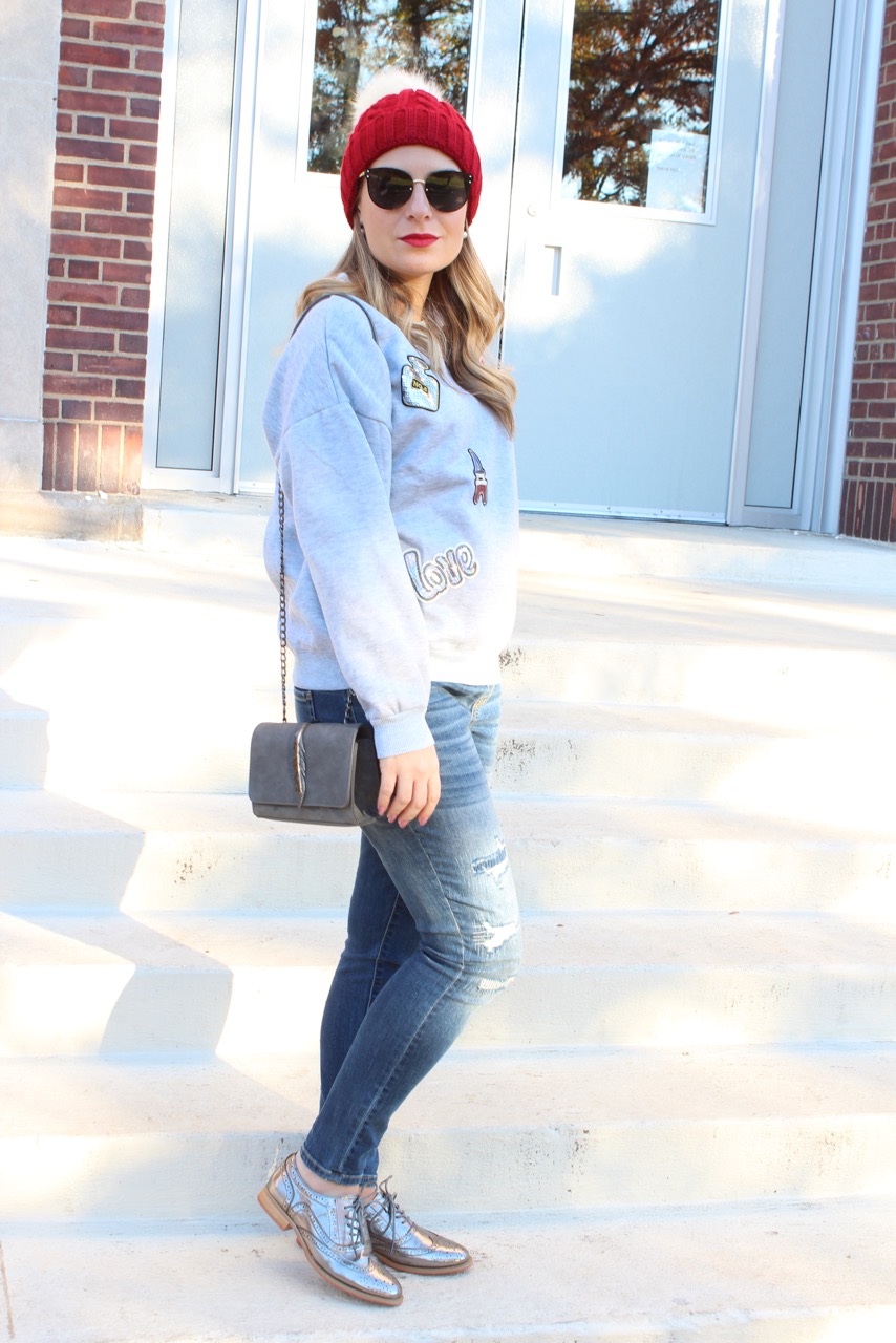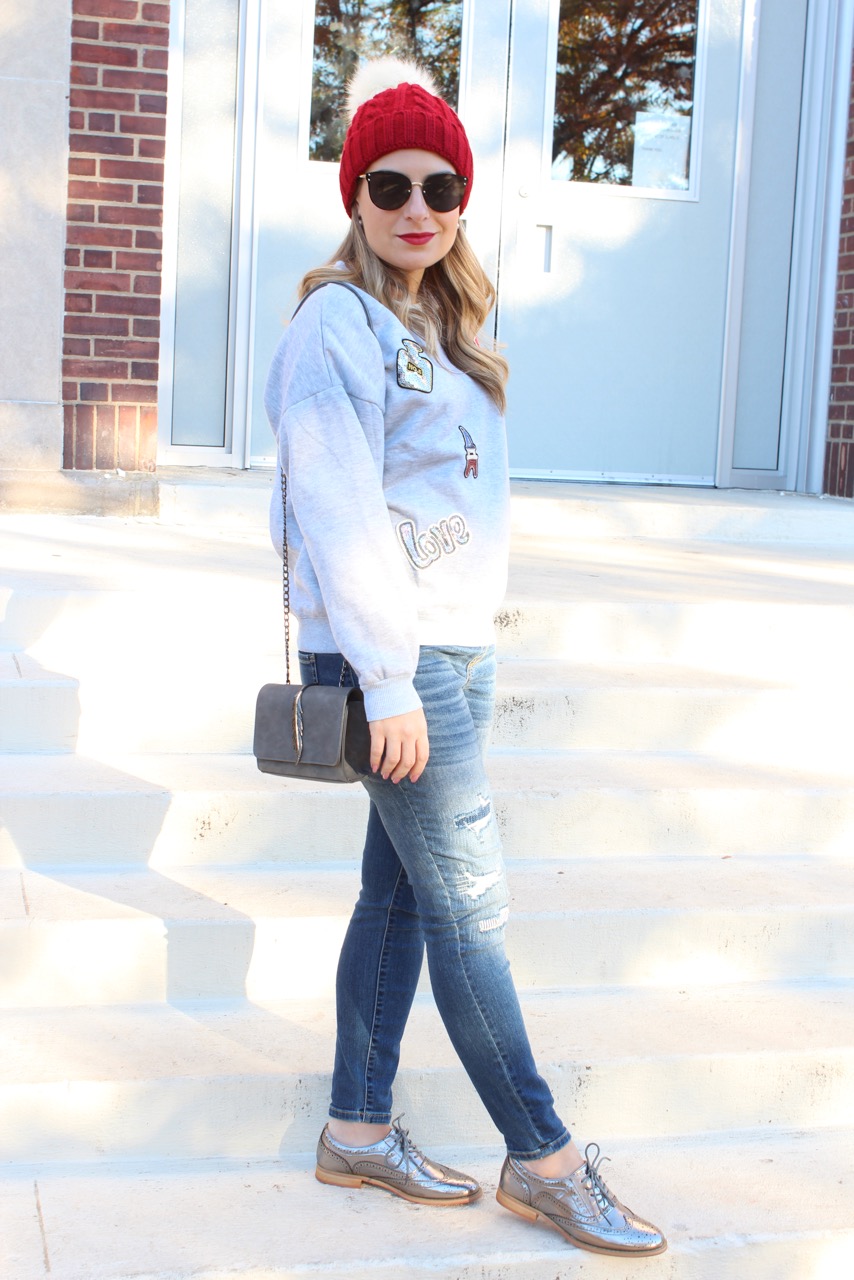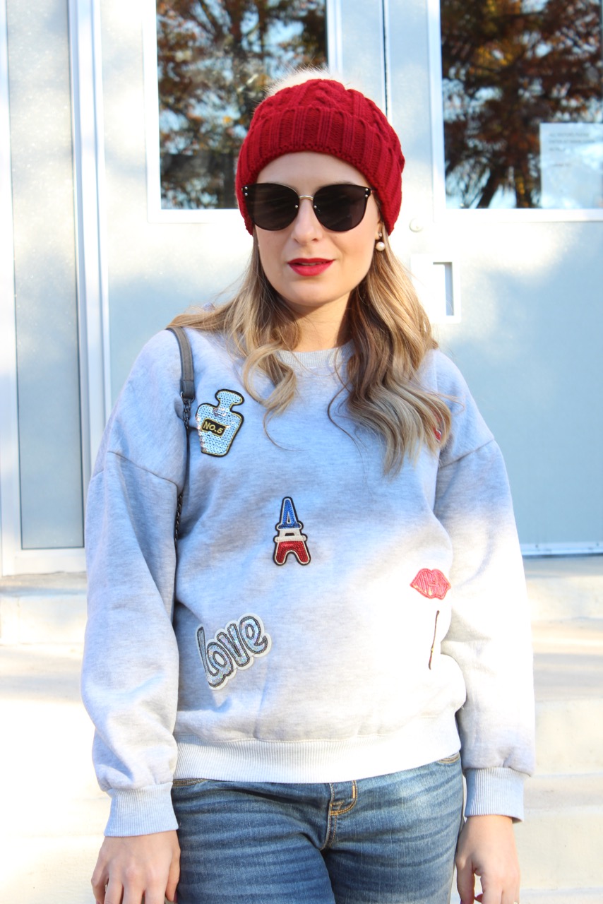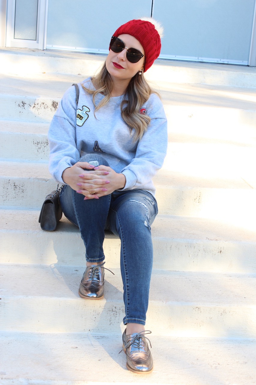 Para essa produção eu combinei várias peças que estão super em alta, mas a peça chave aqui é esse moletom de patches que recebi da Dress Lilly. E para acompanhar essa pegada mais fun e despojada, optei por um jeans maternidade destroyed (quem disse que as gravidinhas também não podem ousar! Haha:) tive que comprar jeans com elástico na cintura pois os meus já não estavam fechando 😂 Outra peça super trendy que escolhi foi o Oxford metalizado. O complemento do look ficou por conta da touca vermelha também da Dress Lilly. O vermelho adicionou um ponto de cor e agregou mais estilo ao look moleton/jeans. Usei uma bolsinha tira colo em cinza e óculos preto da Dress Lilly. Vejam só como ficou: