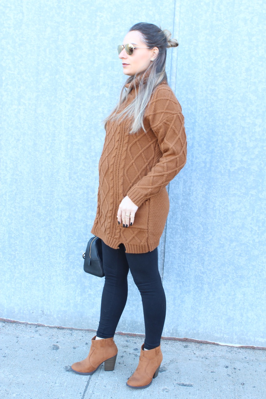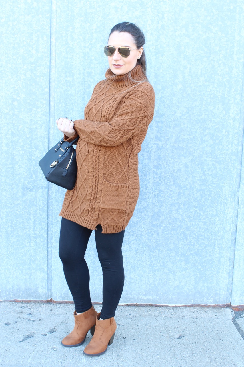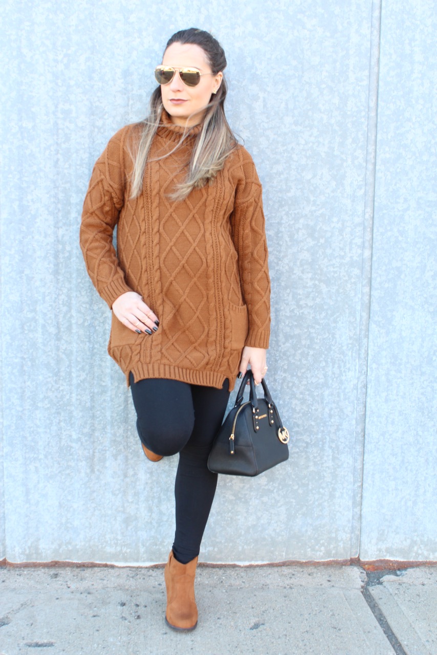 Hoje aqui nos EUA é o cyber Monday, dia ótimo para fazer compras online! Assim como o Black Friday, as lojas online oferecem várias promoções e descontos que valem super a pena! Algumas lojas online que fazem entregam internacional também estão oferecendo várias promoções e uma delas é a Shein, minha loja queiridinha da internet. E o look de hoje é usando uma peça de lá. Como vocês já sabem, os dias estão cada vez mais frios por aqui e a escolha de hoje foi esse vestido suéter de tricô super fofinho e confortável. A cor é um marrom meio mostarda super lindo para essa estação do ano. Combinei com uma legging preta e botinhas de cano baixo. Vejam como ficou: