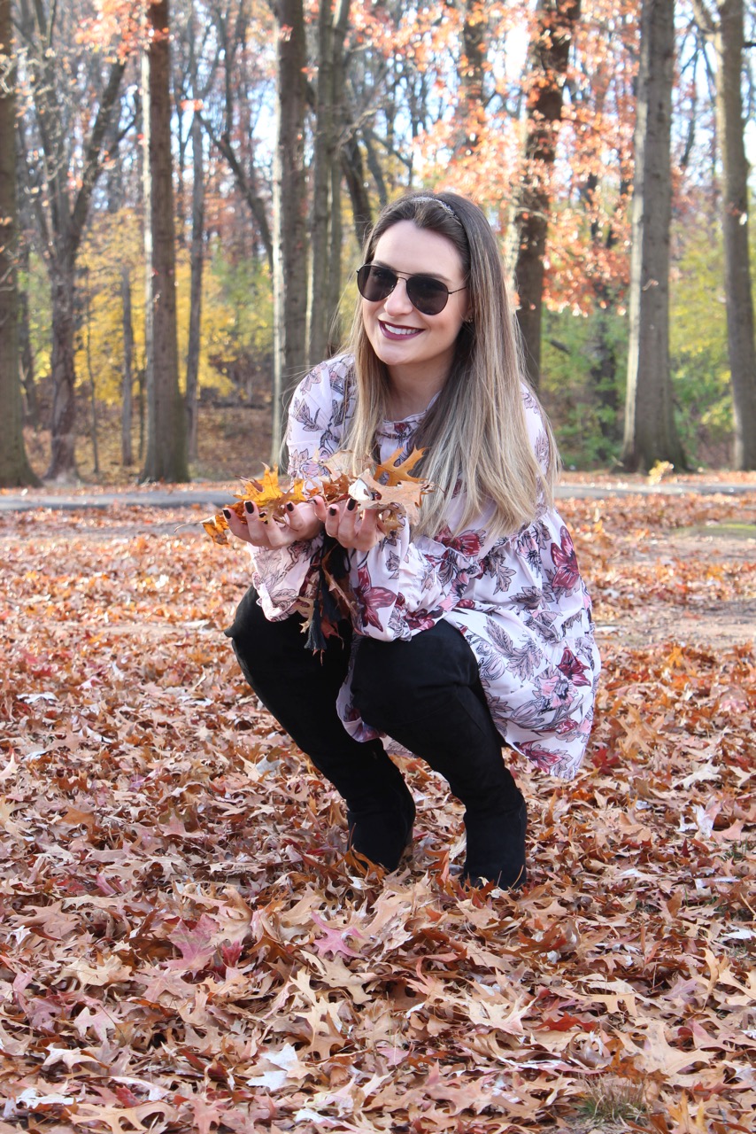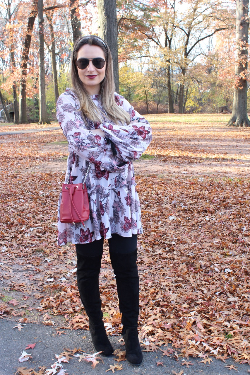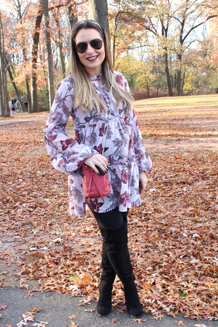 Essa semana estamos com o blog recheado de looks ne! 🙂 Espero que estejam gostando! O look de hoje e super feminino e a minha cara. A peca chave aqui e esse vestido estilo bata da Zaful. A estampa e linda e toda florida com uma das minhas cores favoritas da estacao: o vinho. O modelo e mais soltinho que da para ser usado como vestido mini ou como bata com uma legging que foi a minha escolha para esse look. As mangas sao estilo sino e os babados do vestido dao um charme especial. Combinei com uma bota acima do joelho preta e uma bolsa saco miniatura tambem da Zaful. Aproveitei mais uma vez para tirar fotos no parque antes que a neve cubra essas folhas tao lindas 🙂 Vejam so como ficou:
