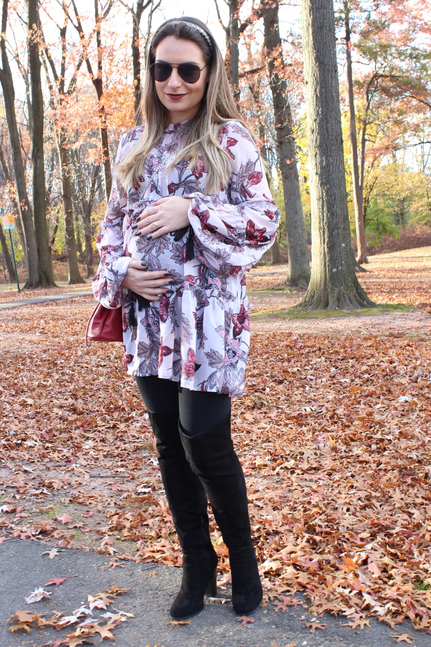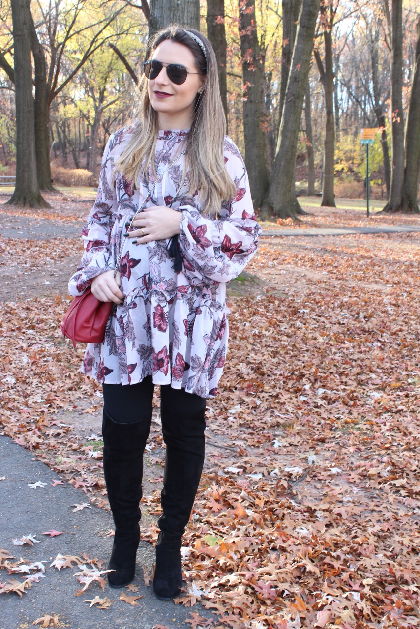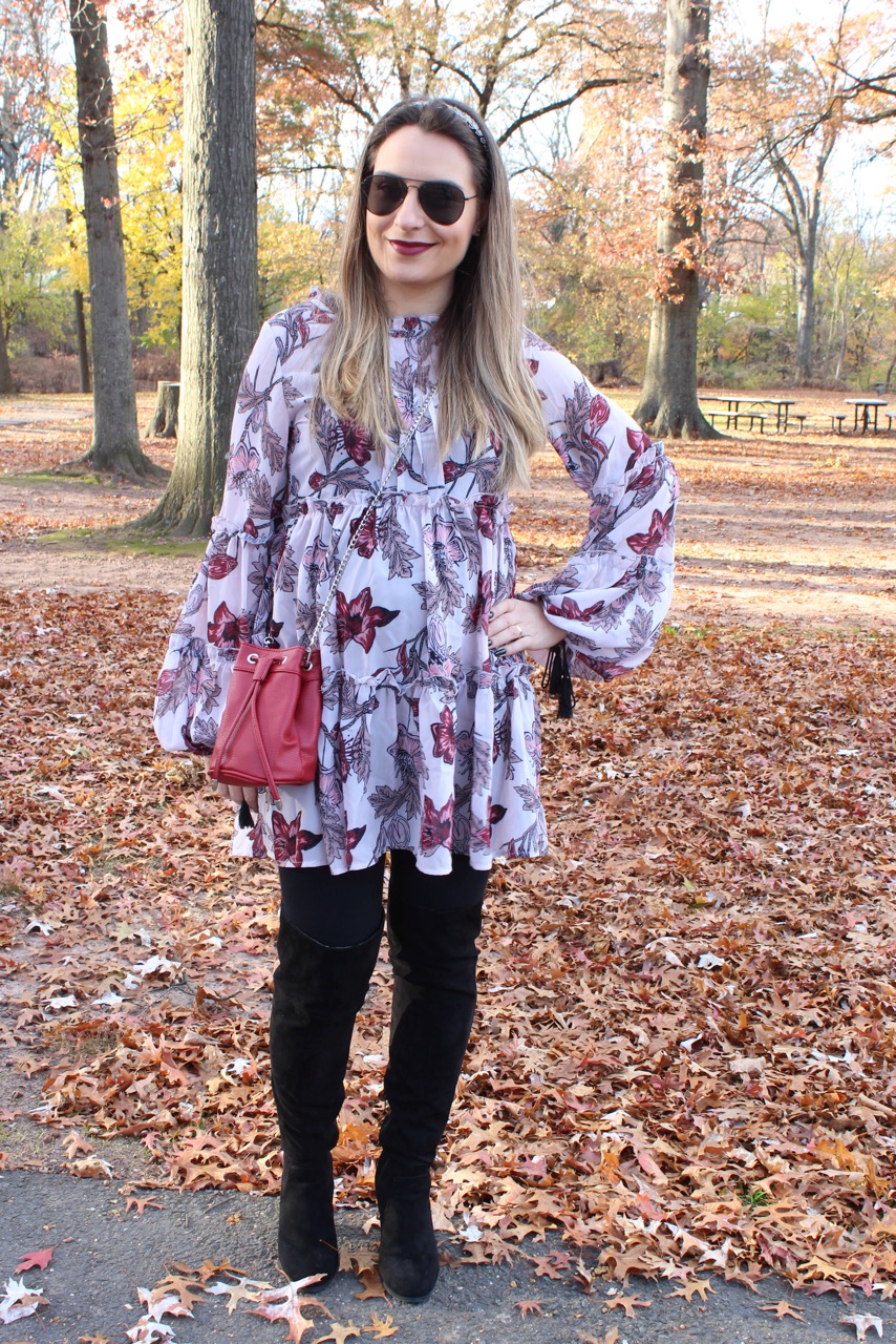 Essa semana estamos com o blog recheado de looks ne! 🙂 Espero que estejam gostando! O look de hoje e super feminino e a minha cara. A peca chave aqui e esse vestido estilo bata da Zaful. A estampa e linda e toda florida com uma das minhas cores favoritas da estacao: o vinho. O modelo e mais soltinho que da para ser usado como vestido mini ou como bata com uma legging que foi a minha escolha para esse look. As mangas sao estilo sino e os babados do vestido dao um charme especial. Combinei com uma bota acima do joelho preta e uma bolsa saco miniatura tambem da Zaful. Aproveitei mais uma vez para tirar fotos no parque antes que a neve cubra essas folhas tao lindas 🙂 Vejam so como ficou: