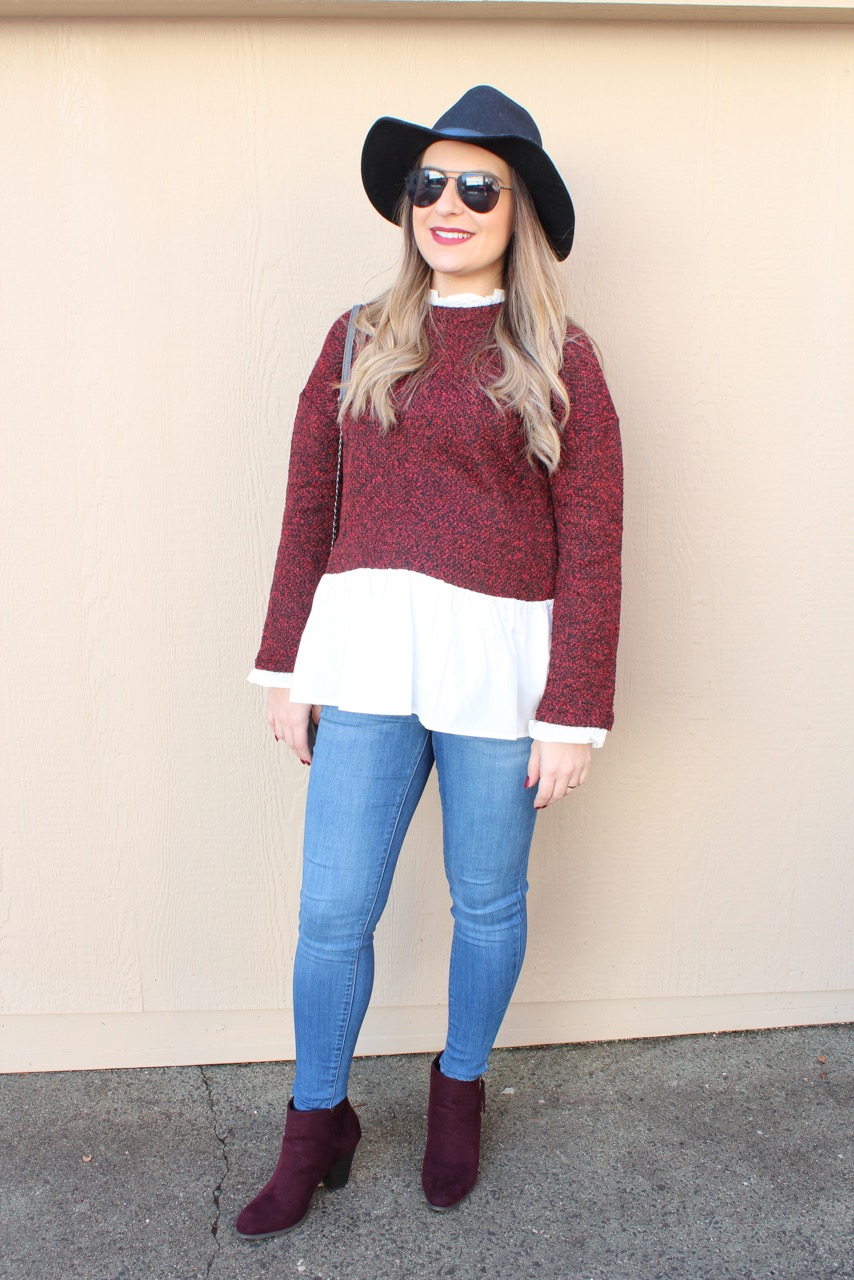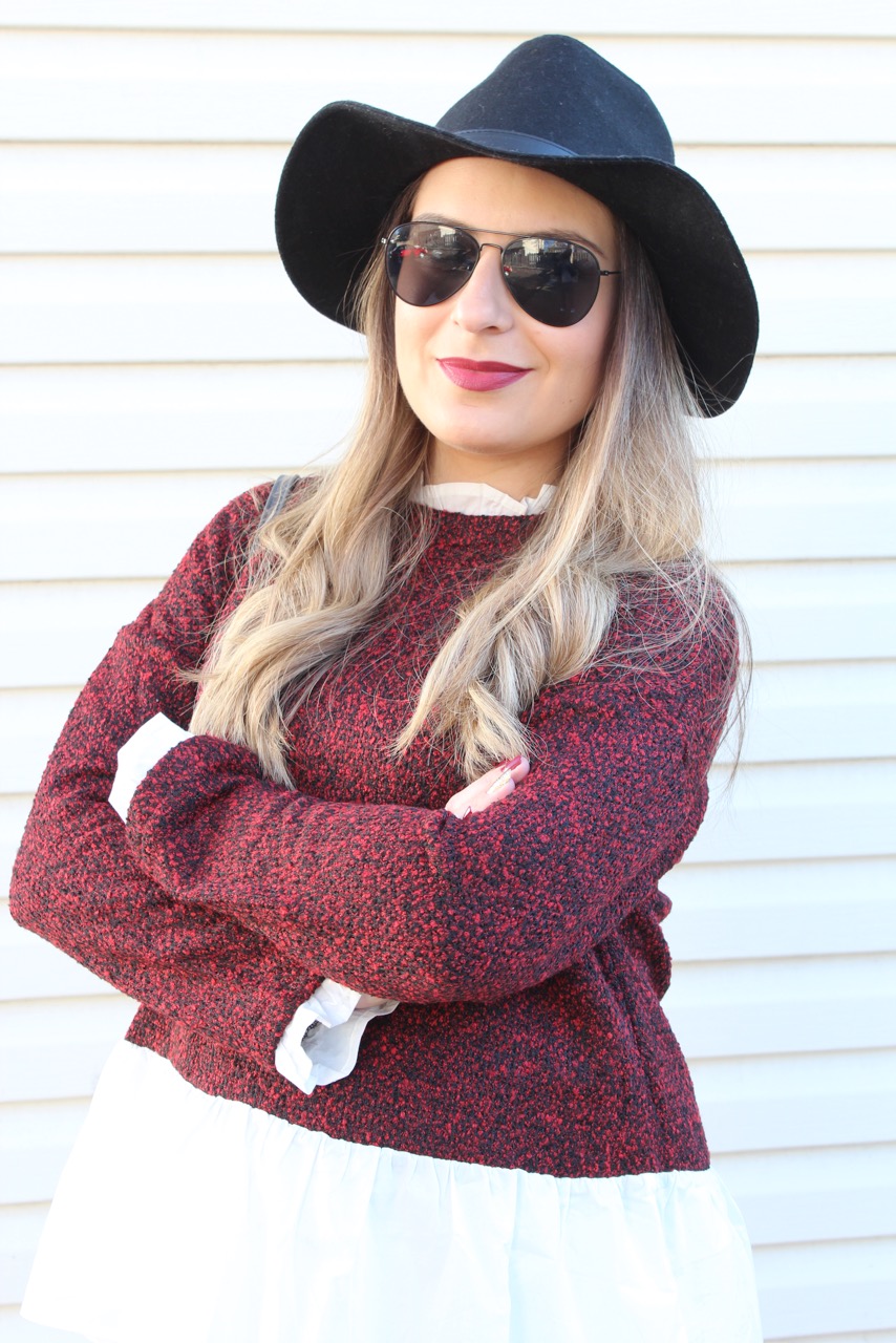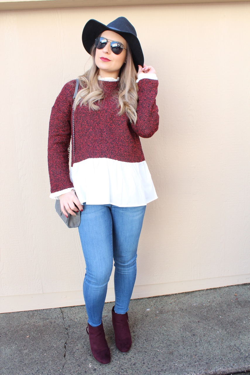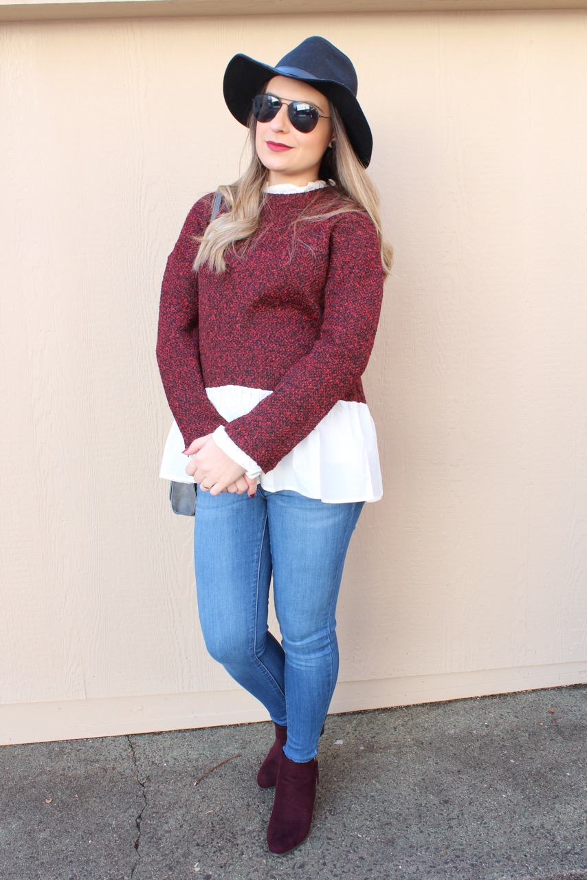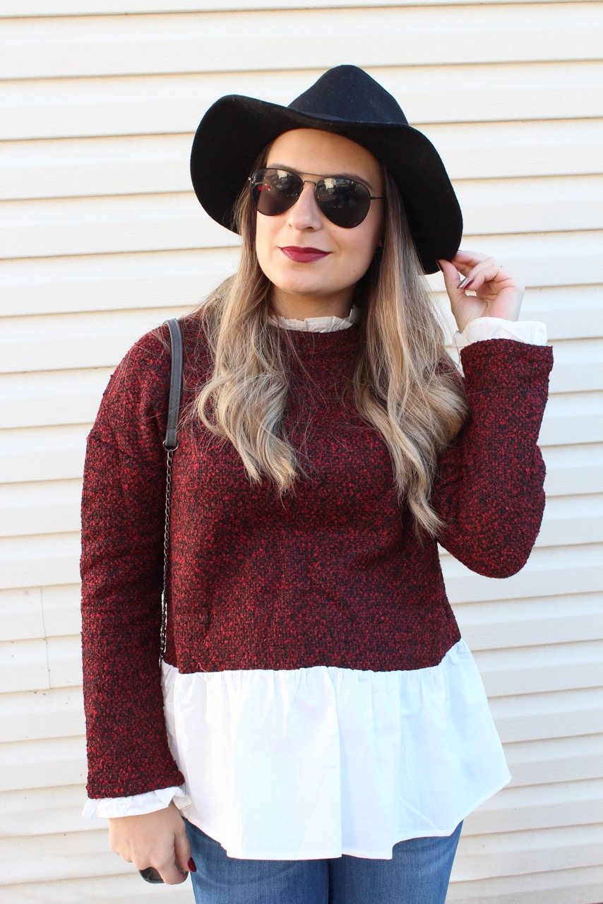 Hoje temos mais um look bem casual com uma tendência que adoro: blusa com a barra e gola de babado. Adoro essa mistura de texturas e o babado branco deixa o look super chic. Esse top da Shein tem o tecido bem grosso e deixou o look mais quentinho. Combinei com um jeans skinny e botinha de cano baixo em vinho (já falei que é a minha cor favorita da estação!? Hahaha) Finalizei com um chapéu preto que deixou a produção mais estilosa. Vejam só: