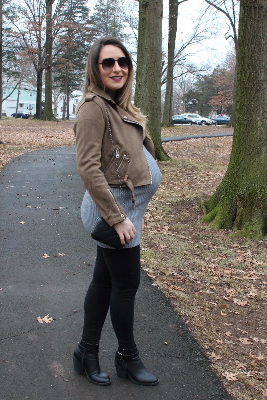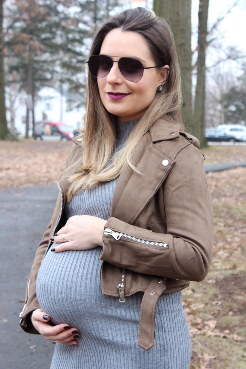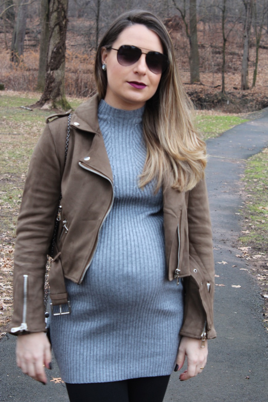 Hoje temos mais um look cheio de estilo! E quem disse que gravida nao pode abusar de uma tendencia tambem!? hahaha Eu estava louca atras de uma jaquetinha estilo biker de camurca, mas nao sabia se ia server com o barigon 🙂 Entao resolvi colocar um vestido sueter mais justinho que recebi da Sammy Dress com leggings e a jaquetinha de camurca por cima sem fechar o zipper! Finalizei com botinha de cano baixo que deixou o look mais despojado. O cinza com marrom esta super em alta e deixa a producao bem classica e elegante. Vejam como ficou: