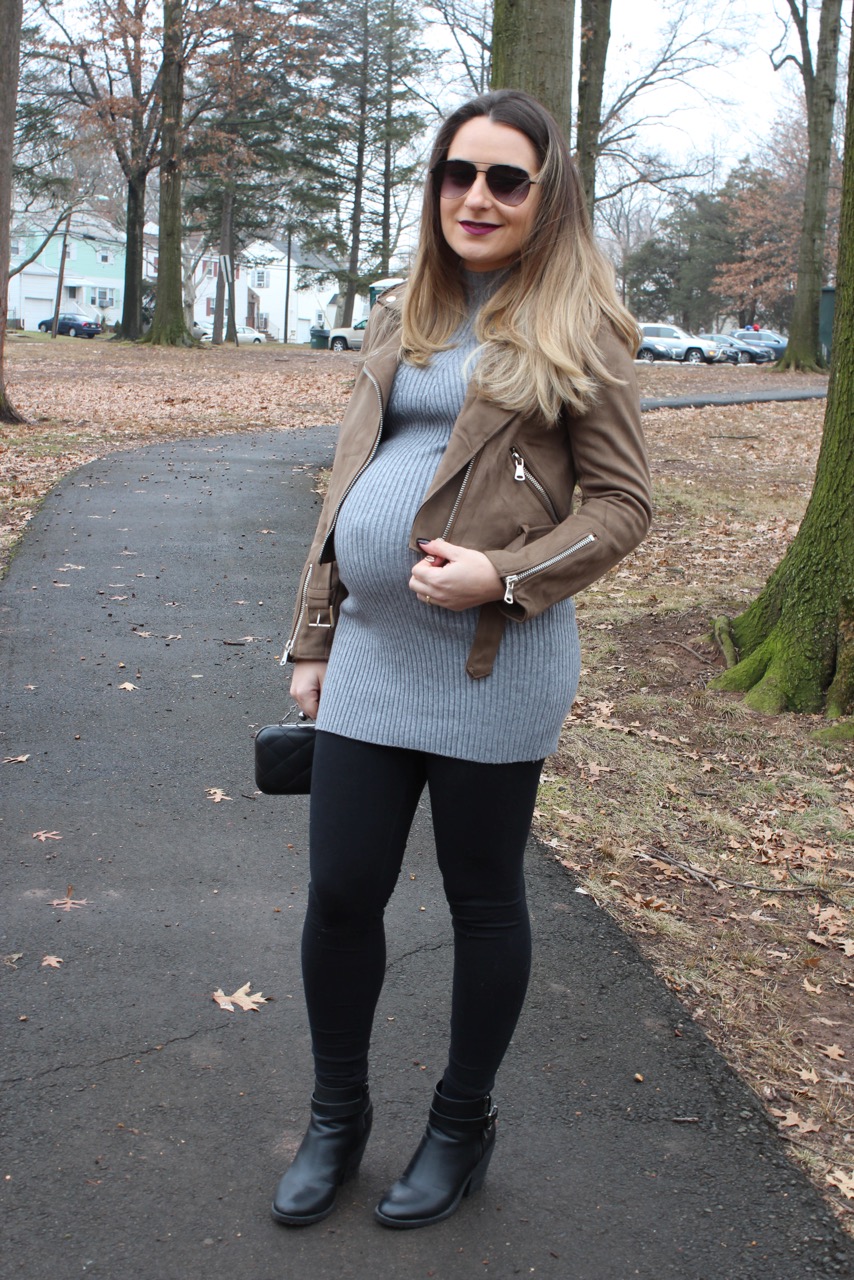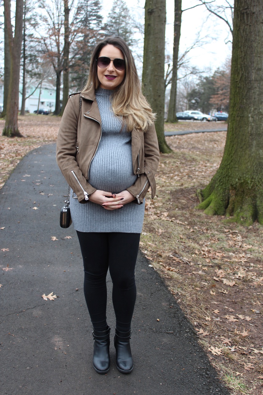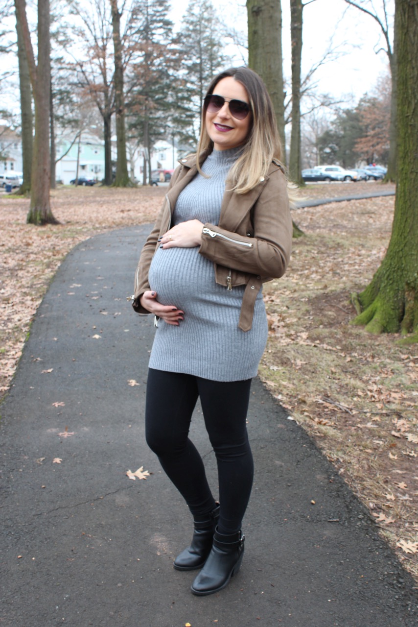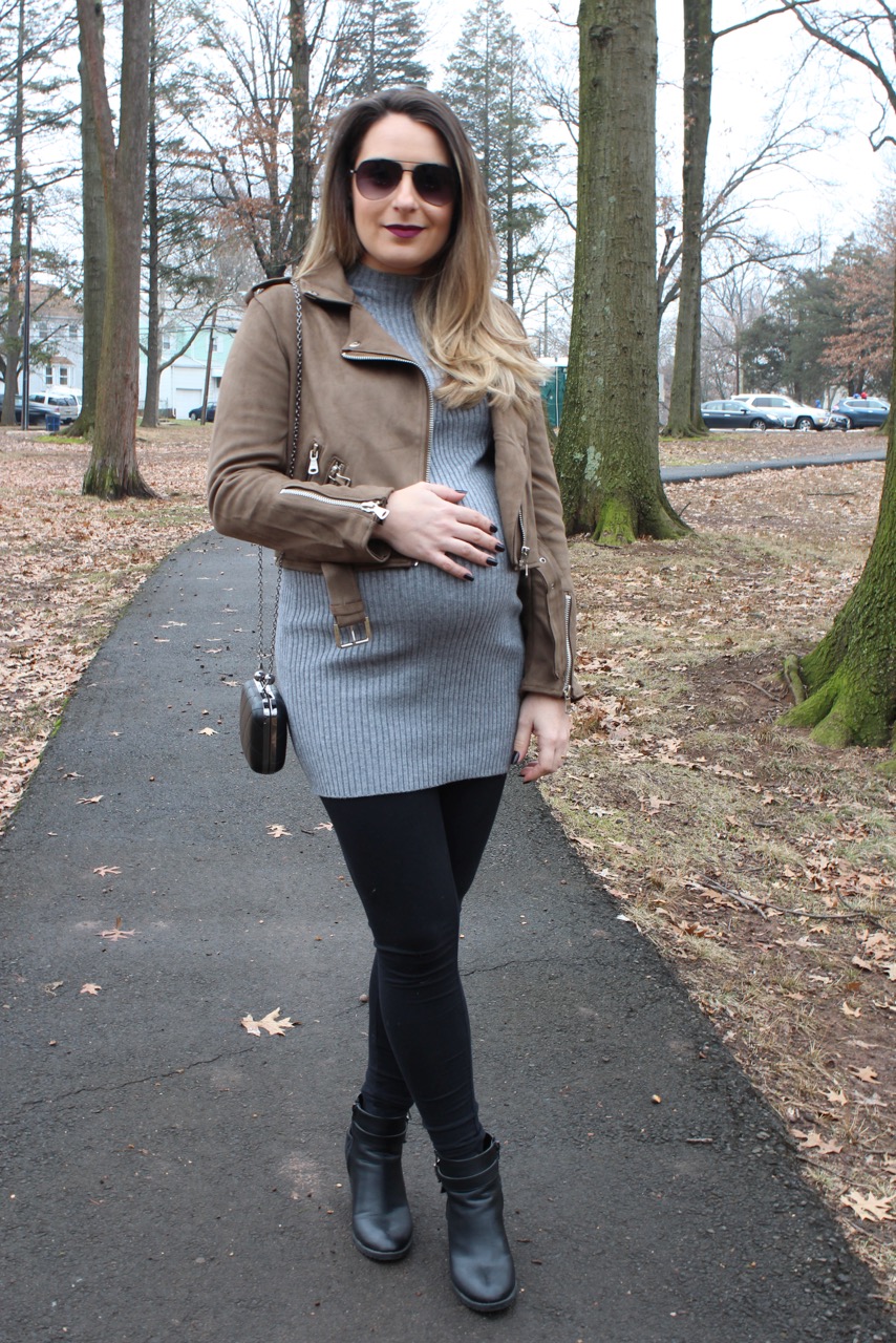 Hoje temos mais um look cheio de estilo! E quem disse que gravida nao pode abusar de uma tendencia tambem!? hahaha Eu estava louca atras de uma jaquetinha estilo biker de camurca, mas nao sabia se ia server com o barigon 🙂 Entao resolvi colocar um vestido sueter mais justinho que recebi da Sammy Dress com leggings e a jaquetinha de camurca por cima sem fechar o zipper! Finalizei com botinha de cano baixo que deixou o look mais despojado. O cinza com marrom esta super em alta e deixa a producao bem classica e elegante. Vejam como ficou: