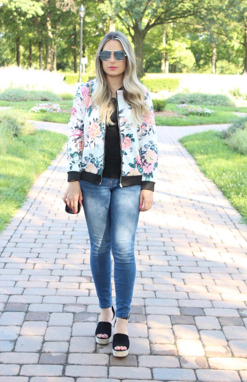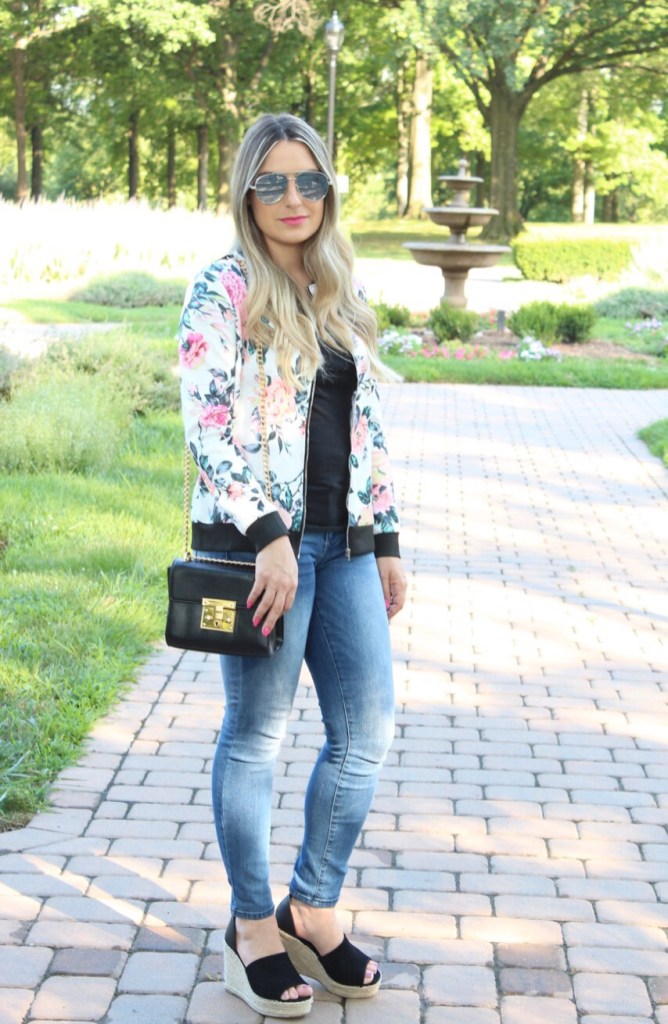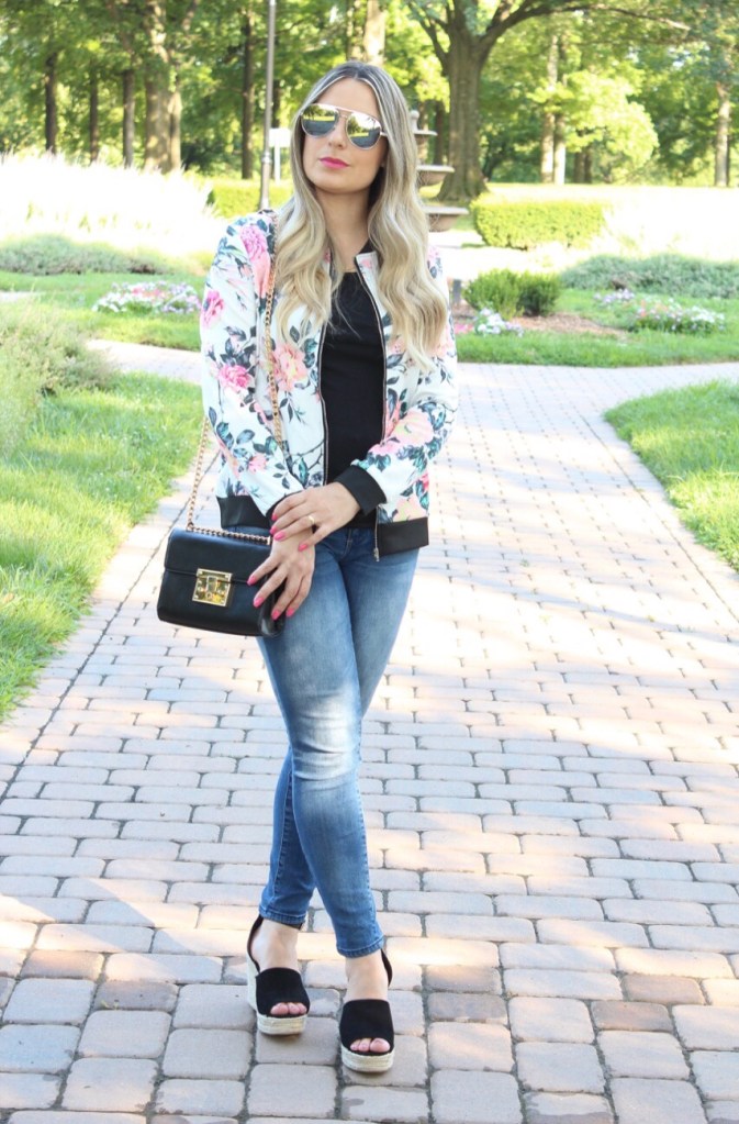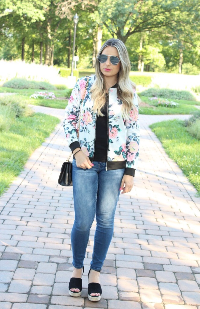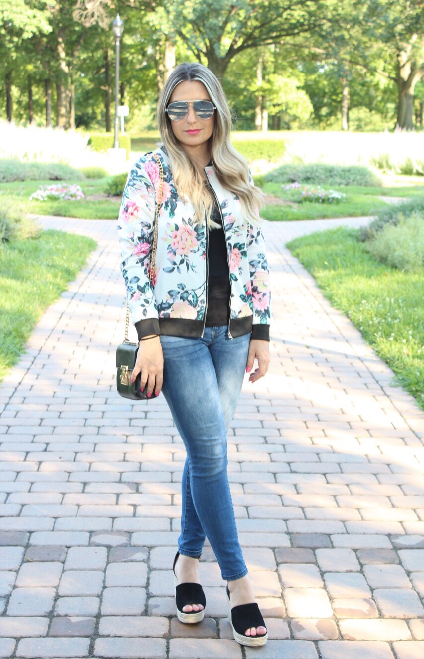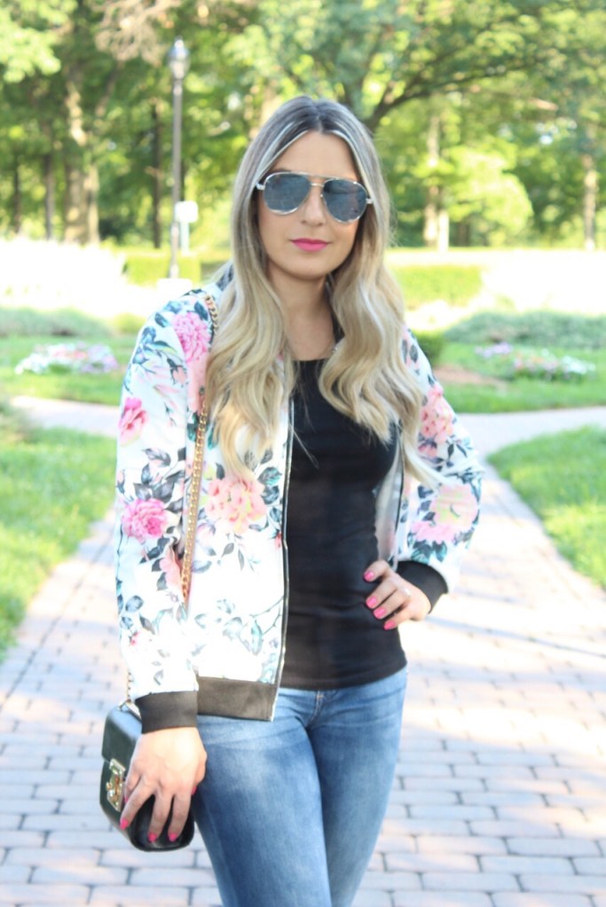 Estamos em meio ao verão super quente aqui do norte dos EUA, porem ontem choveu bastante pela manha e a tarde ficou super fresquinho. Estava o tempo perfeito para uma jaquetinha fina mais leve. Fomos dar um passeio com Gabriel e aproveitei para fotografar o look bem casual e simples: calça jeans com camiseta preta e adicionei a jaqueta bomber floral para compor o look. A jaqueta bomber ressurgiu na ultima estação e vem ganhando novos cortes e estampas prometendo ser a queridinha do seu guarda roupa. Eu adoro esse estilo de jaqueta com jeans, com vestidinhos e ate mesmo com legging e tênis. O look de hoje coloquei uma plataforma super confortável que deixou o look mais “arrumadinho”. Vejam como ficou: