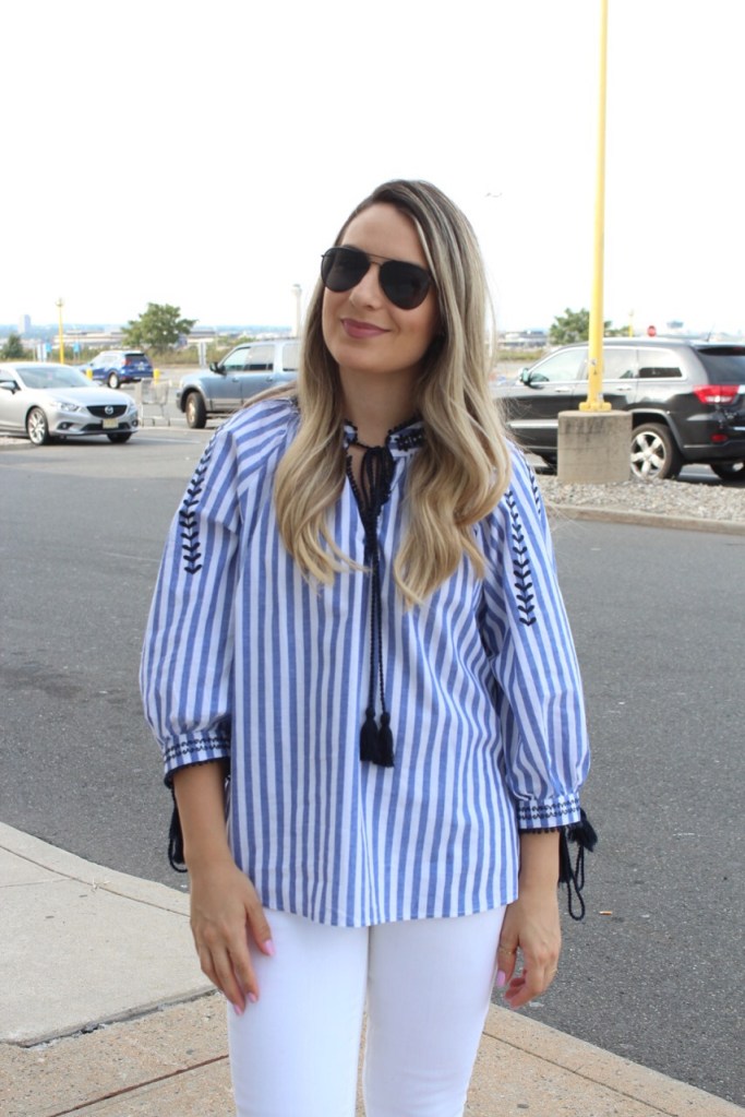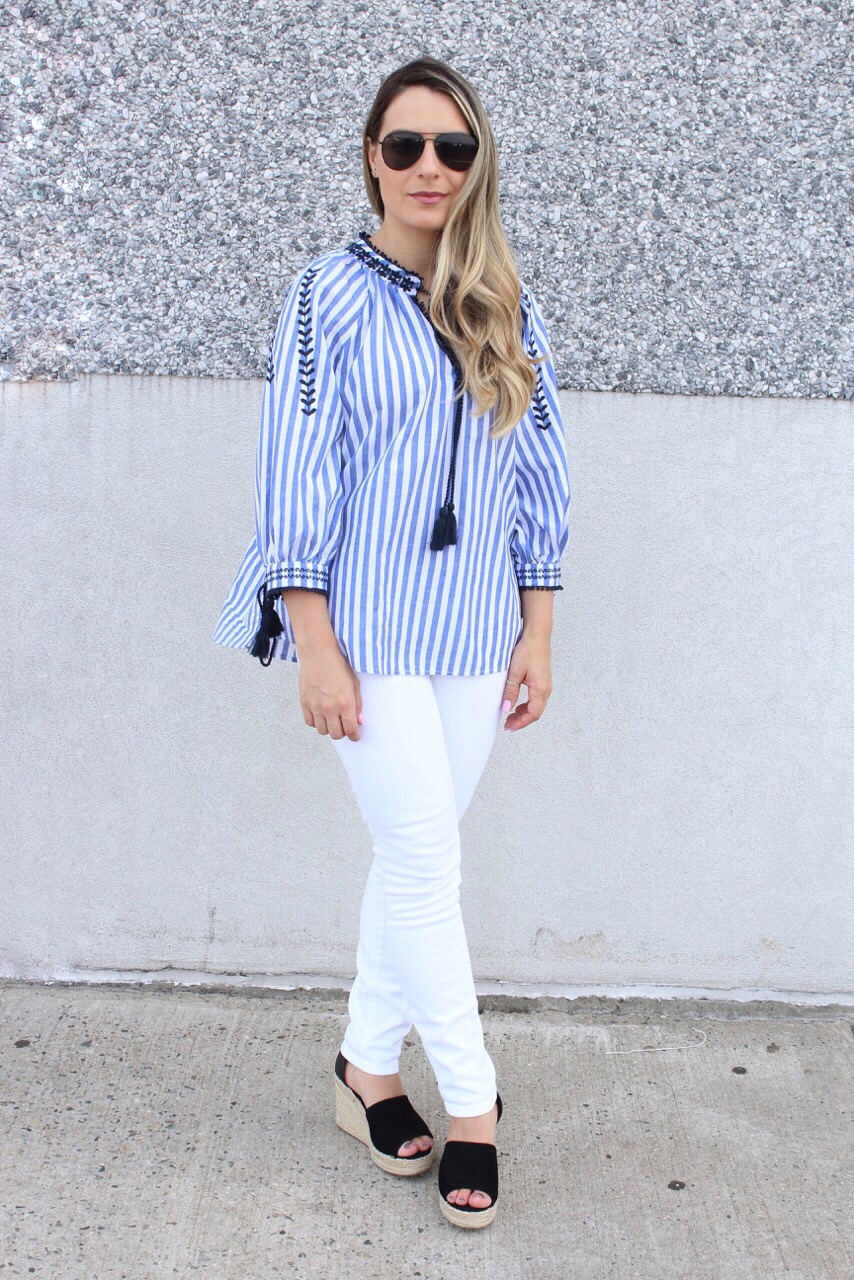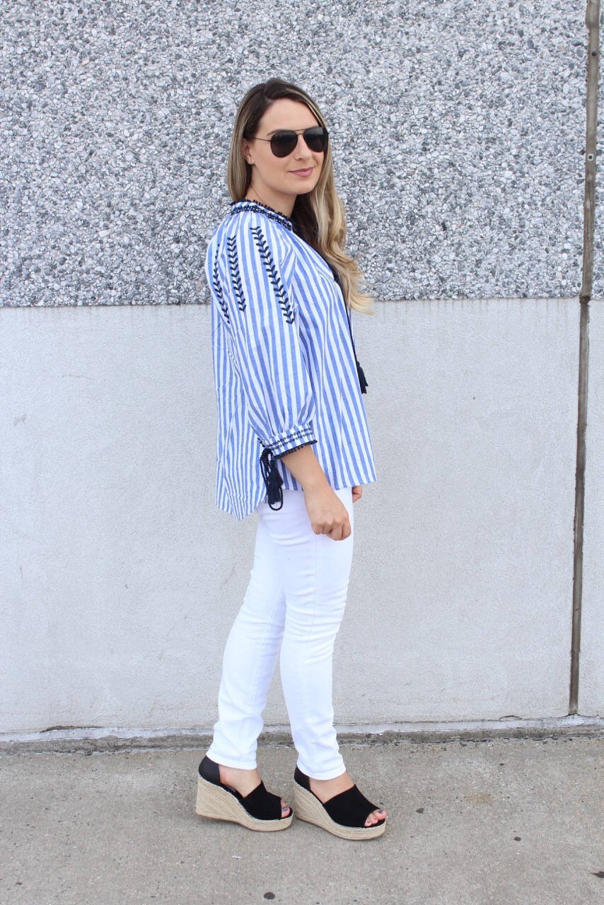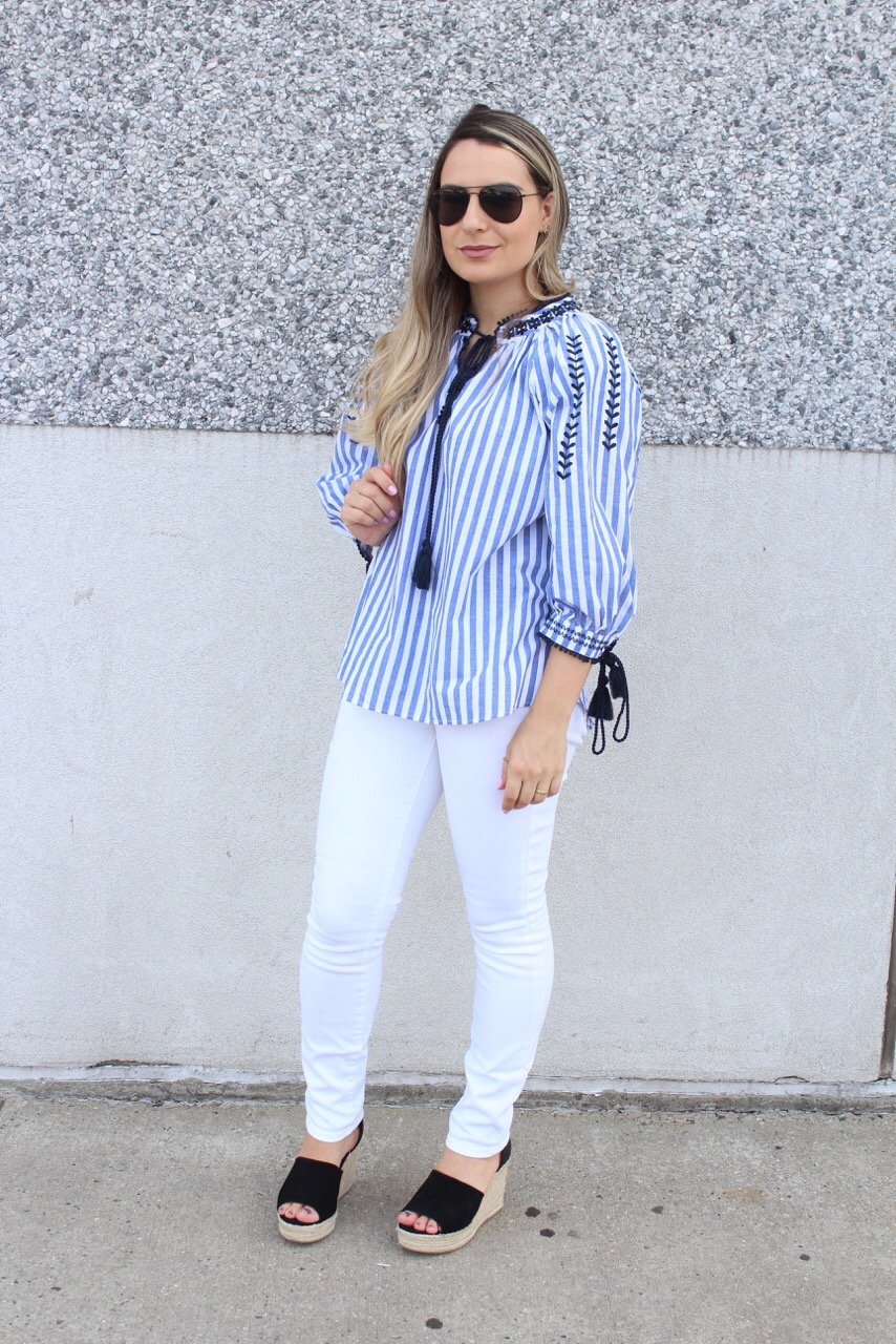 Hoje saímos para comprar a cadeirinha de comer do Gabriel. Daqui umas semaninhas ele completa 6 meses e ja vamos começar a introduzir os alimentos sólidos. Talvez eu ate comece com uma bananinha ainda essa semana hehe 🙂 E hoje deu tempo de clicar o look do dia e ja aproveitar para postar e mostrar para vocês. Ultimamente estou adorando usar batas e estou apaixonada nessa bata listrada com detalhes bordados da Shein. Combinei com uma calça jeans branca e sandália plataforma preta. Vejam como ficou.