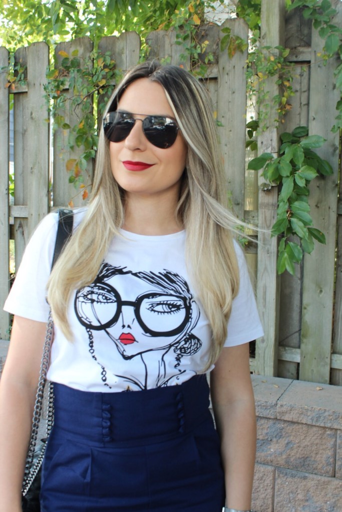 Hoje temos mais um lookzinho básico e super descolado. Apostei em uma calça alfaiataria de cintura alta com T-shirt gráfica ambas da Shein. Produção bem inusitada mas que deu super certo! Ja foi o tempo em que calças mais formais ou de tecido de alfaiataria eram usadas somente em ambientes de trabalho ou para ocasiões formais. Hoje em dia, esta cada vez mais popular misturar peças basiquinhas tipo t-shirt com peças formais. Coloquei um sandália bem simples de tirinha e apostei no batom vermelho combinando com a camiseta 🙂 Vejam como ficou: