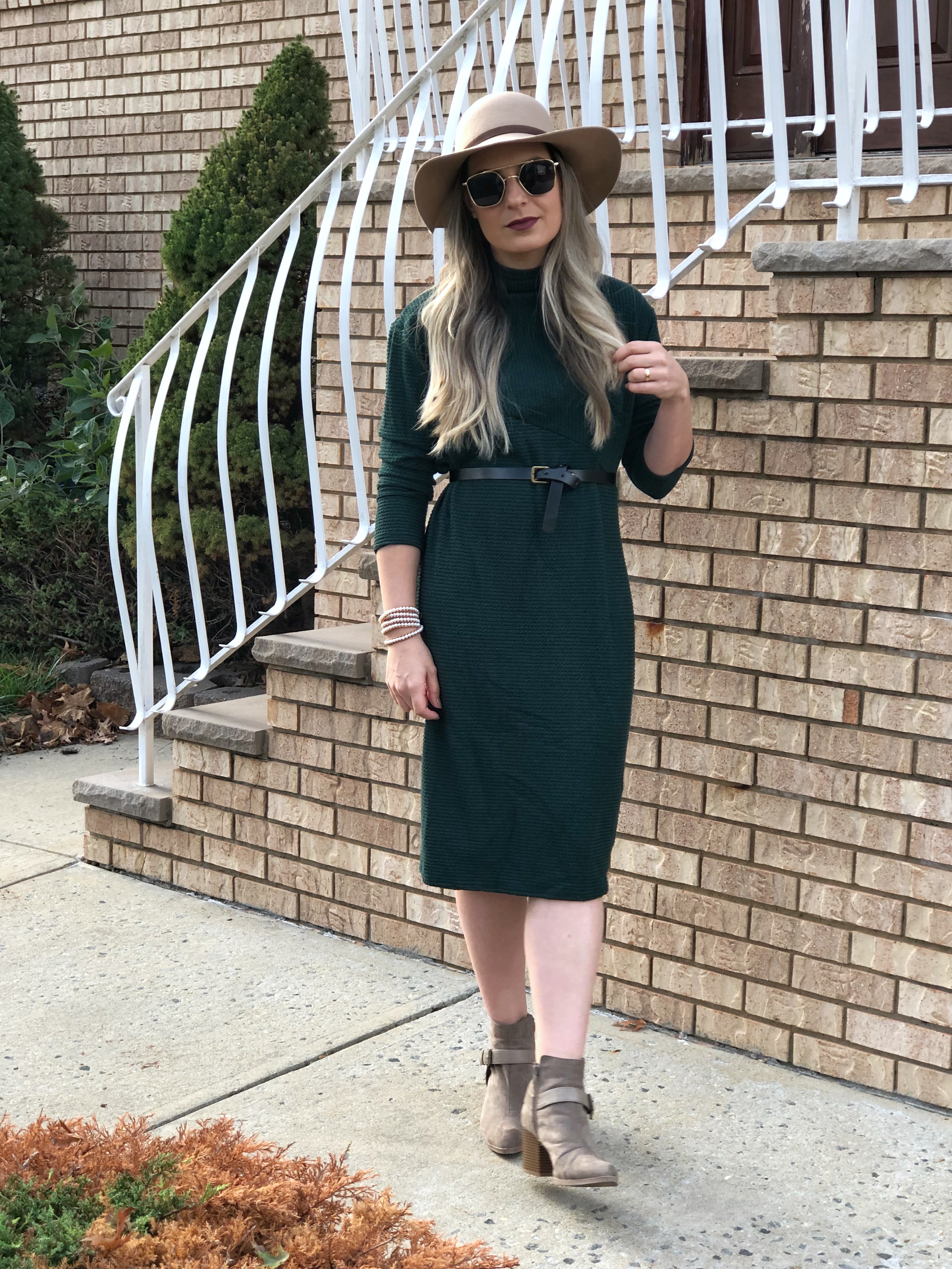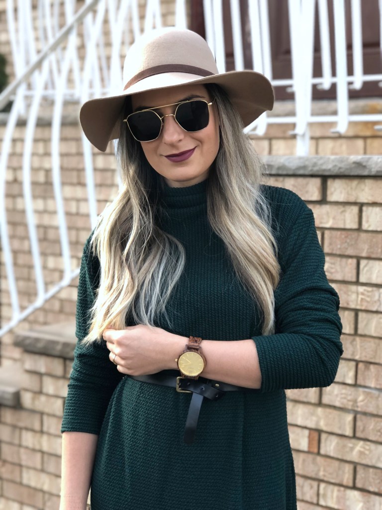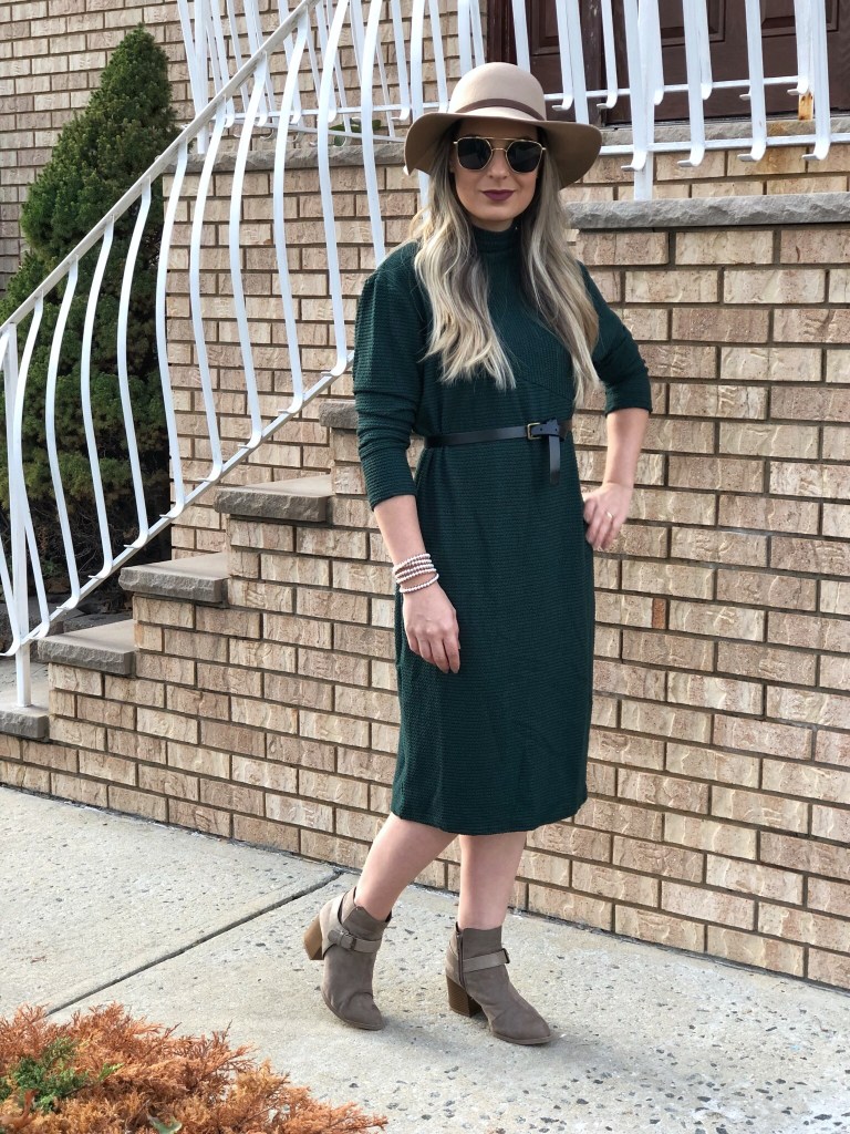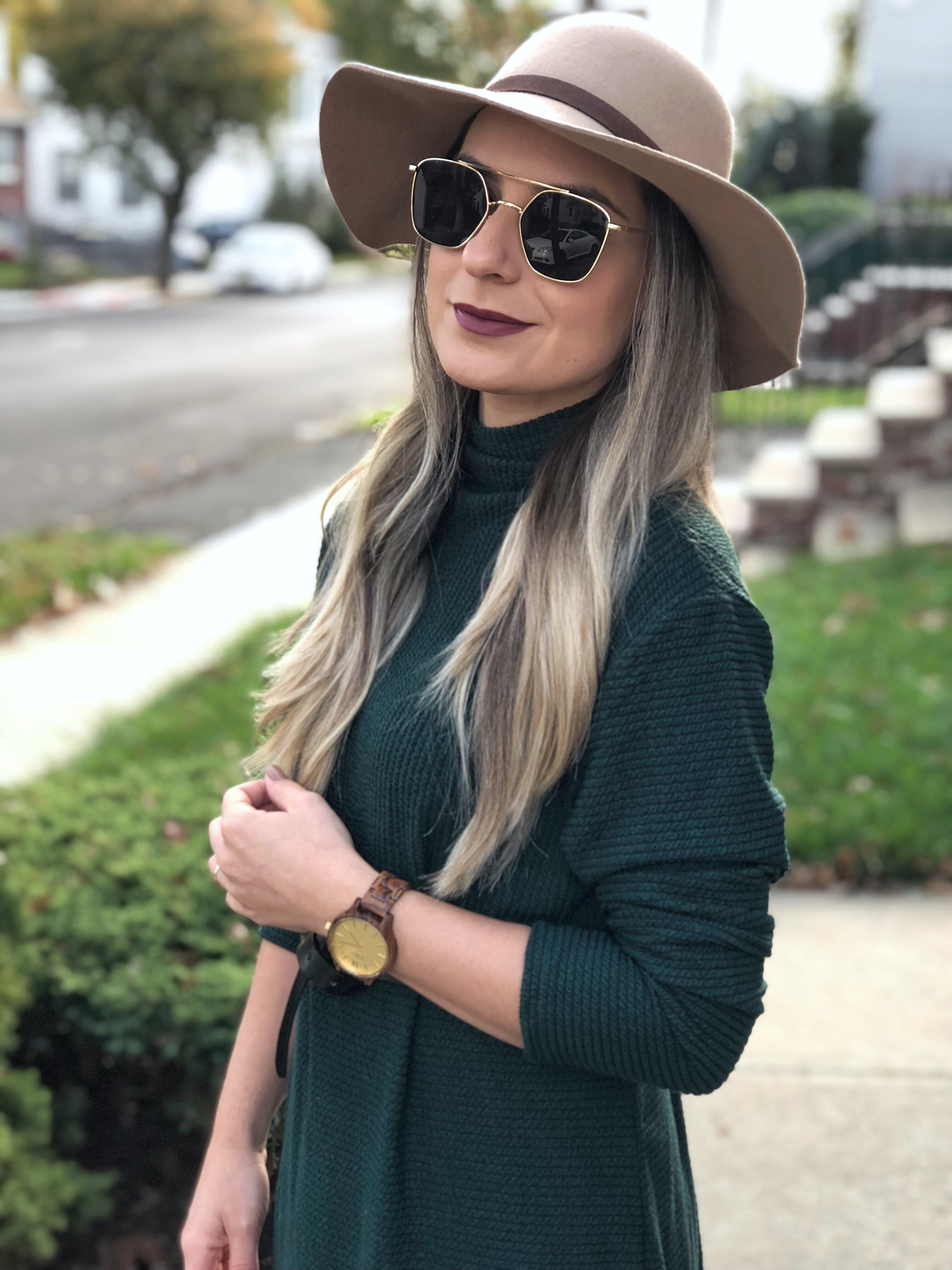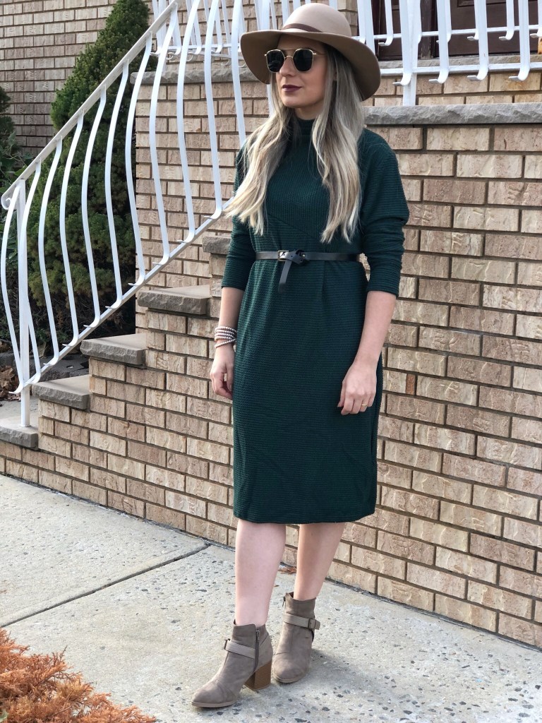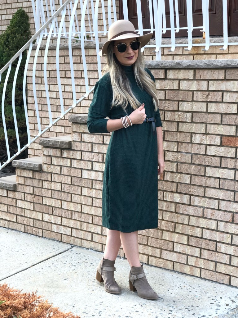 Como foi o final de semana de vocês? Ontem acabou o horário de verão aqui nos EUA e agora estamos com 3 horas de diferença do Brasil. Agora os dias começam a ficar mais frios… e o inverno chegando logo logo! Enquanto a neve não chega, hehe 🙂 aproveito para fotografar uns looks de outono, estação que eu mais gosto para looks do dia. E o look de hoje esta super fashionista combinando vários trends dessa estação. O vestido midi na altura do joelho é DressLily, na cor verde esmeralda e com gola alta é um modelo super tendência do momento. Adoro esse verde escuro com acessórios nudes e caramelo. Combinei com uma botinha de cano baixo, chapéu e cinto para deixar o vestido mais acinturado. Vejam como ficou: