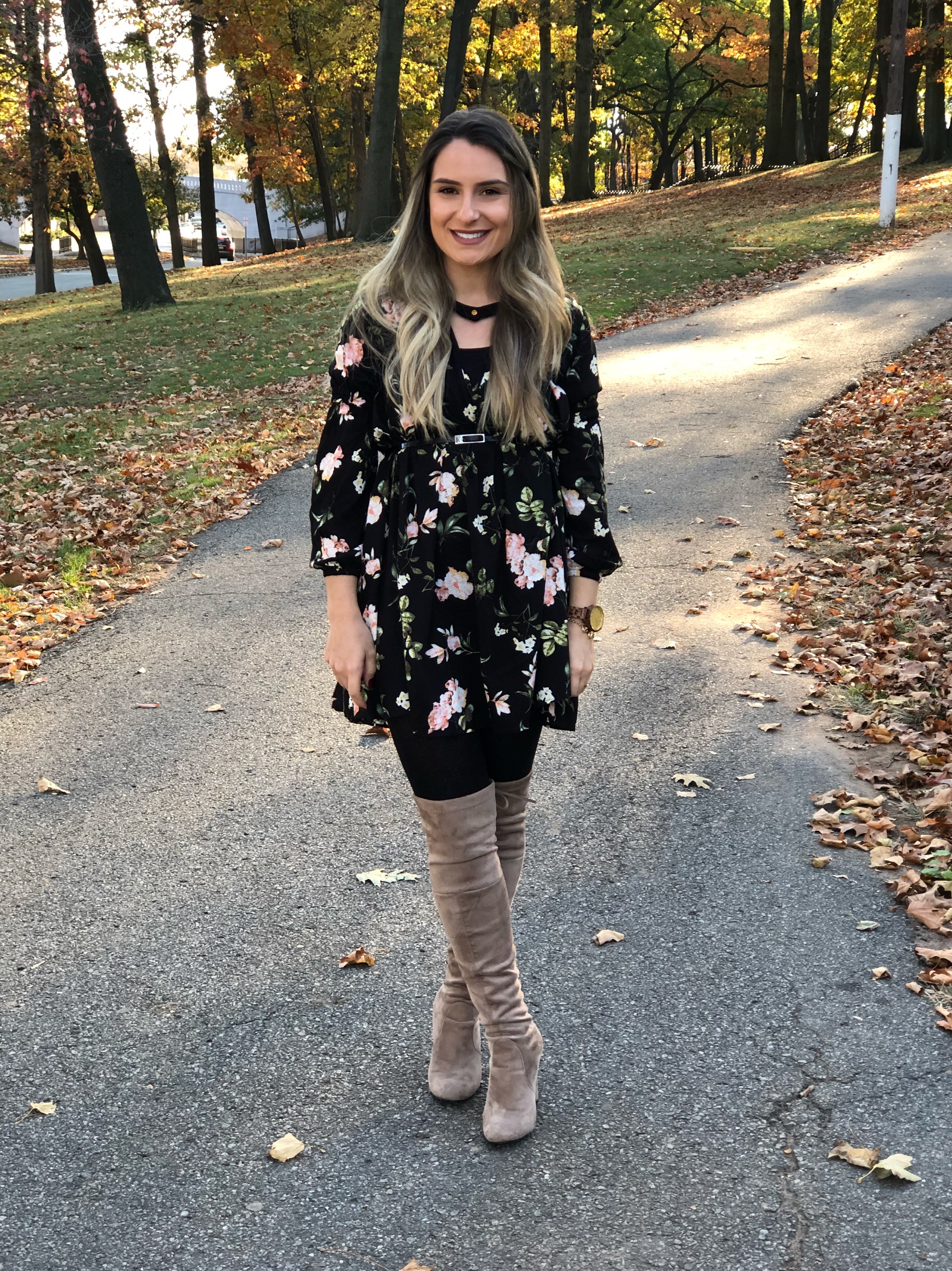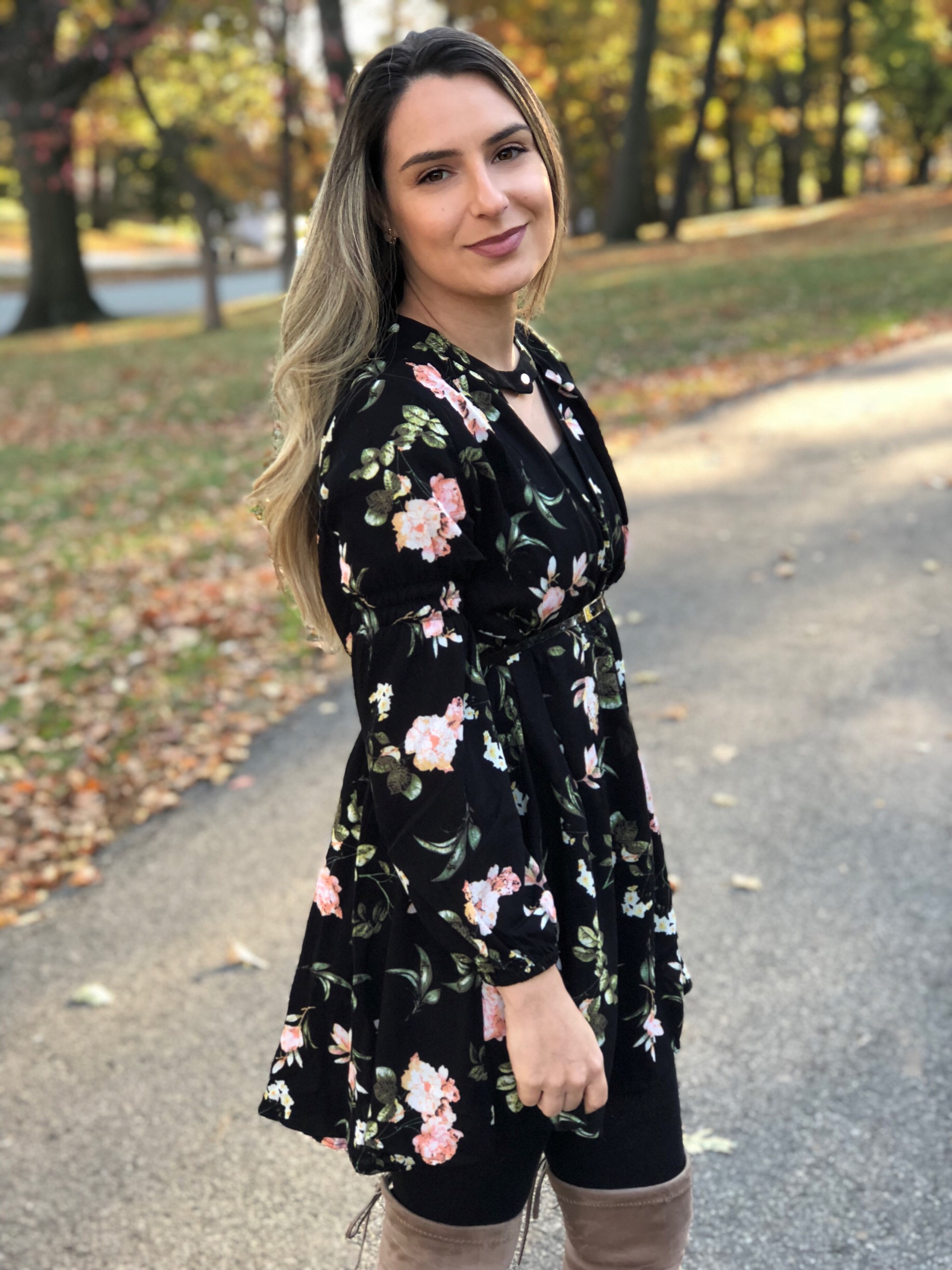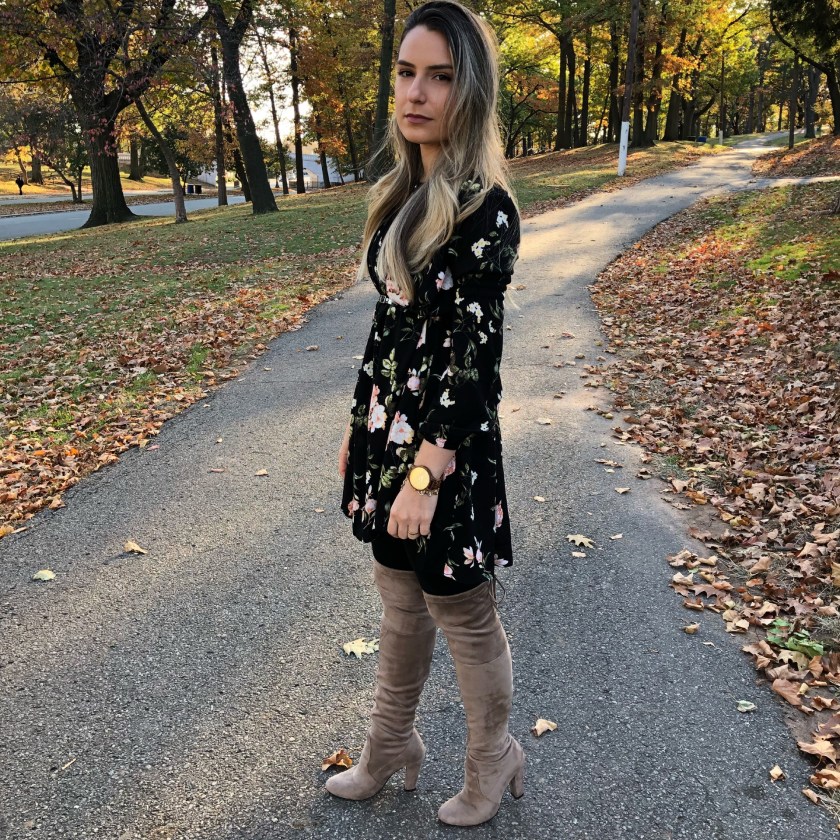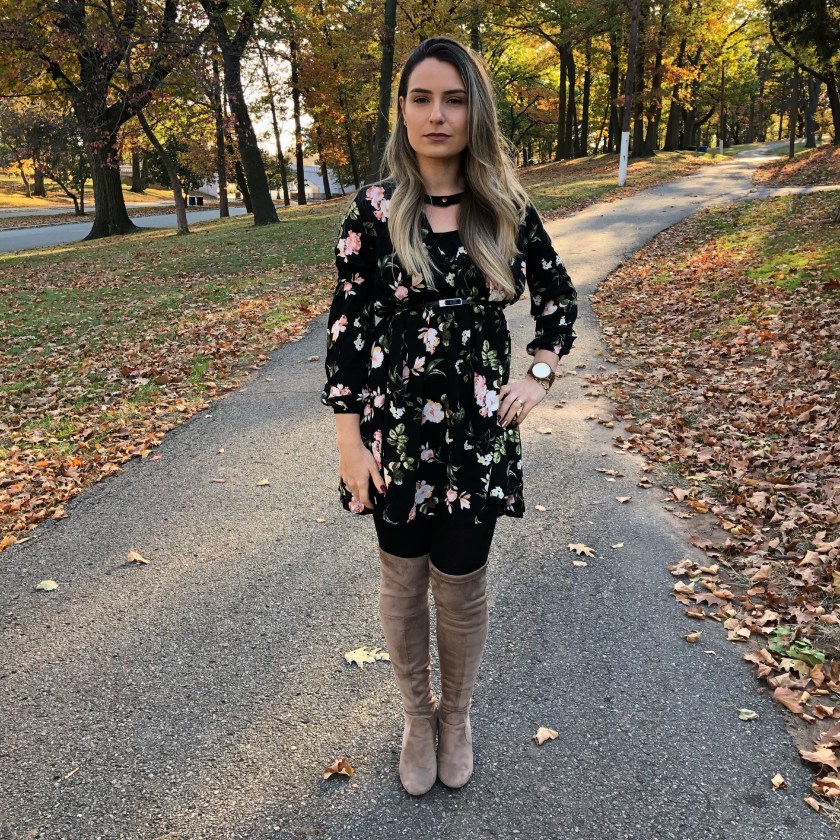 Tudo bem? Finalmente esfrio geral por aqui a ponto de tirar as minhas botas do armário e colocar para uso! Eu amo o verão, mas confesso que no outono/ inverno acho os looks mais chiques! E uma combinação que nunca falta no meu guarda roupa é a de vestidos com meia calça e botas! Adoro 🙂 E o look de hoje é uma produção destas! A peça principal aqui é esse vestido floral soltinho da Shein. Ele tem um detalhe super lindo no pescoço e fica todo soltinho no corpo. Eu coloquei um cinto para ficar mais charmoso mas usar ele todo solto fica bem legal também. Escolhi uma meia grossa preta e botas acima do joelho na cor nude. Simples e casual, perfeito para o dia a dia. Vejam como ficou: