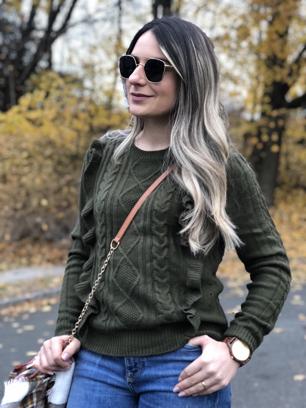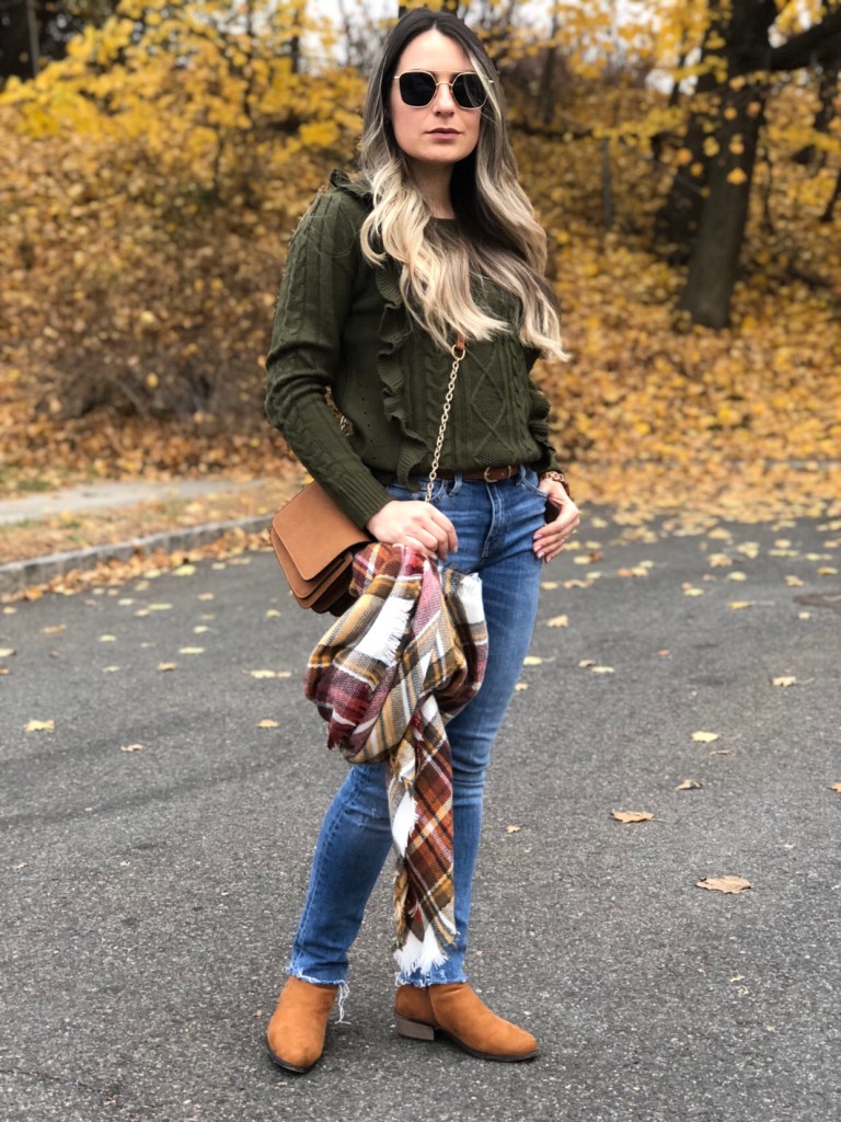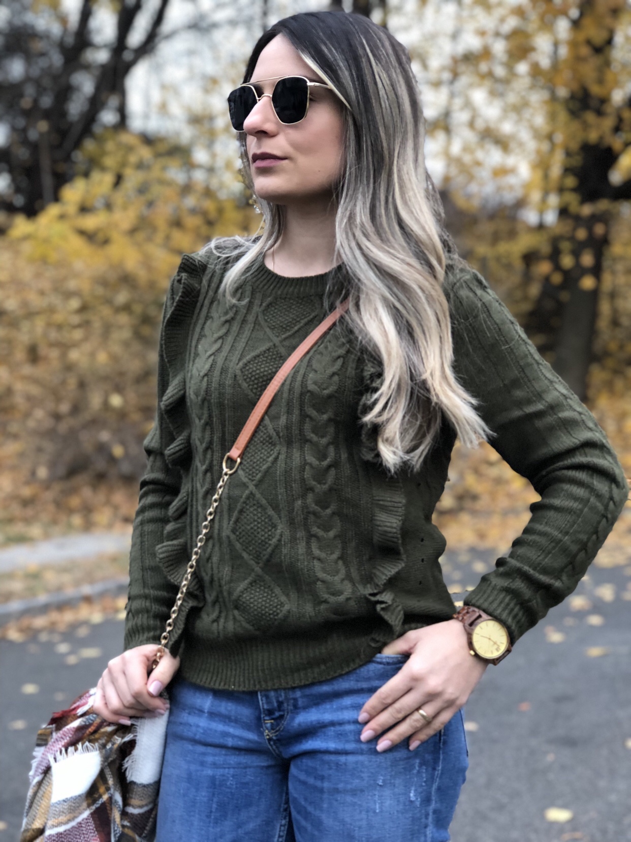 Hoje tem um look super casual usando um combo que tenho adorado nos últimos meses: jeans e suéter. Adoro suéter diferentes e esse da Shein todo trabalhado nos babados está super lindo! Os babados dão um toque especial ao look e você pode usar esse suéter para um look casual como eu fiz ou até mesmo com uma saia e um salto. Combinei com um jeans e botinha baixinha para um dia de correria e compras com Gabriel 🙂 Os dias estão ficando cada vez mais frios por aqui então carreguei um cachecol daqueles máxi xadrez que eu amo. Vejam como ficou: