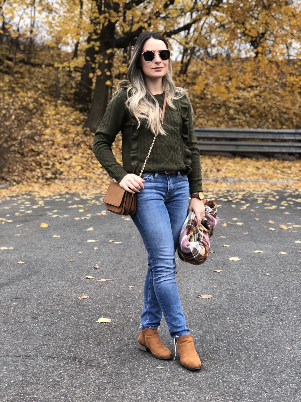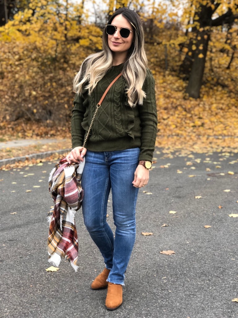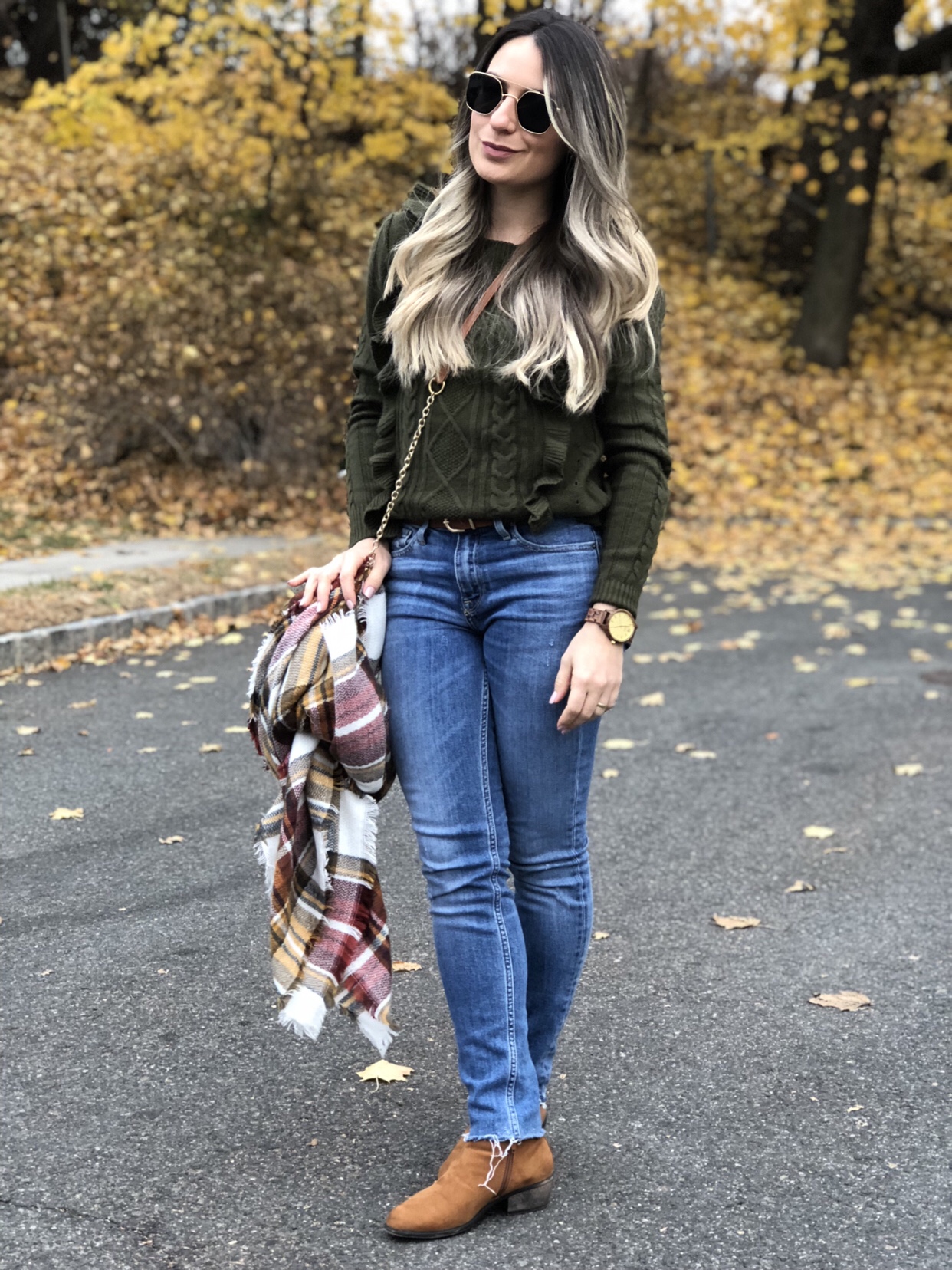 Hoje tem um look super casual usando um combo que tenho adorado nos últimos meses: jeans e suéter. Adoro suéter diferentes e esse da Shein todo trabalhado nos babados está super lindo! Os babados dão um toque especial ao look e você pode usar esse suéter para um look casual como eu fiz ou até mesmo com uma saia e um salto. Combinei com um jeans e botinha baixinha para um dia de correria e compras com Gabriel 🙂 Os dias estão ficando cada vez mais frios por aqui então carreguei um cachecol daqueles máxi xadrez que eu amo. Vejam como ficou: