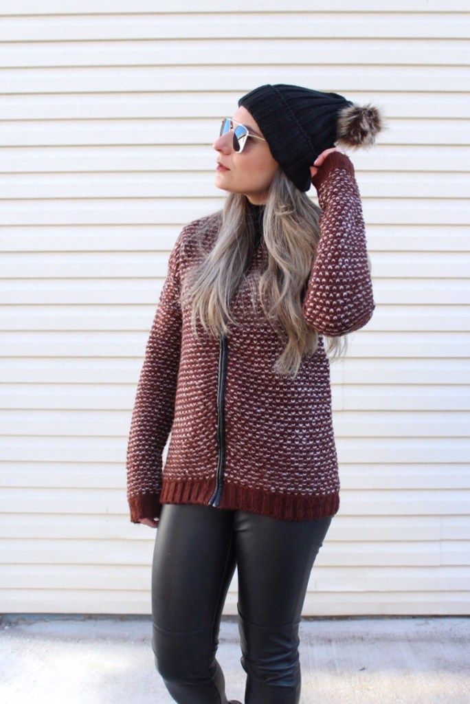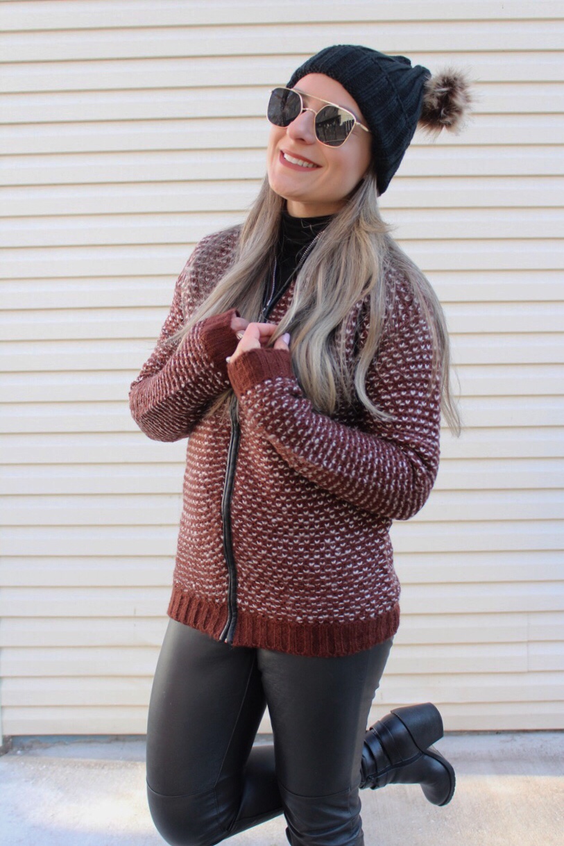 Como foi a virada de ano de vocês? Por aqui foi bem tranquilo, apesar do frio congelante, passamos a noite de ano novo entre amigos e família na igreja e foi muito bom. Esse ano que passou só tenho que agradecer por todas as benções recebidas, especialmente de ter colocado Gabrielzinho no mundo! Que 2018 seja um ano de realizações, muita saúde e AMOR para todos nos! Hoje queria dividir com vocês um look super casual e quentinho que usei nesta terça feira. O frio aqui não esta para brincadeira, temperaturas abaixo de 0 C. Mas como saímos de carro, apenas uma jaquetinha suéter com uma touca foi suficiente. E estou apaixonada com essa jaqueta da Baciano, uma marca de LA! Alem de ser super quentinha é também bem moderna e veste super bem. A parte do zíper é trabalhada em couro sintético então combinei com uma calca do mesmo material e botinha de cano baixo. Finalizei com uma toquinha de pompom óculos de sol. Vejam como ficou: