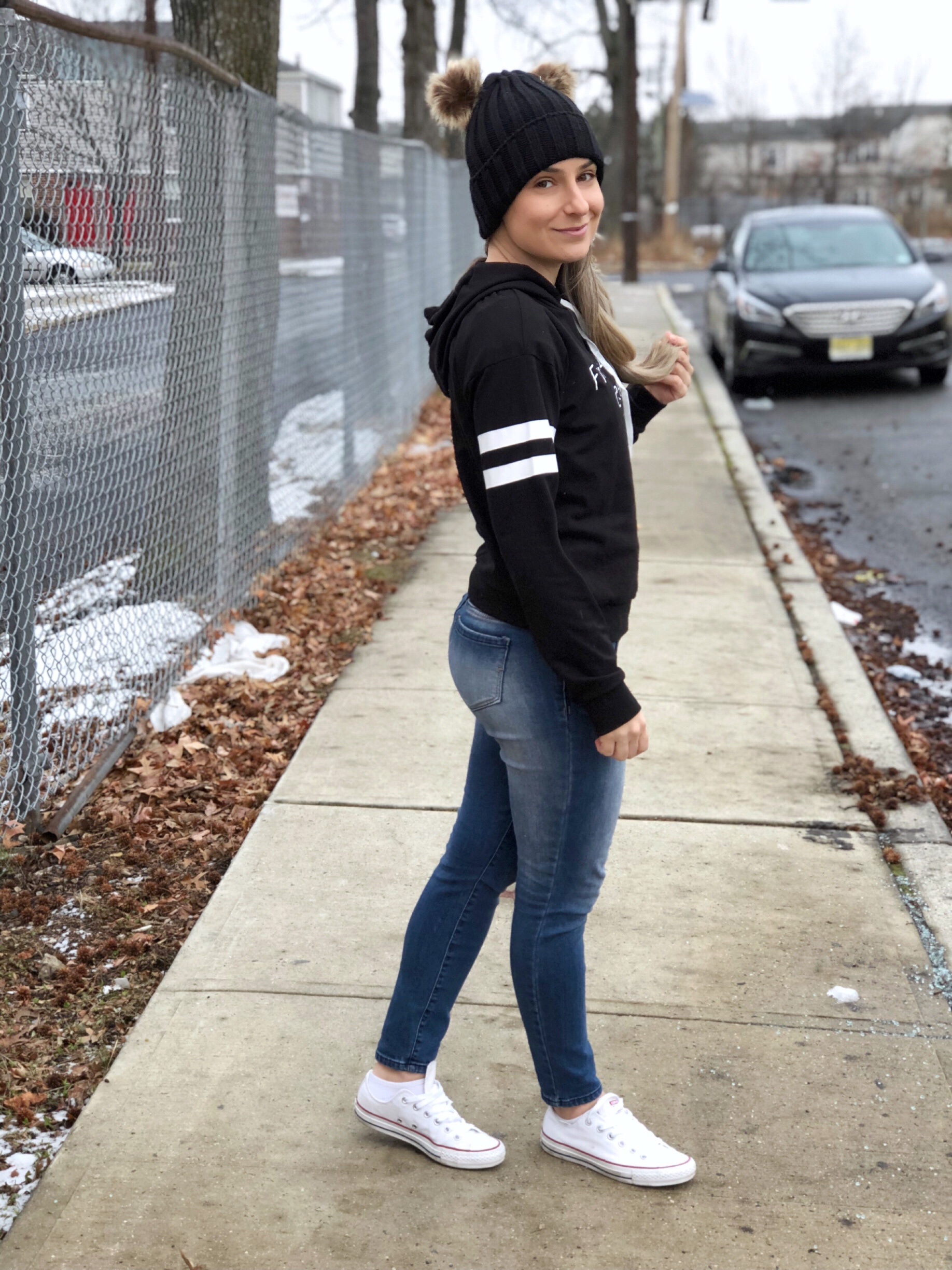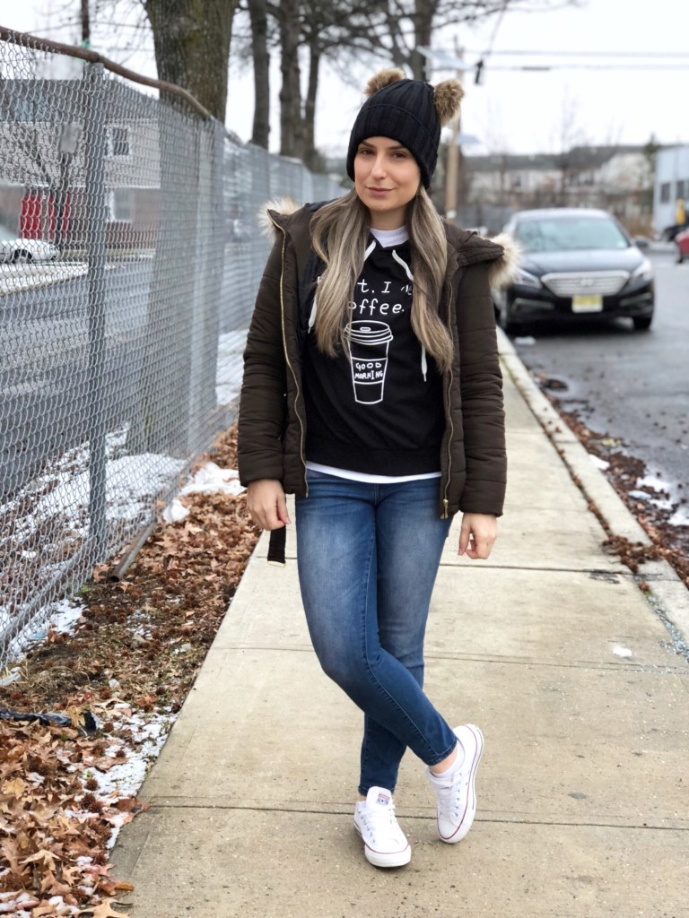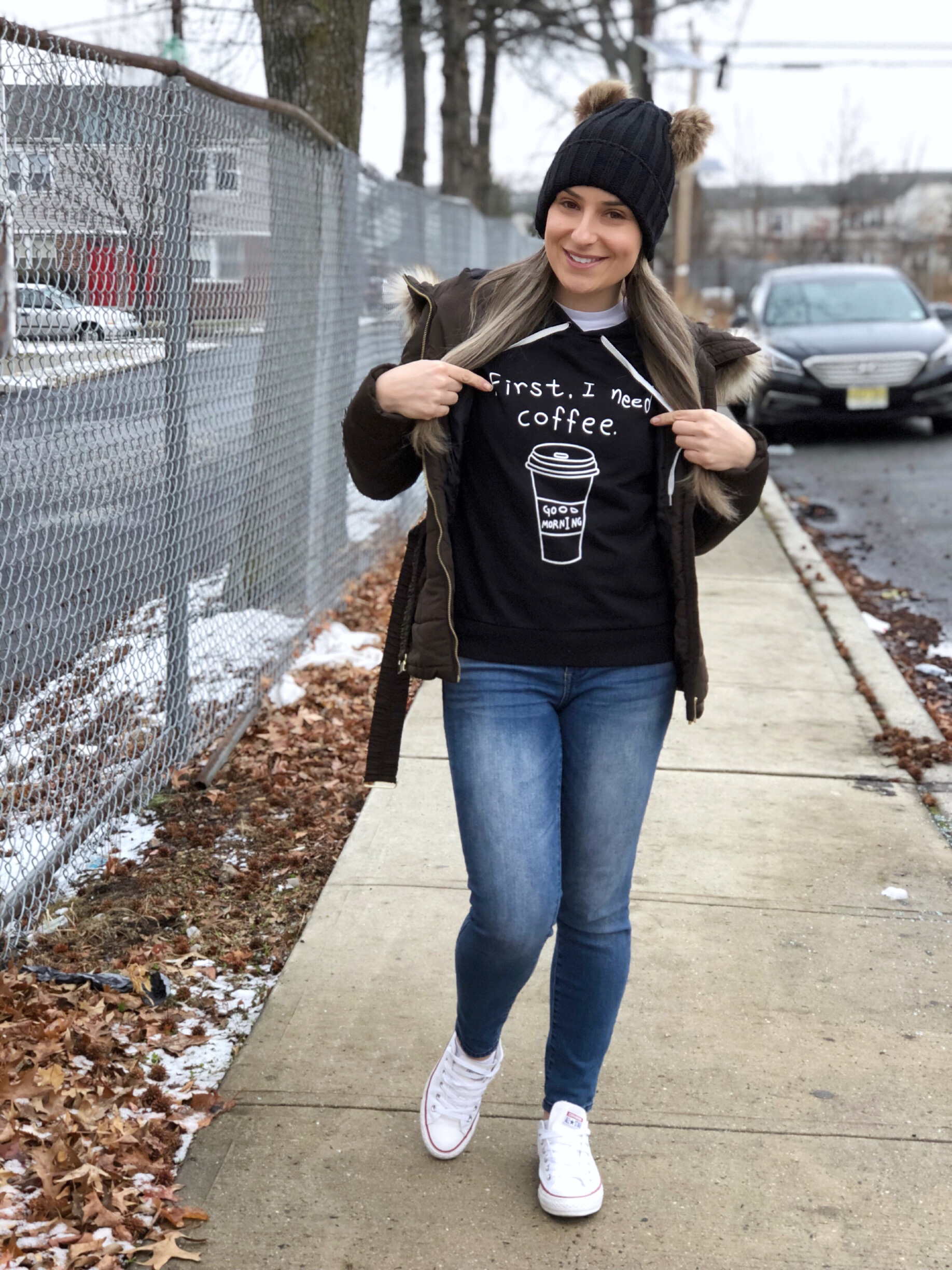 The weekend is around the corner, anyone excited there!? I am, because its supposed to be a little warmer this weekend here in NJ! This week I was able to keep posting outfit inspiration for you guys and I feel very good about that. Little by little I can organize myself and bring more stuff here for you! And the outfit today is very basic and super fun. I am so into print shirts and hoddies lately and I found this one to be exactly made for me! Well, not really anymore lol 🙂 after Gabriel was born I barely get to drink my cup of coffee first thing in the morning haha I matched this coffee print hoddie with some skinny jeans and my white converse. Threw a coat on top and a pompom bennie to keep warm and that was my look for the day. This hoodie is so comfy and cool that I dont want to take it off anymore and it is only $20! Check it ou!