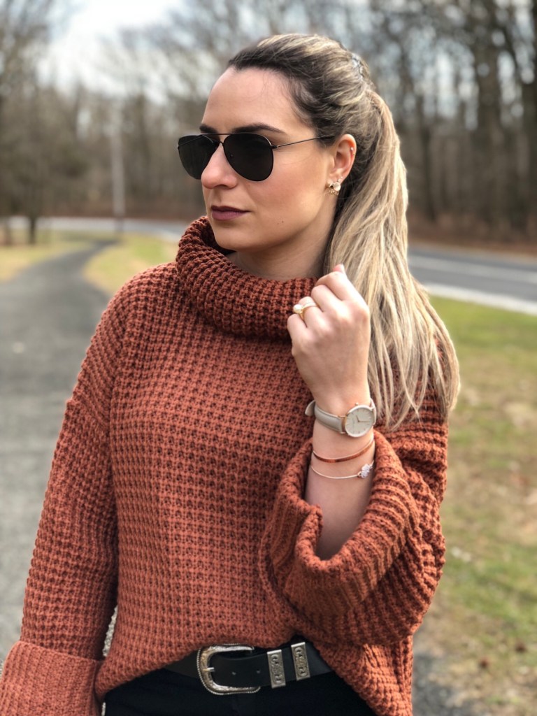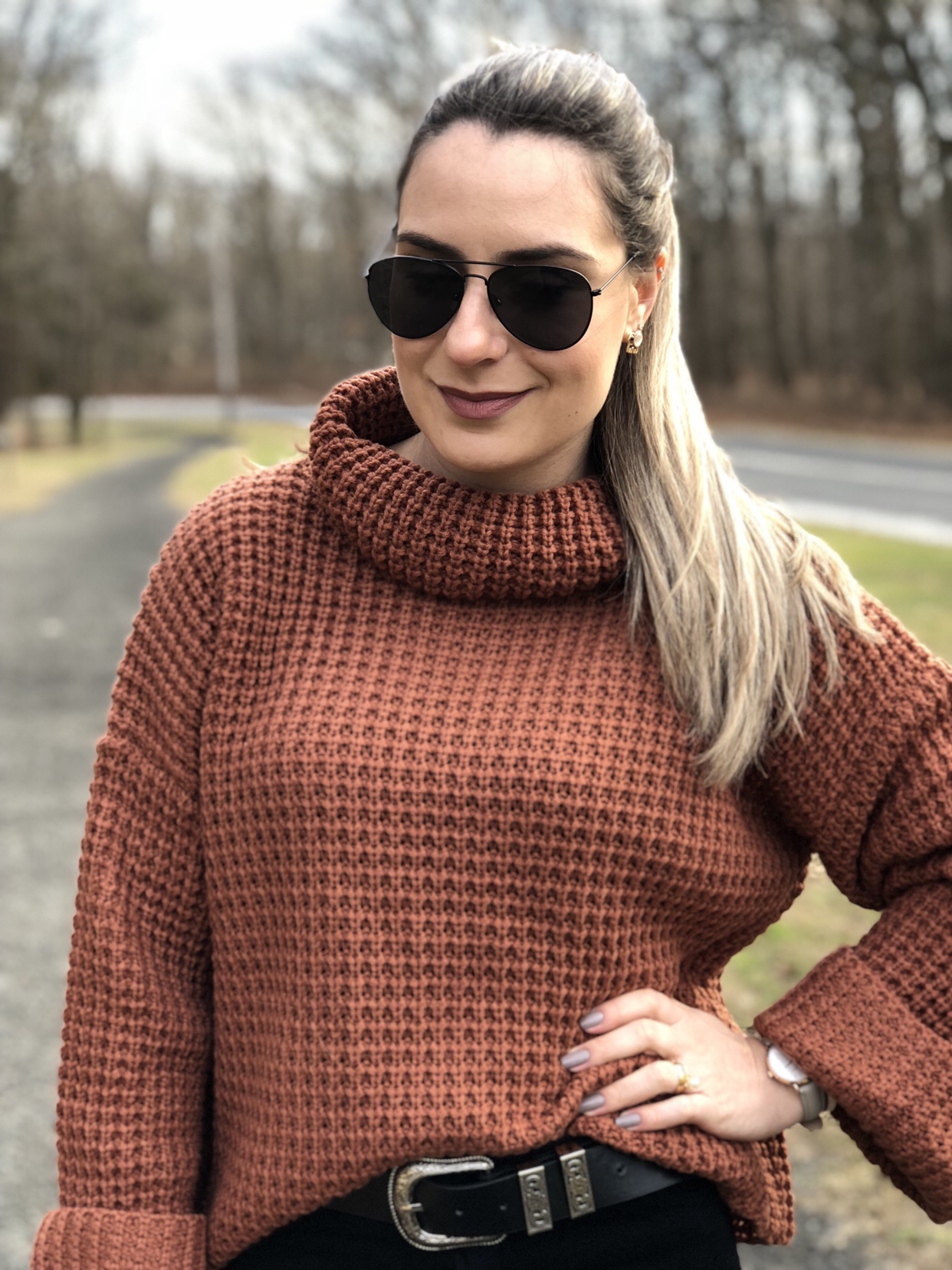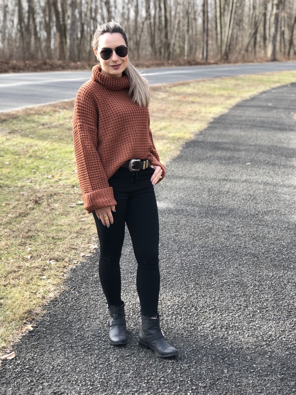 Ontem o dia estava super gostoso por aqui. Aproveitamos para sair de casa um pouco e andar no parque com o Gabriel. Lógico que ele estava parecendo um pinguim, todo encapuzado hahaha quem assisti os stories do Instagram viu 🙂 Aproveitei também para fotografar esse look super confortável. Adoro sueters, e esse modelo da Shein estava perfeito para o dia de ontem. Ele é bem fofinho e fica muito pesado para usar com casaco. É perfeito para usar sozinho em dias não muito frios. Combinei com uma calca jeans preta skinny de cintura alta e um cinto largo estilo western que esta super em alta. Vejam como ficou: