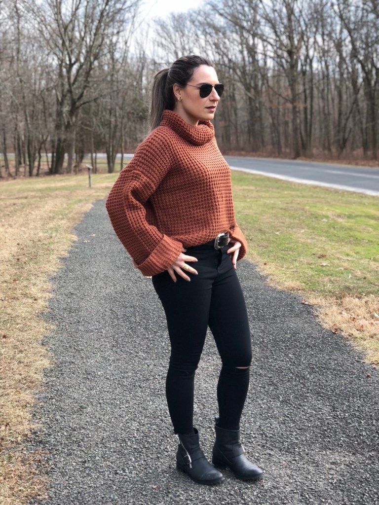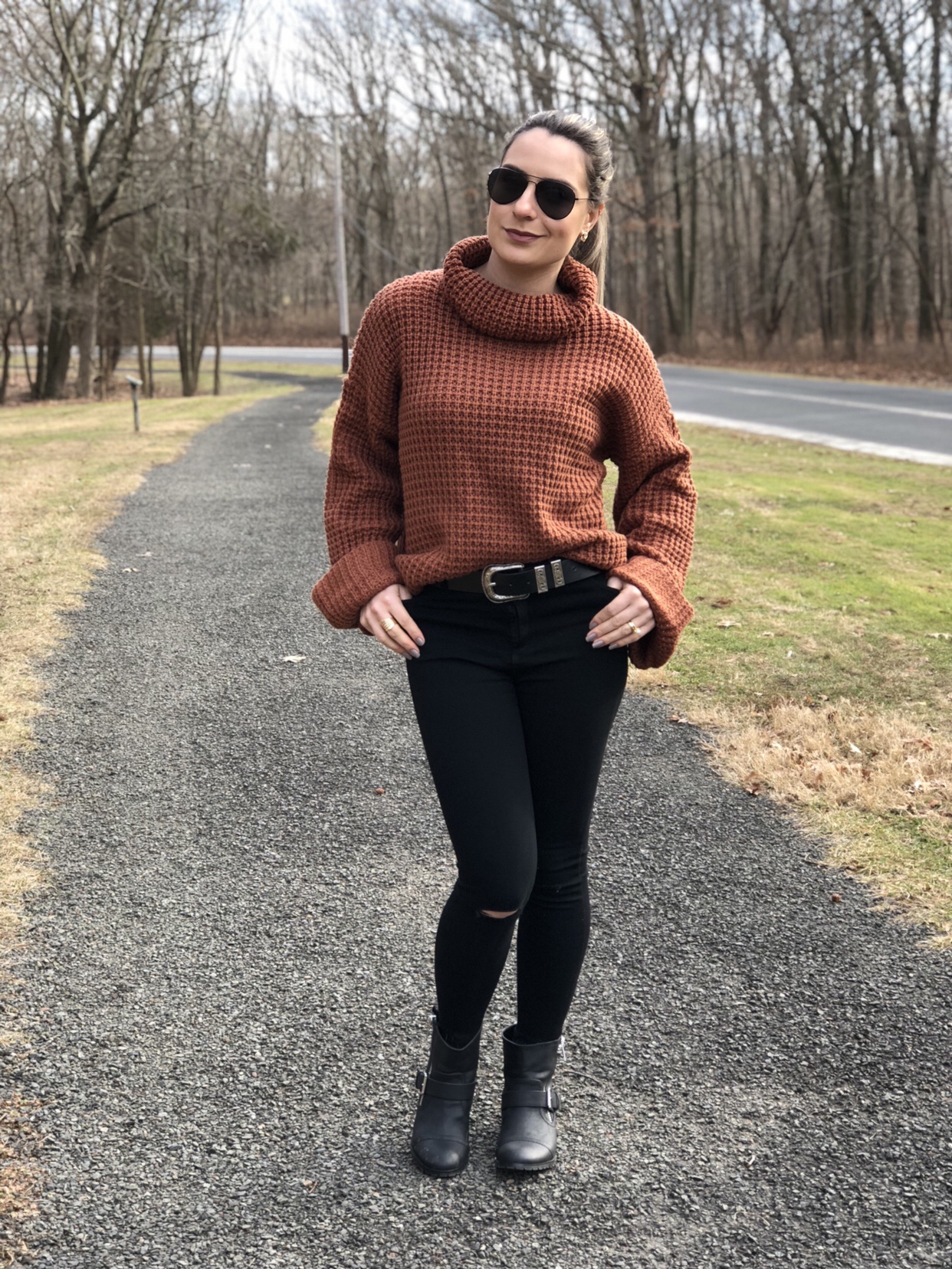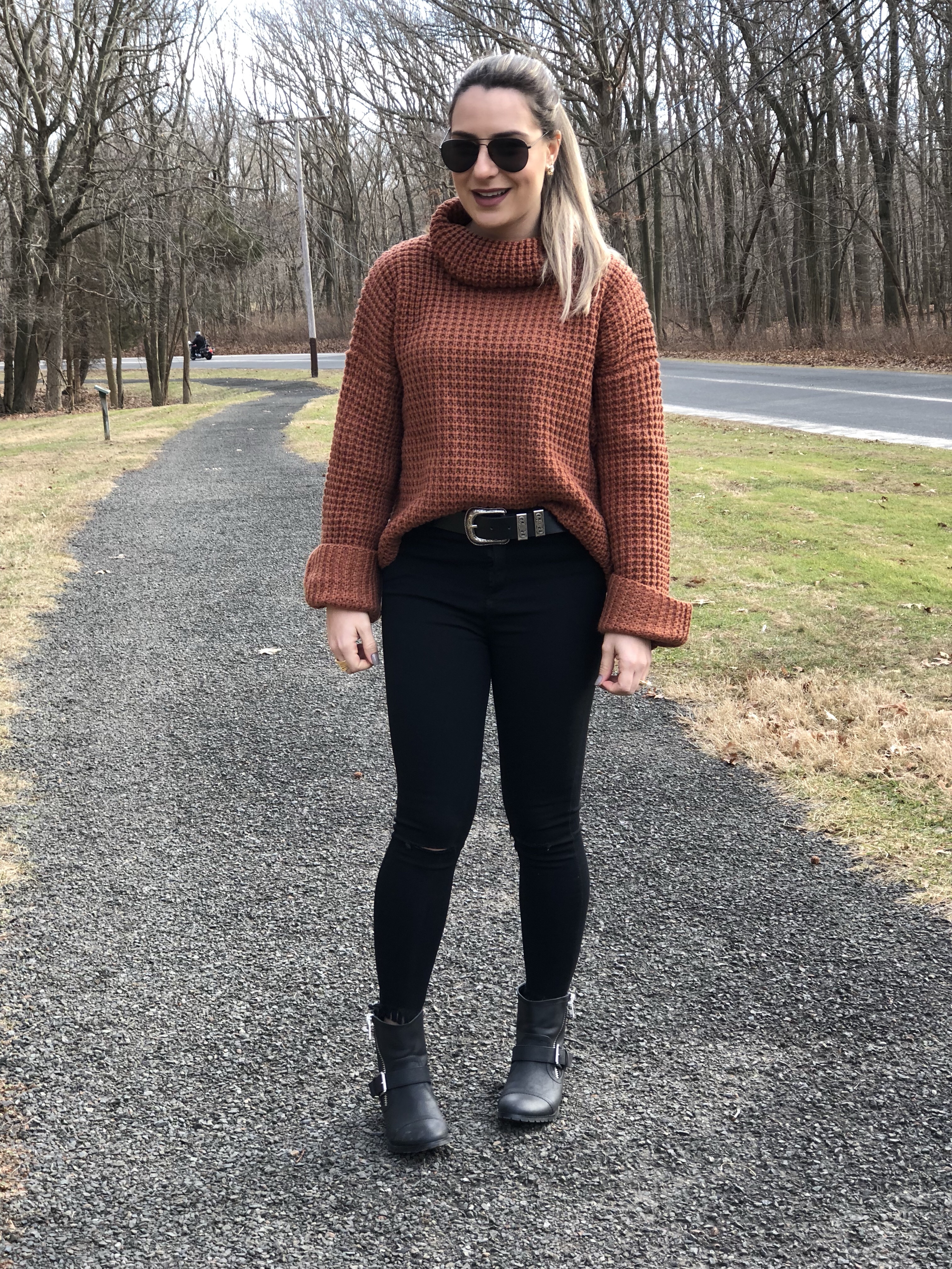 Ontem o dia estava super gostoso por aqui. Aproveitamos para sair de casa um pouco e andar no parque com o Gabriel. Lógico que ele estava parecendo um pinguim, todo encapuzado hahaha quem assisti os stories do Instagram viu 🙂 Aproveitei também para fotografar esse look super confortável. Adoro sueters, e esse modelo da Shein estava perfeito para o dia de ontem. Ele é bem fofinho e fica muito pesado para usar com casaco. É perfeito para usar sozinho em dias não muito frios. Combinei com uma calca jeans preta skinny de cintura alta e um cinto largo estilo western que esta super em alta. Vejam como ficou: