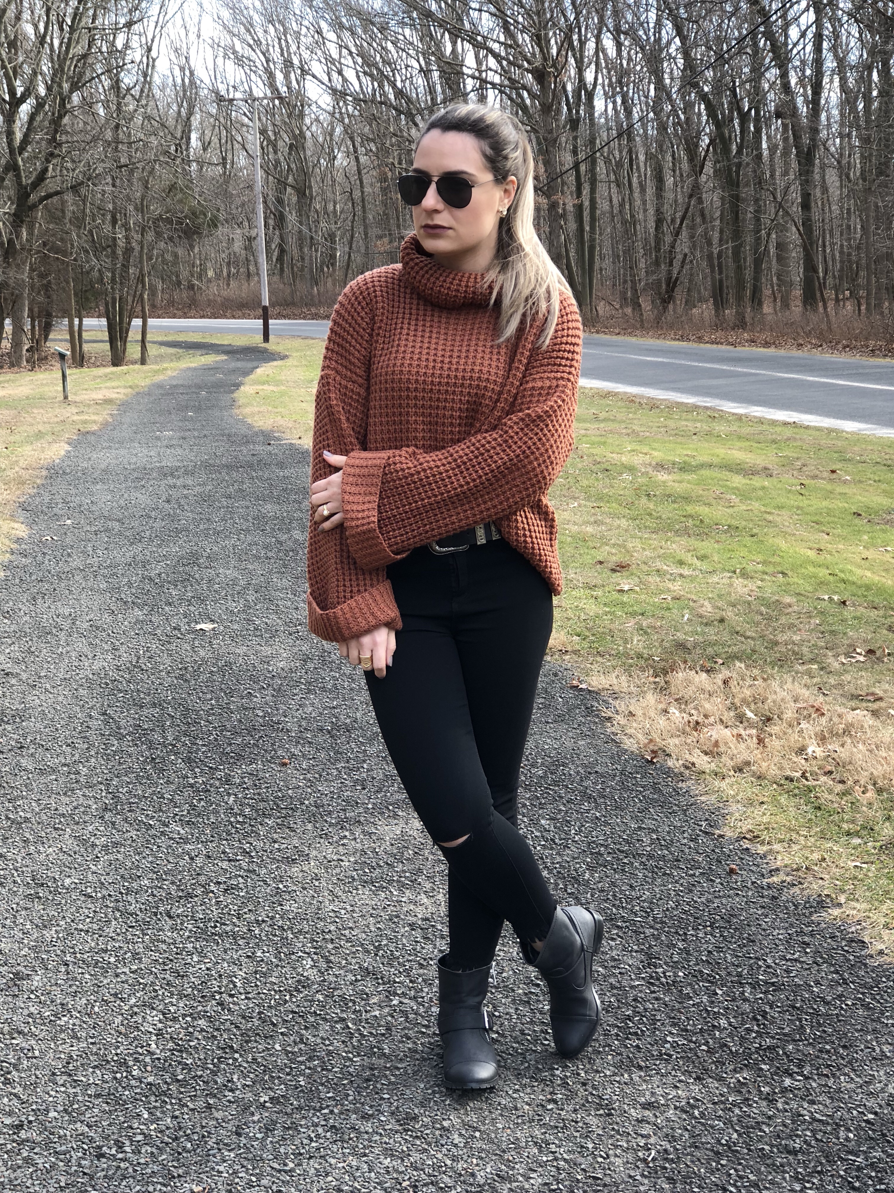 Yesterday was such a beautiful day here and we took Gabriel for a stroll in the park and took some pictures of my outfit. I am loving this Waffle Knit Sweater from Shein. Its so cozy and trendy and it looks great with high waisted jeans beacuse its a little bit cropped. I paired with black skinny jeans and finished off with a western style belt and booties. I love cozy sweaters now in the winter time and this one is just perfect!