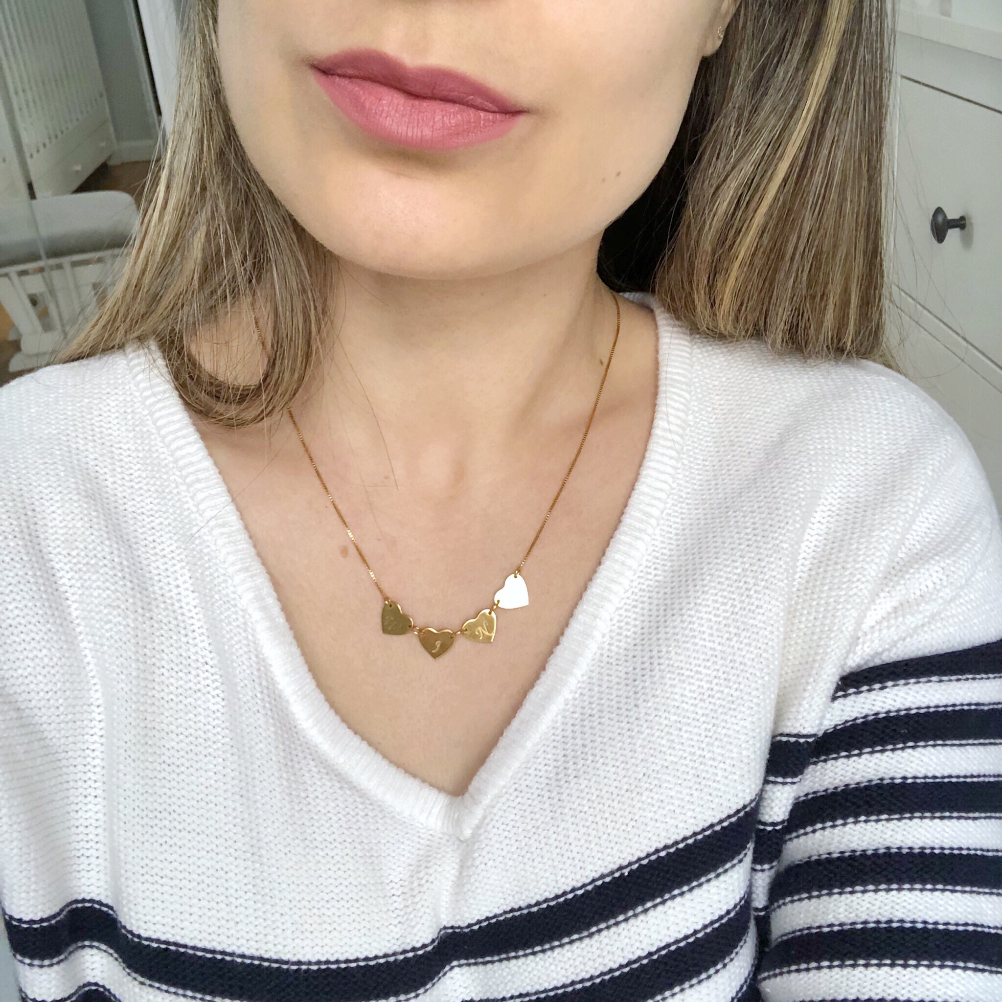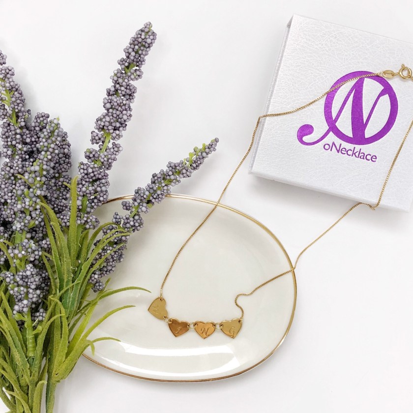 Joias também sao um presente e tanto. Estou babando nesse colarzinho personalizado da loja Onecklace. Eles tem várias peças e muitas delas você pode personalizar. Eu pedi um colarzinho foleado de ouro 24 que vem com 4 corações e em cada coração eu coloquei a inicial dos nomes da nossa família incluindo eu, meu esposo, Gabriel e Niky nosso cãozinho 🙂