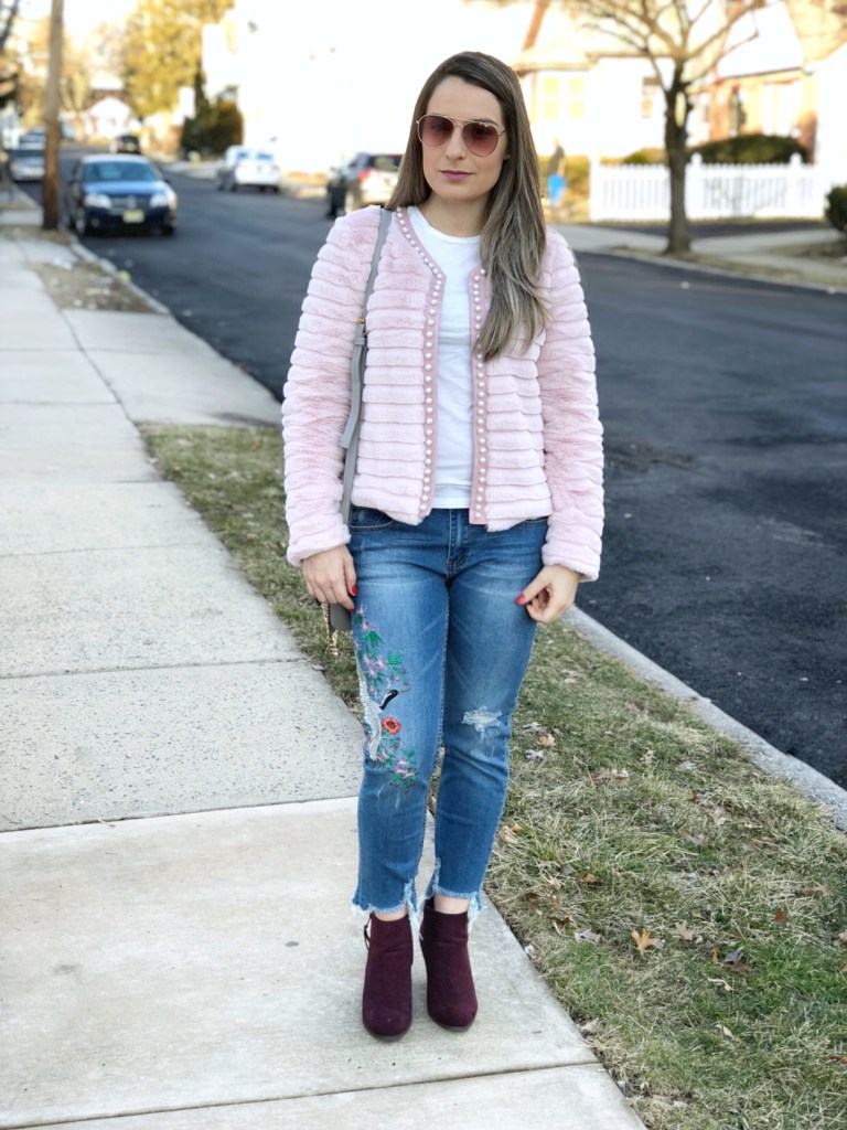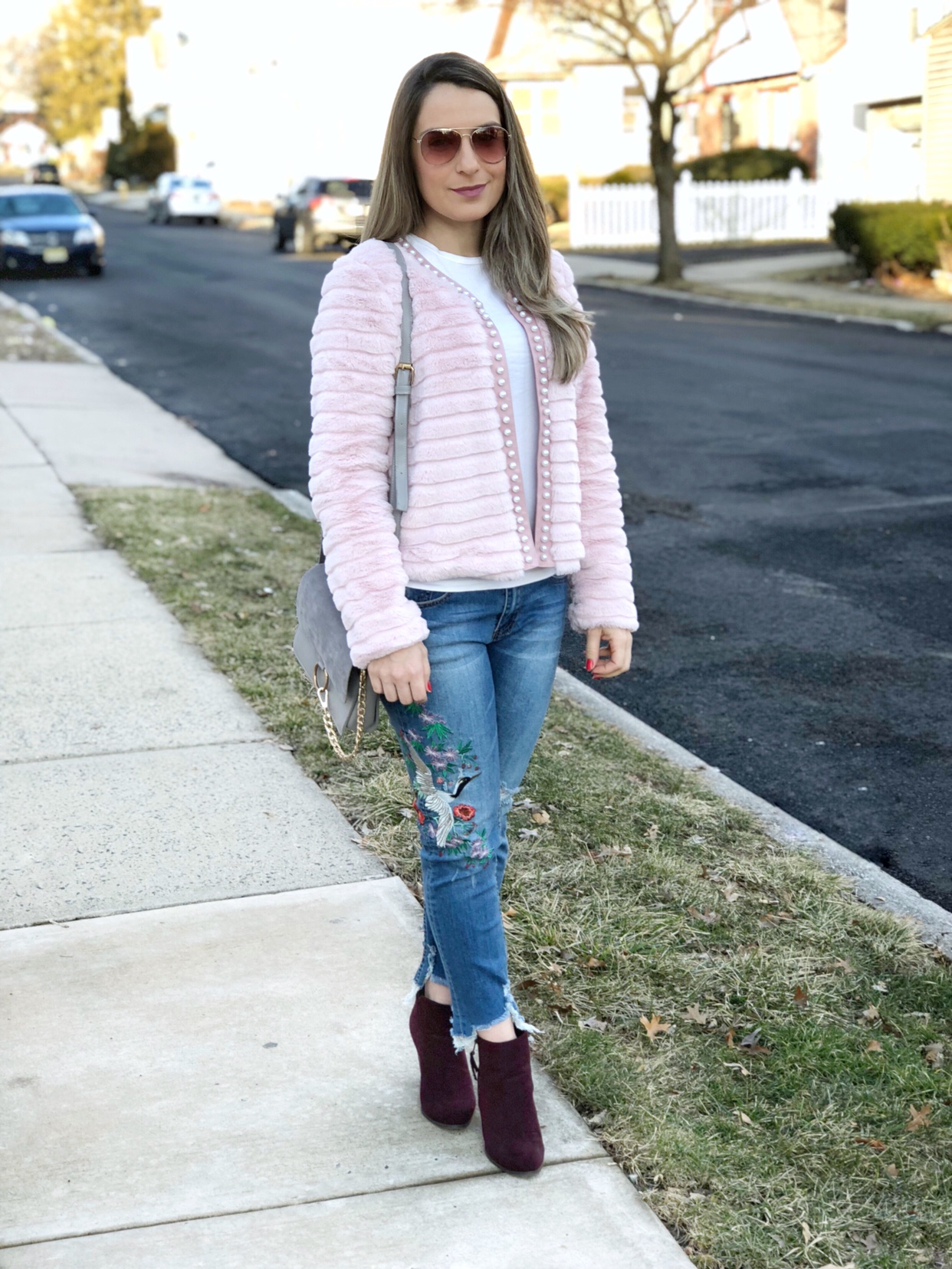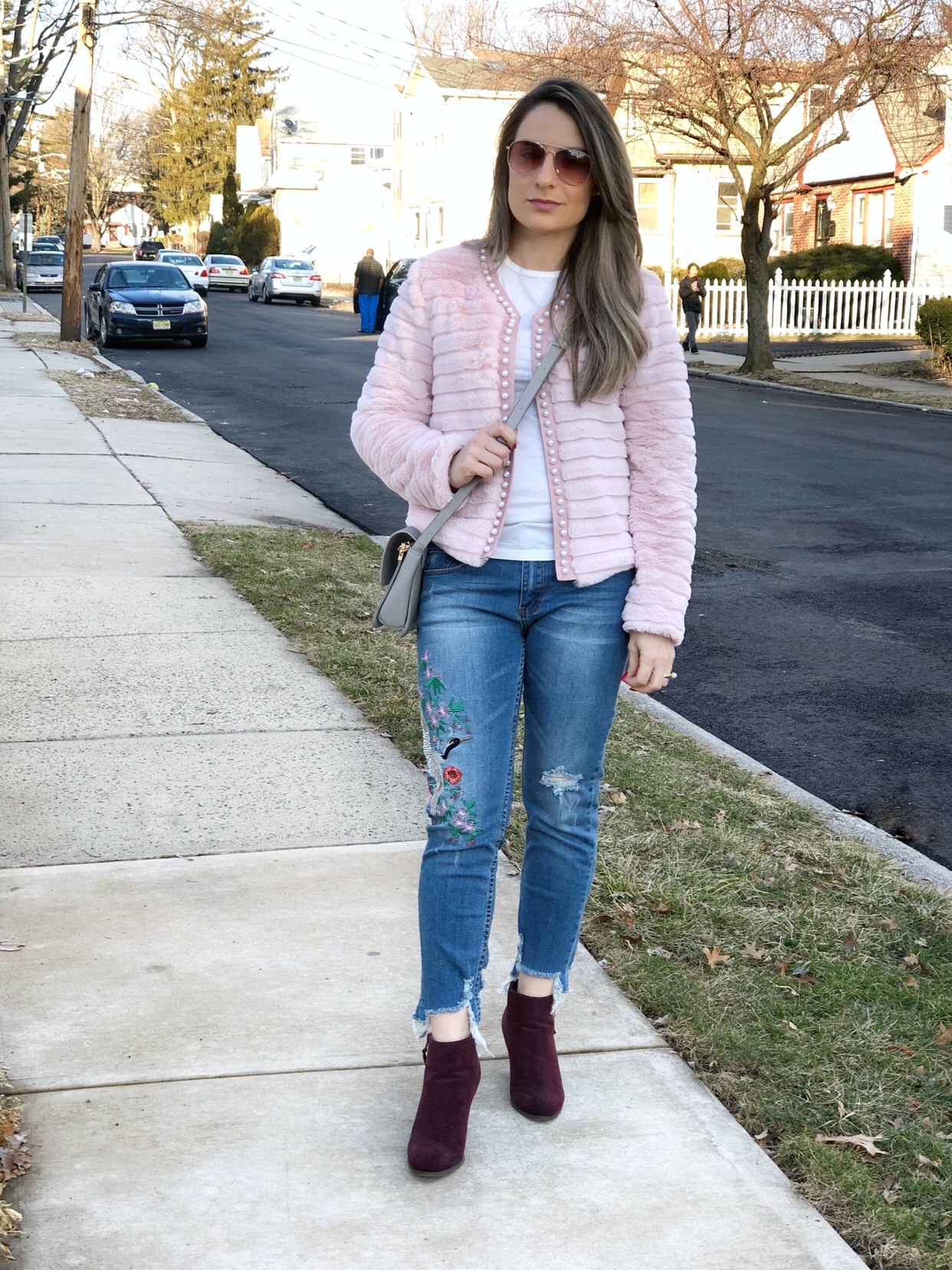 The week is almost over and I finally got the chance to photograph an outfit to show you guys. Its been so cold in here and Gabriel got sick so I did not have a chance to post any outfit lately. But today I got a very cute one! The main piece here is this Shein Faux Fur Pink Jacket. Its so cute and lady like. It has pearls detail on the trim and its so warm and nice. I love to wear fur jackets with jeans or leggings to get a good balance. I paired with destroyed embroidered jeans and burgundy booties. I hope you like how it turned out!