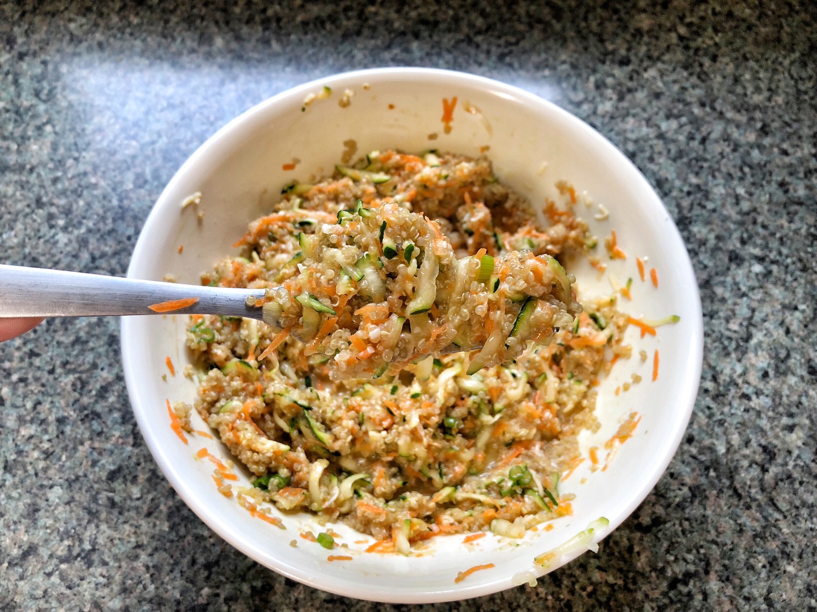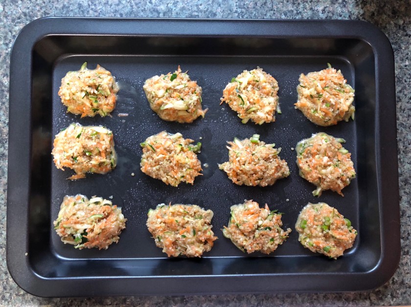 I mixed the eggs first and then added all the other ingredients. With a spoon I just placed small amounts in a biking pan and put in the over for 20 minutes on 350 F.