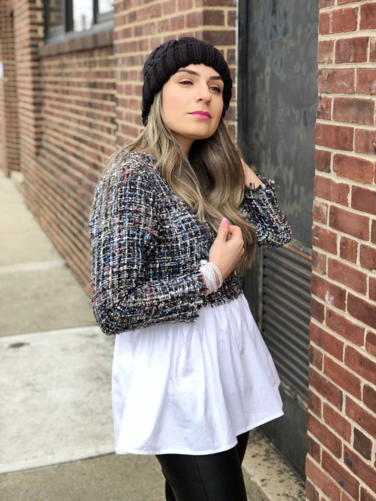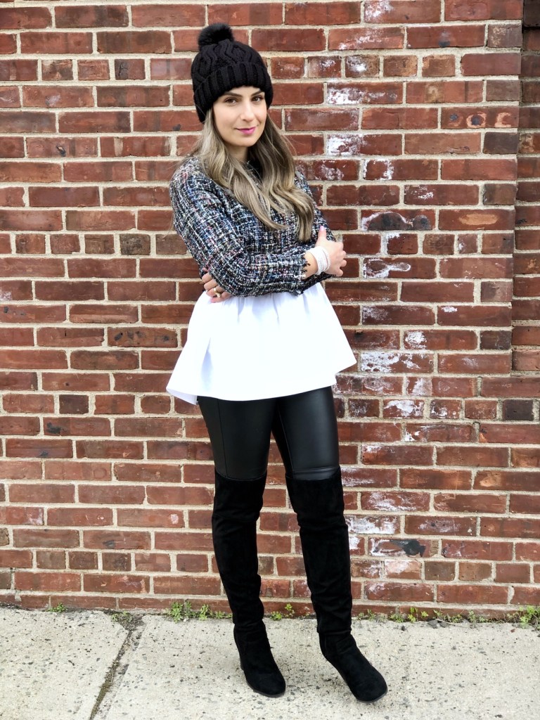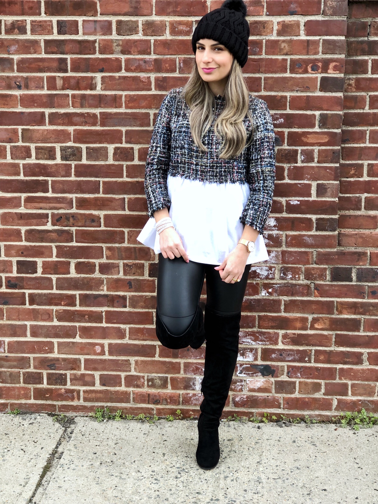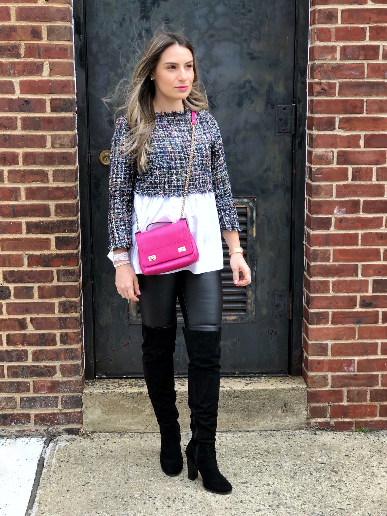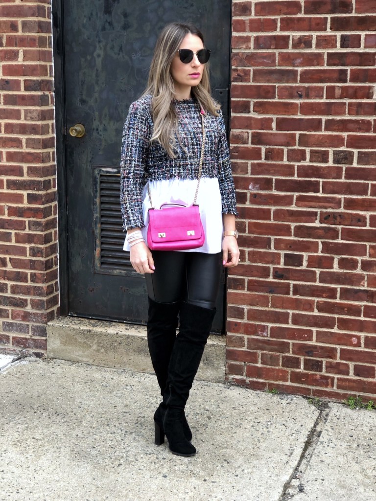 How was your weekend? Are you ready to face Monday yet haha? We had a relax weekend and even though Spring arived last week it is still very cold around here. I wanted to share today’s outfit with you guys. I got this really cute 2 in 1 Tweed babydoll blouse from Shein and paired it with leather pants and over the knee boots. The pink crossbag added some color to the outfit.