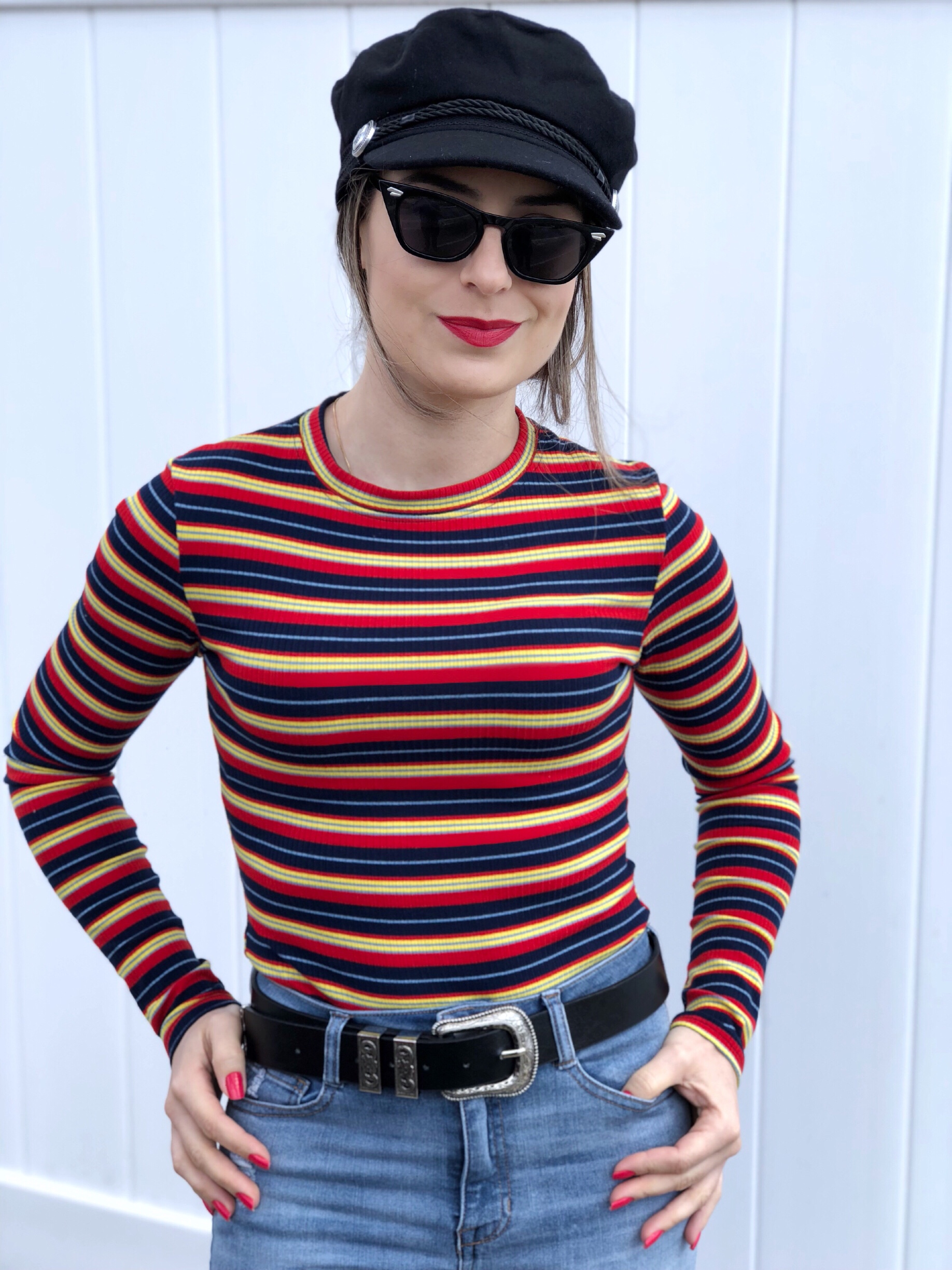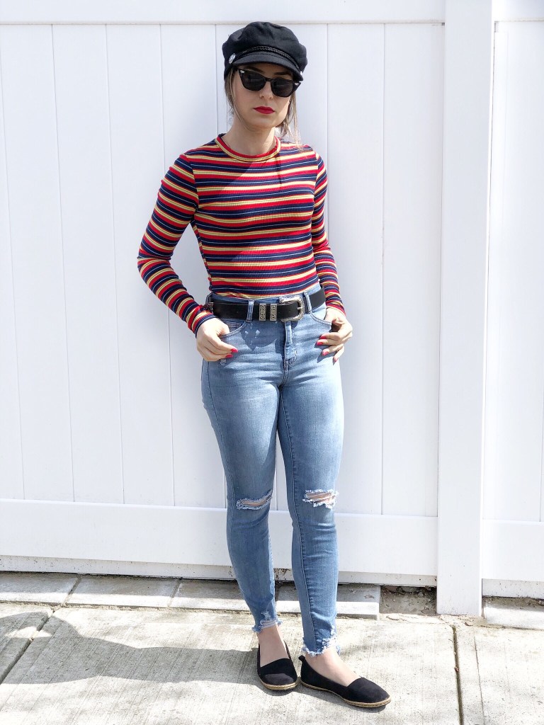 How was your sunday? Mine was great, spent some time with the family and photographed this cute casual outfit to show you. I am in love with this colorful striped ribbed tee from Shein. It looks so cute paired with high waisted jeans! I am also so into this new cab drive cap trend. This cute little black beret can be worn to style so many outifts. I paired this look with flats for a more comfy and casual vibe. This tee is on sale for only $10! So check it out here: Shein