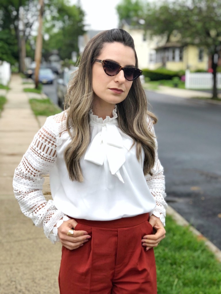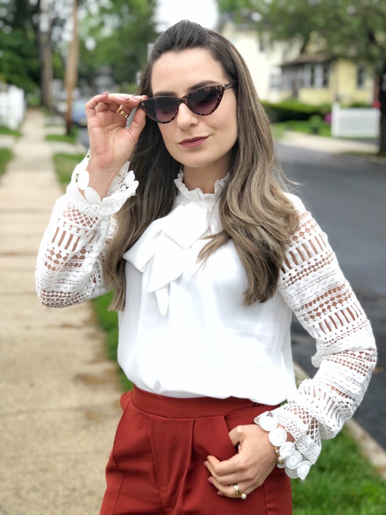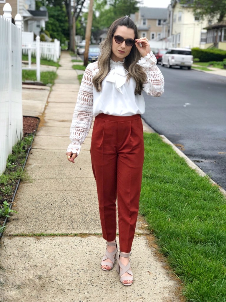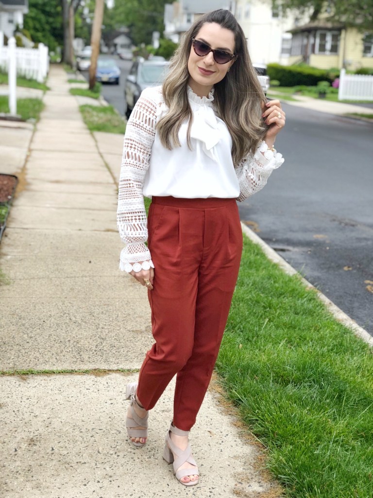 First of all, I would like to wish all mamas out there a happy Mother’s Day! I hope you had a wonderful time with your family. And today I wanted to show you my outfit for this special day: my second mother’s day! 🙂 I wore this beautiful white lace sleeve blouse from Shein. The tie on the neckline makes it more chic and very girly. I paired it with high waist pants on this gorgeous orange/brown color and finished the look with strappy nude sandals from Shoetopia. I love how it came out.