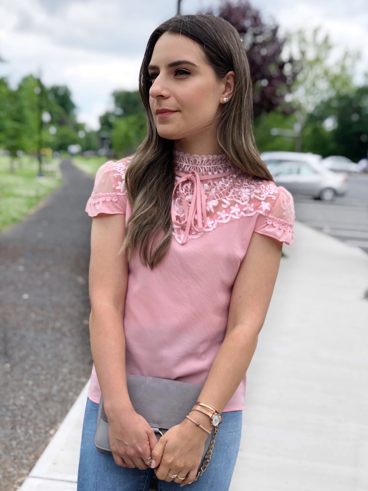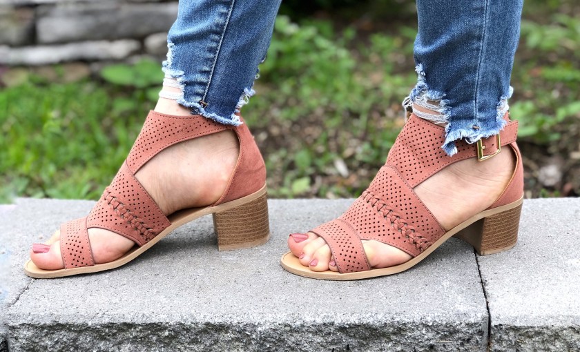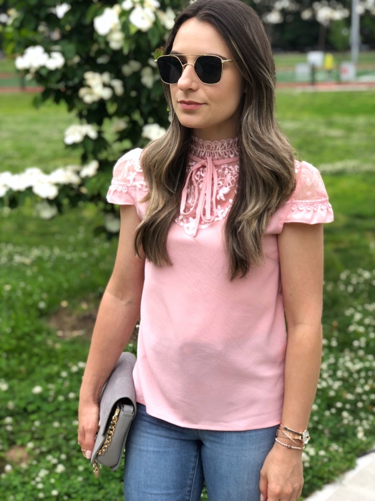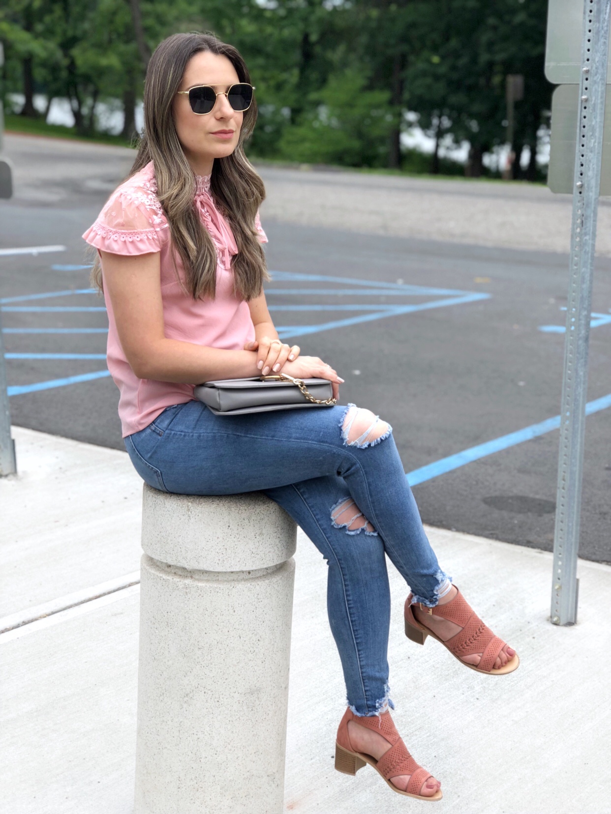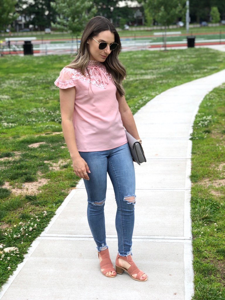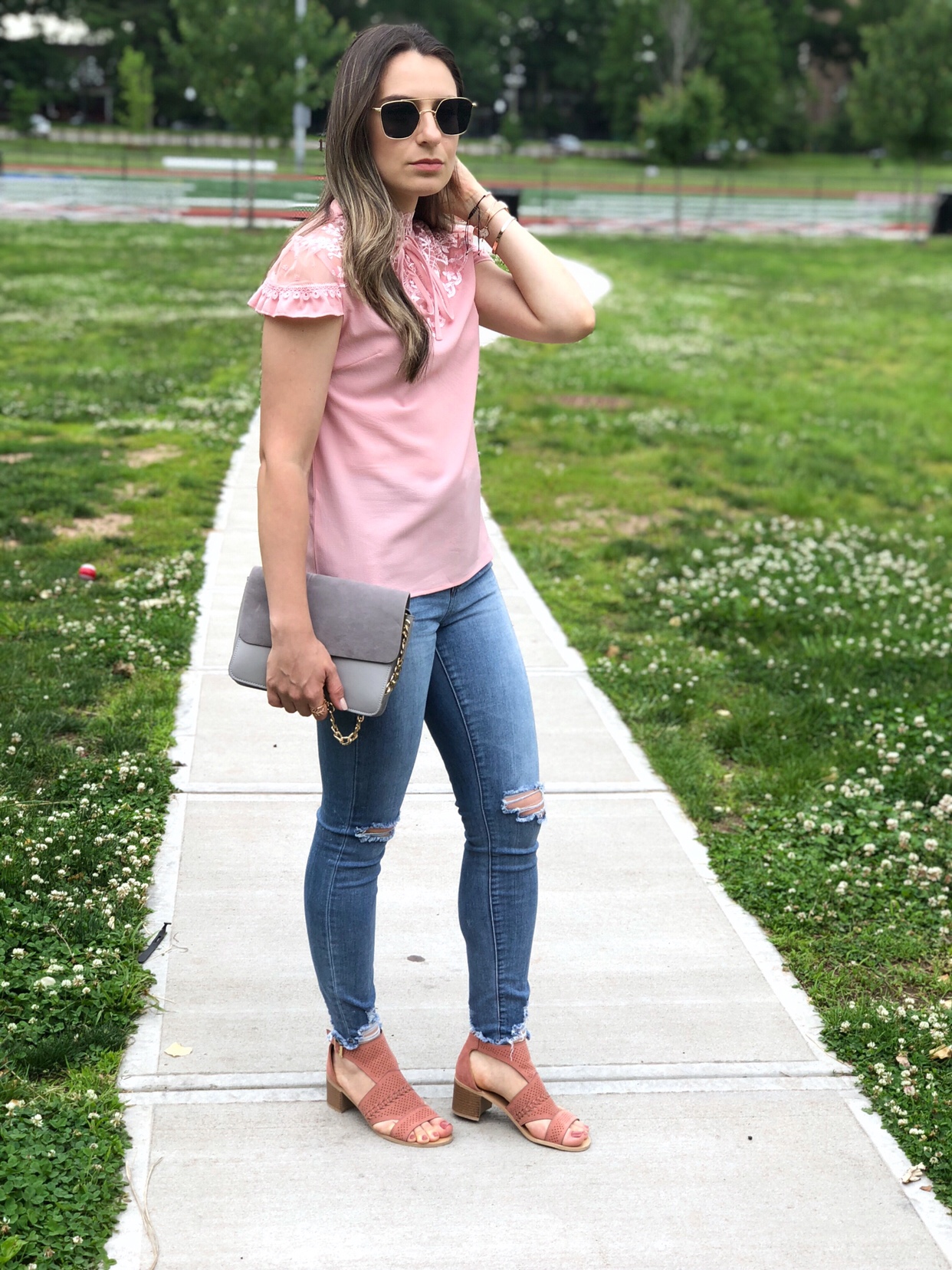 I am back with another outfit post for you! These past few days have been very hard to get posts done up here because baby Gabe is teething and all he wants is stay cuddling with me all day. So please bare with me and follow me along on Instagram where I try to post on a daily basis. Ok, so lets talk about my latest outfit. I love to match match my clothes 🙂 and today I tried to match my top with my sandals and loved how it came out. I wore this very cute mesh top from Shein ( which is on sale right now!!!) and paired it with skinny jeans. For my shoes I chose this very confortable pair of blush sandals from Shoetopia. It has a cute cut and the square heels make it very easy to walk around. I love pairing it with jeans but I am sure you will see me using it a lot all summer long with shorts, dresses… Its so cute!