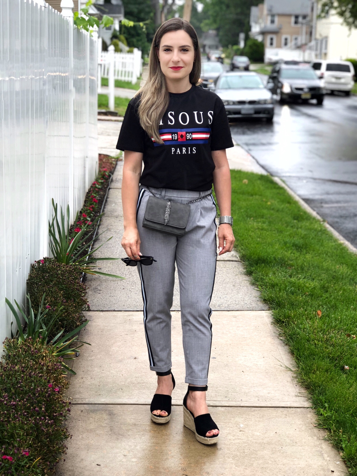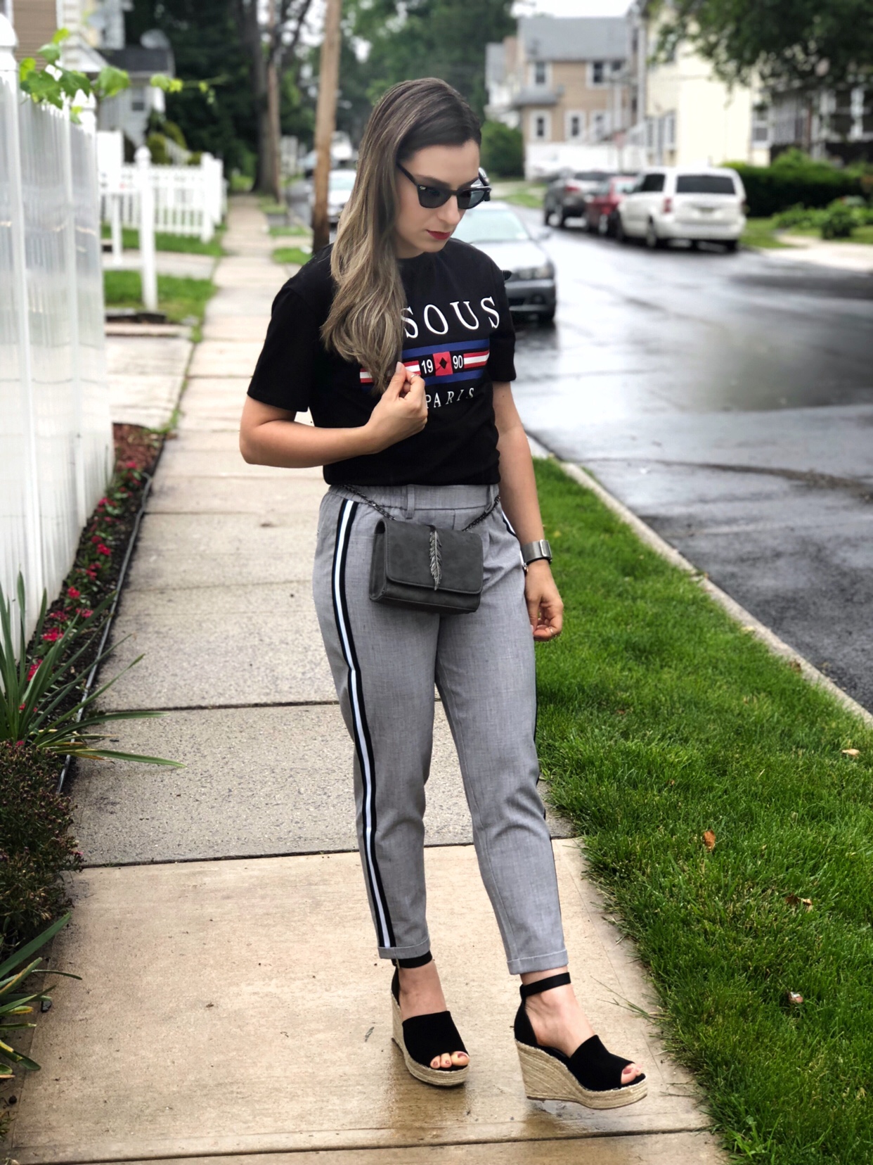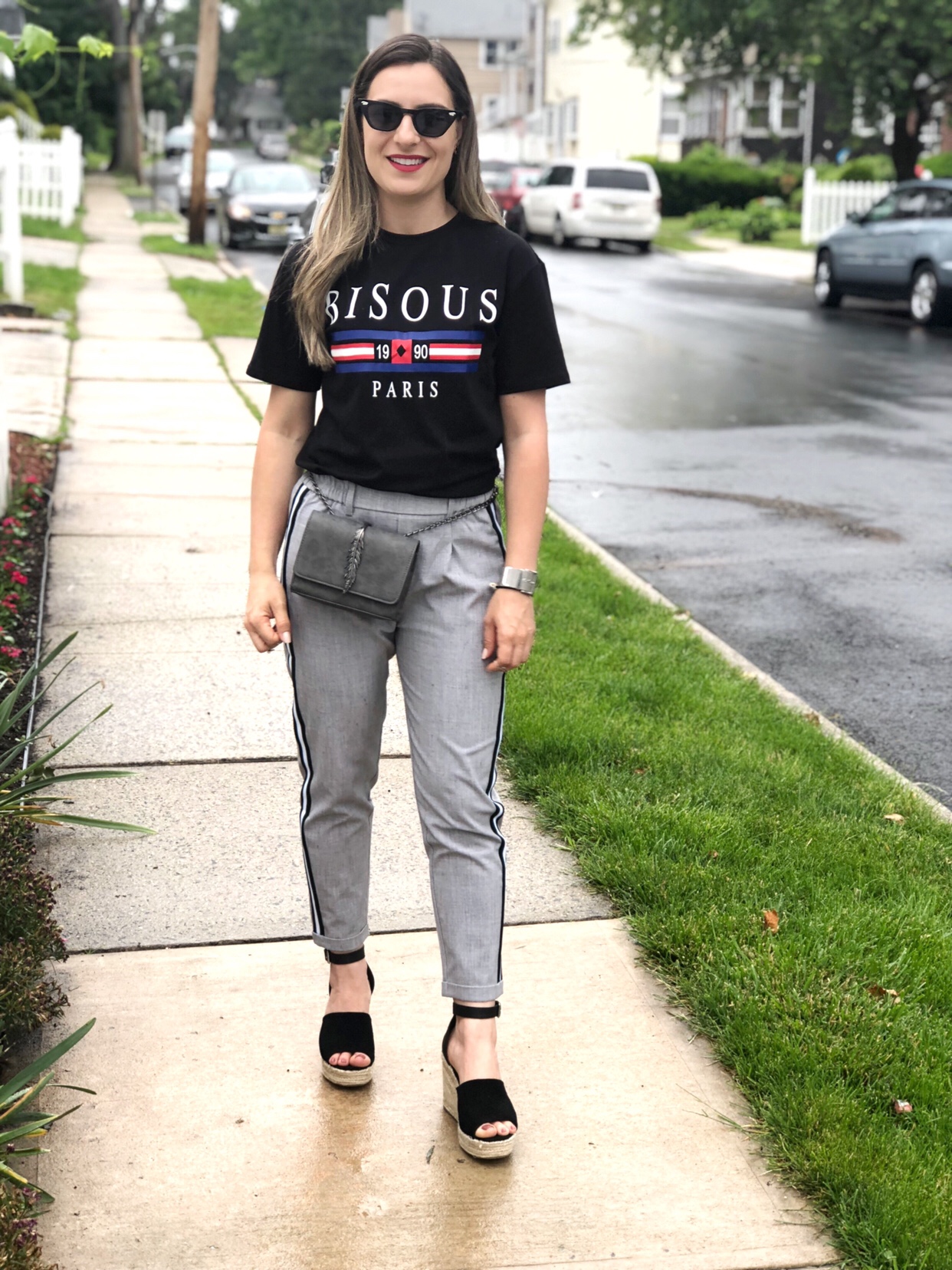 How was your weekend? This week I had time to photograph some of my outfits that I wanted to share with you. You may have noticed how I am obsessed with graphic tees. I love mixing it with different pants or skirt. And today I wore this Shein BISOUS Paris tee in black (which is on sale for only $9!) with stripped high waist pants also from Shein. I paired with wedge sandals and loved the final outcome.