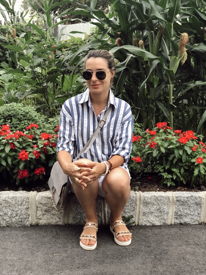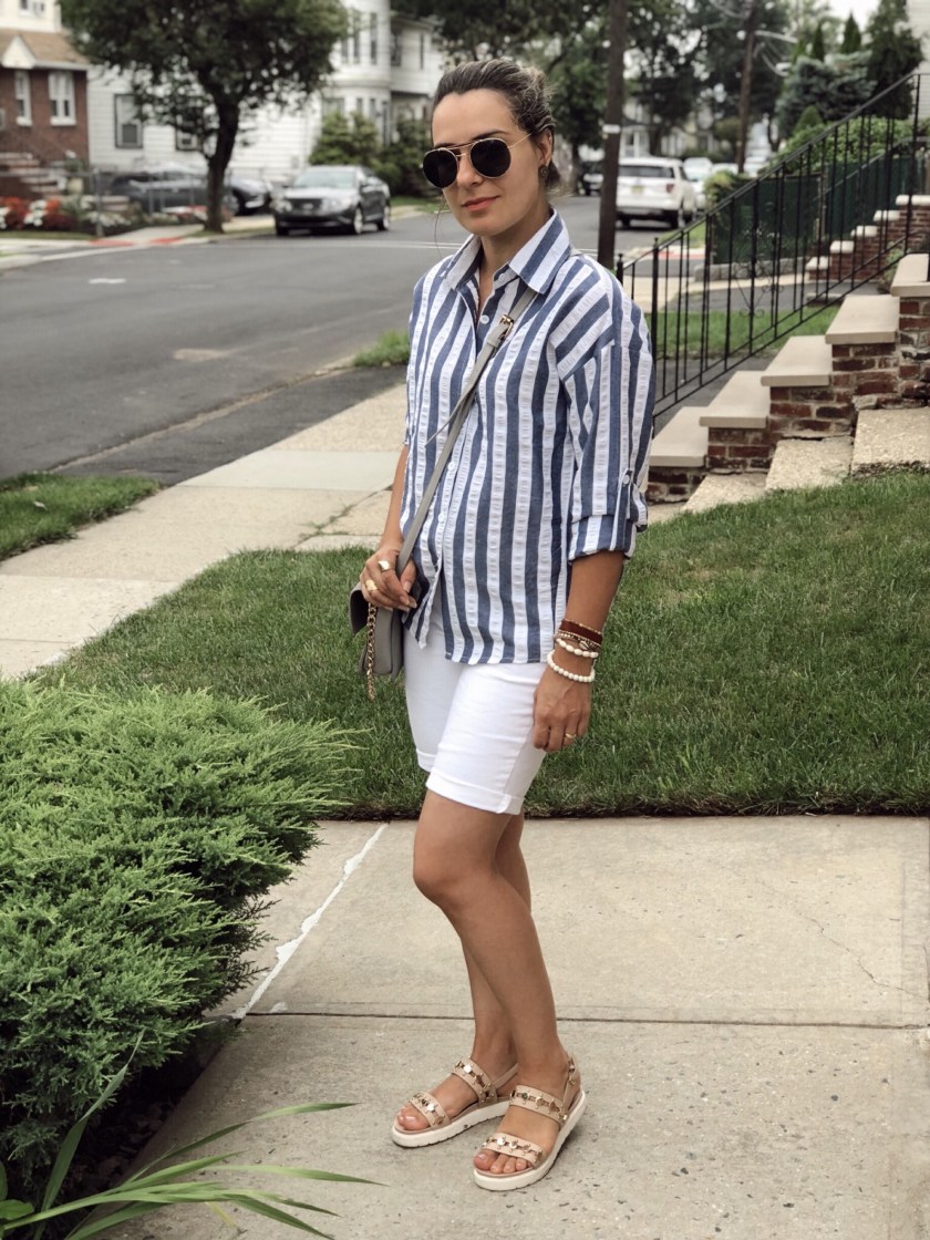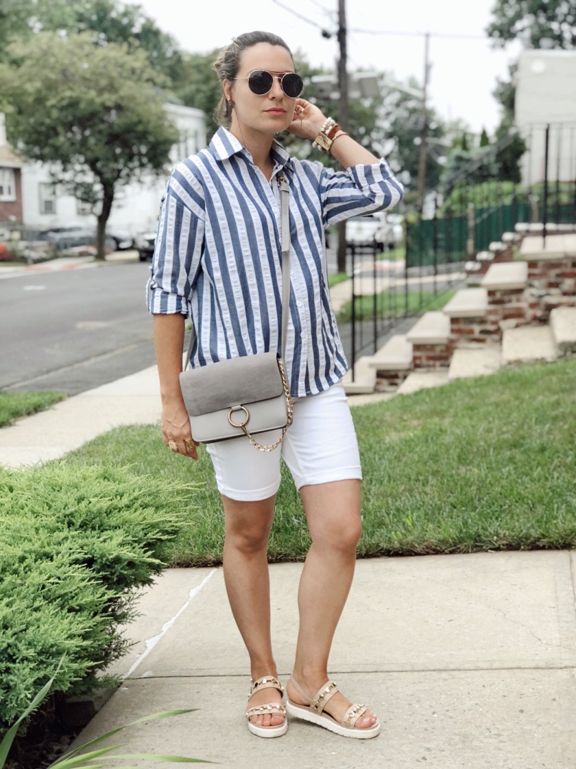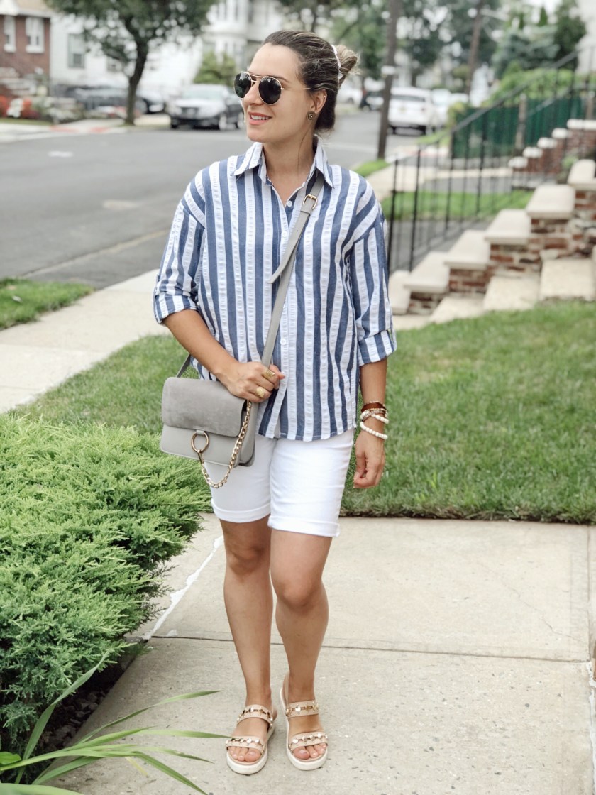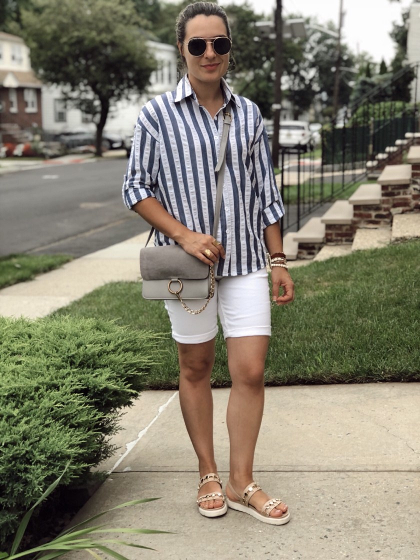 If there is one item I love and I can wear over and over I would say is a button down shirt. I love the versatility of this piece. It goes well with everything and you can wear it casually or with chic trousers for a work outfit for example. For today’s look I paired this striped down shirt with rolled sleeves from Shein with white bermuda and flat sandals. I love how cute yet comfy my outfit turned out to be.