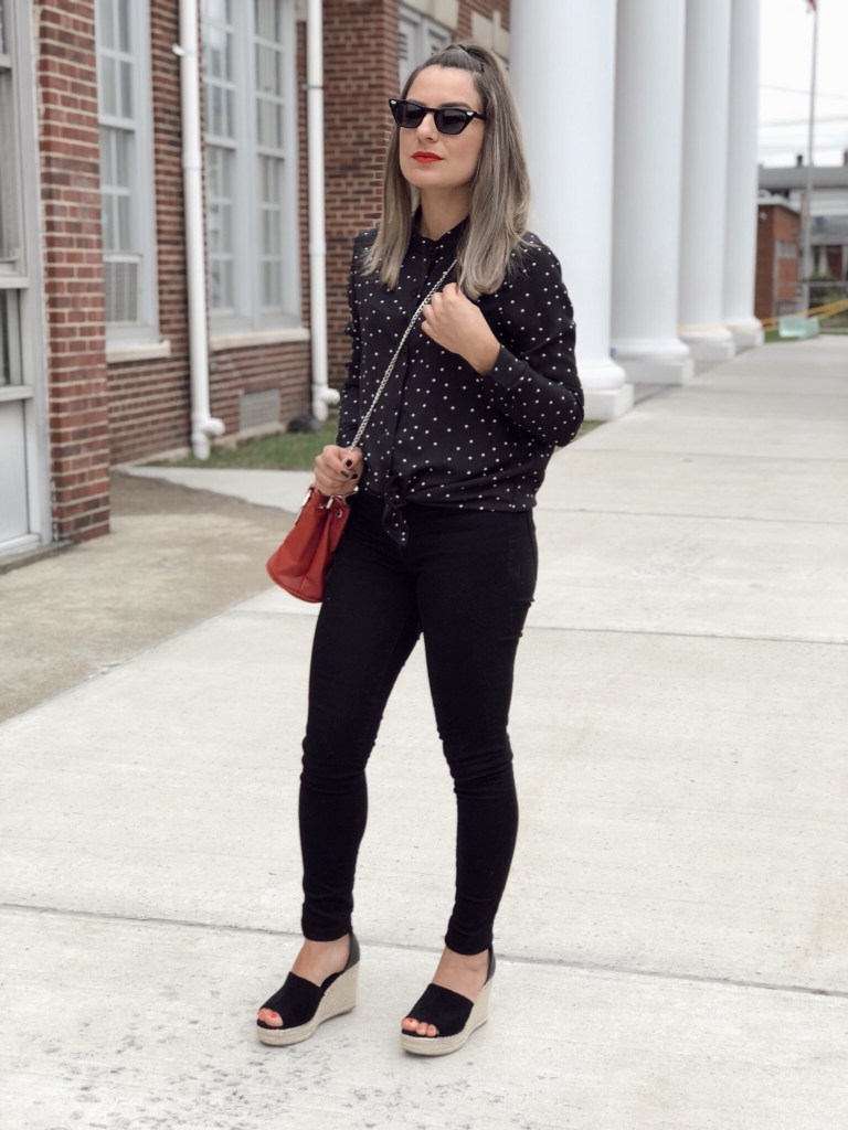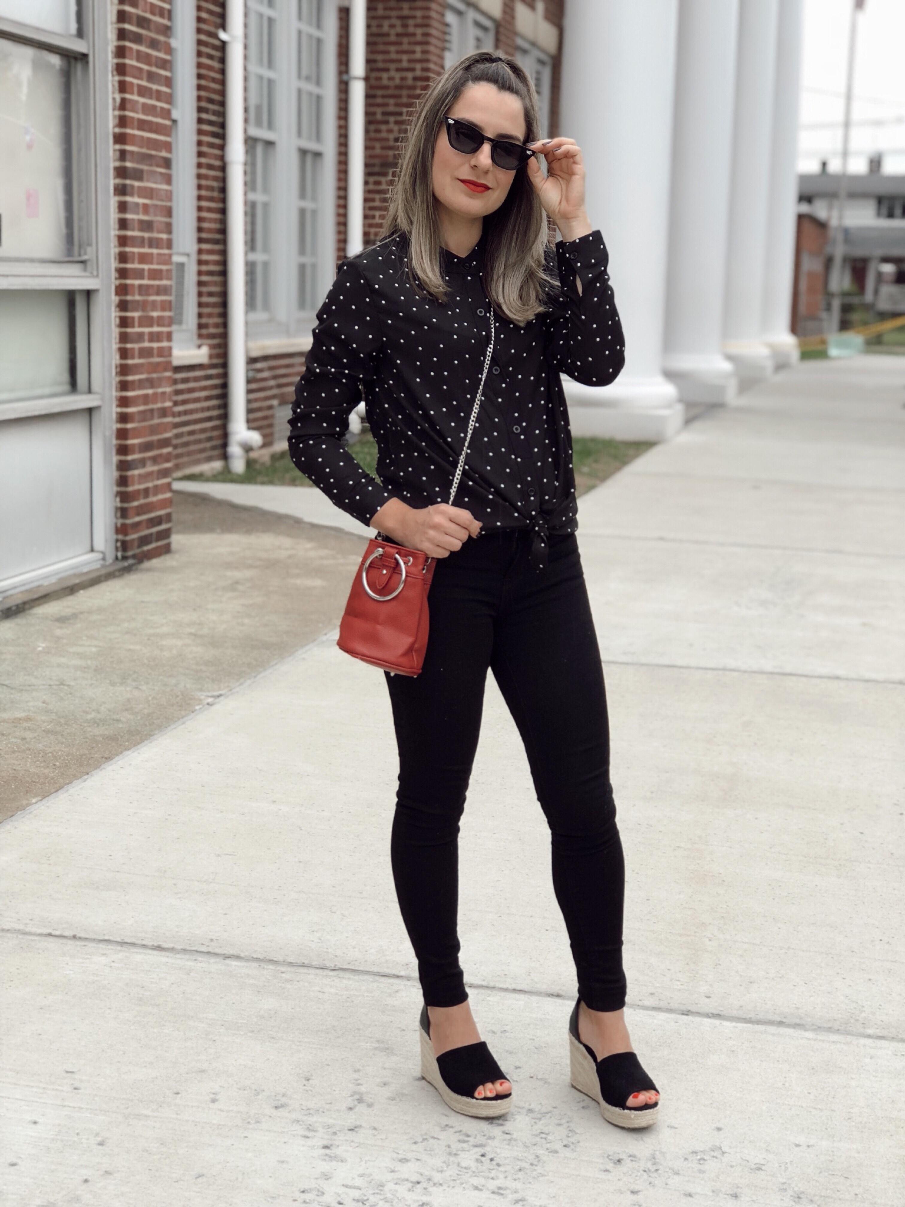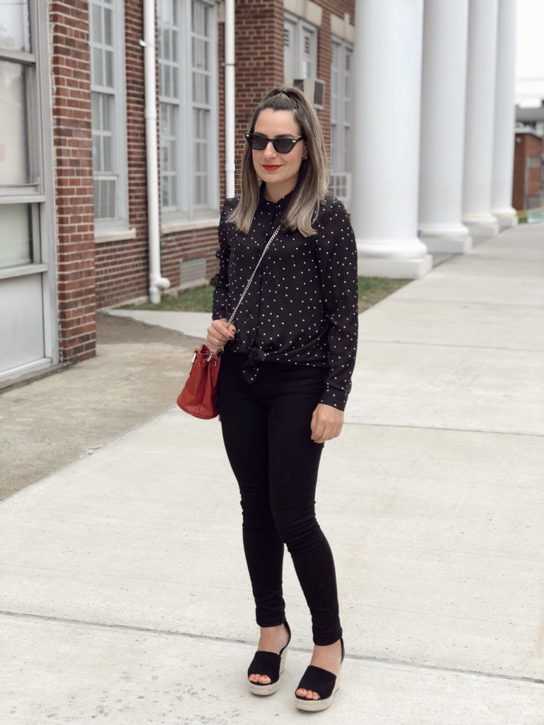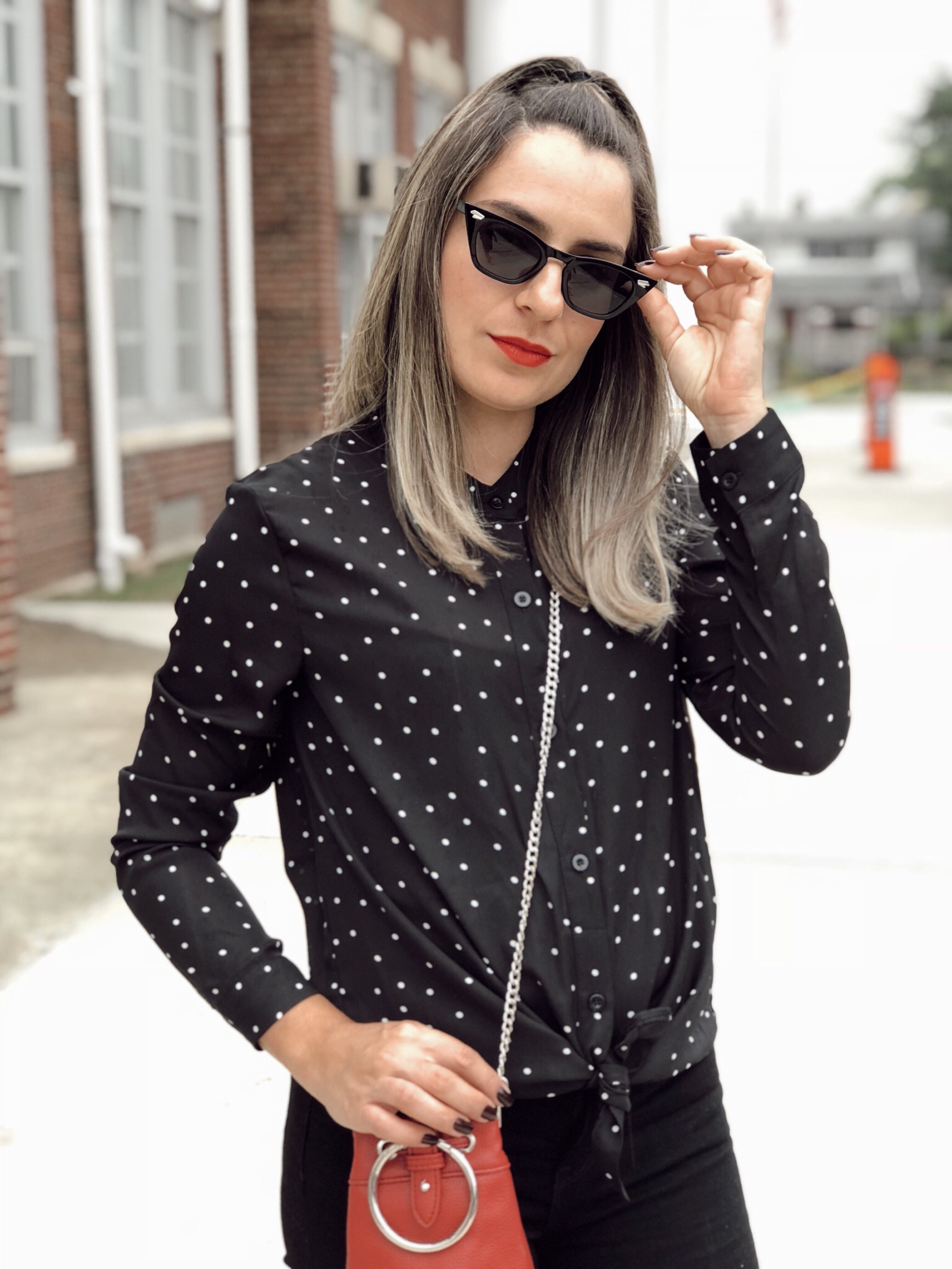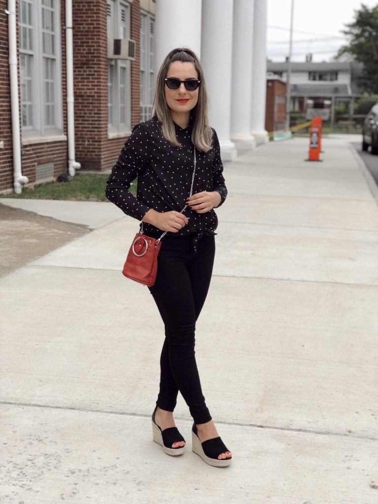 If there is one item I love to style and think is so versatile that would be a button down shirt. I love different ones and for today’s outfit I chose this mini polka dots shirt from Shein. I like to compose an all black look, it is so chic! I paired with black skinny jeans and plataform sandals. To bring a little color to the outfit I wore a red crossbody bag and red lipstick. I love how it came out. Super simple and classic and perfect for work or weekends.
