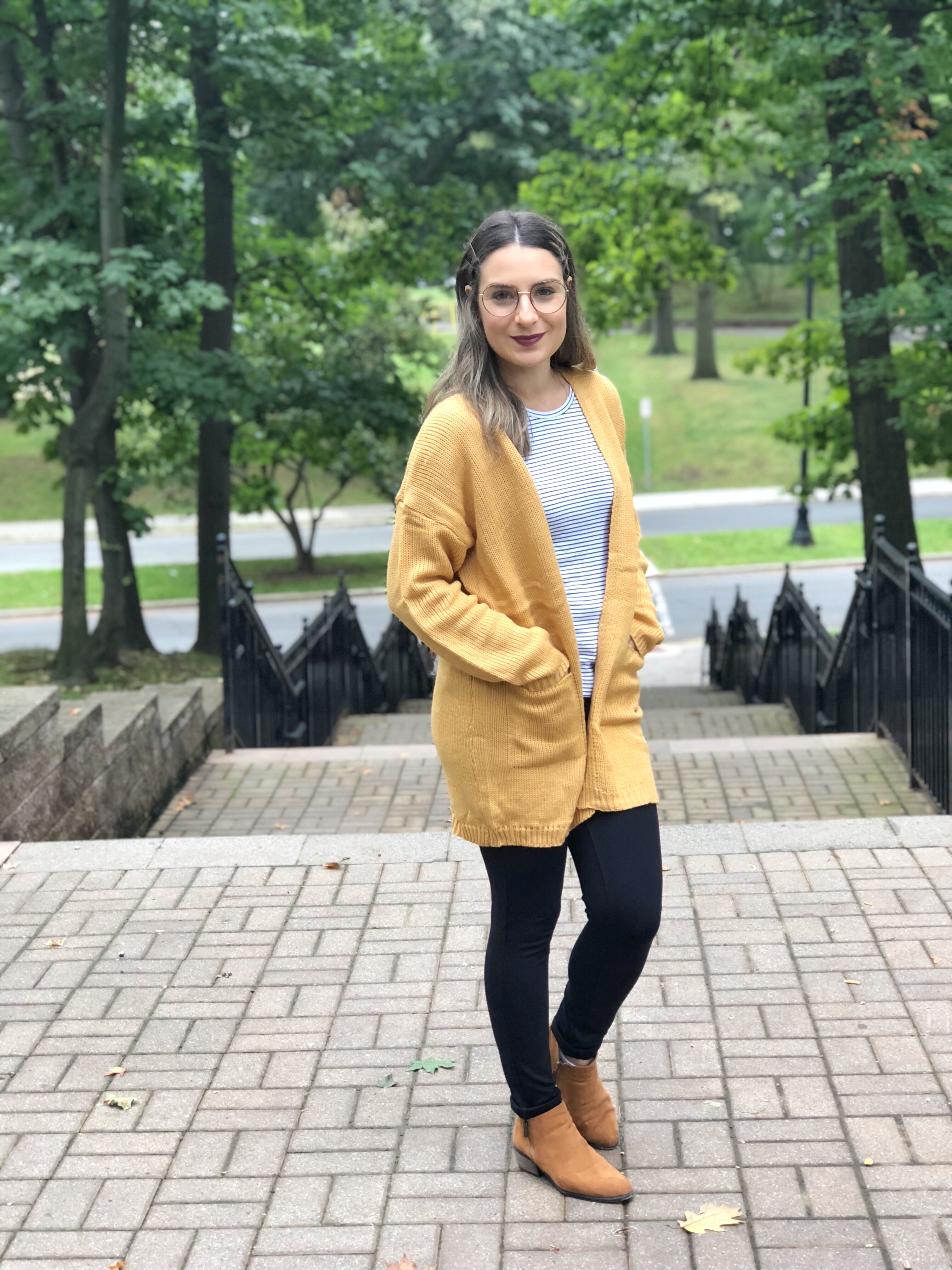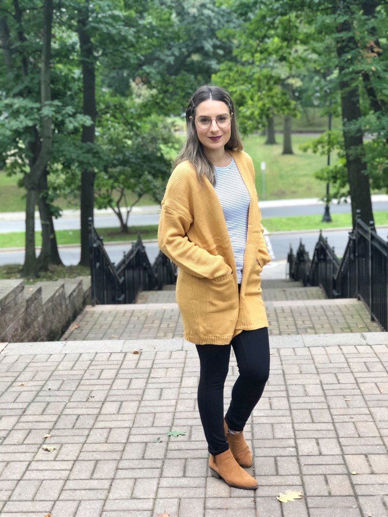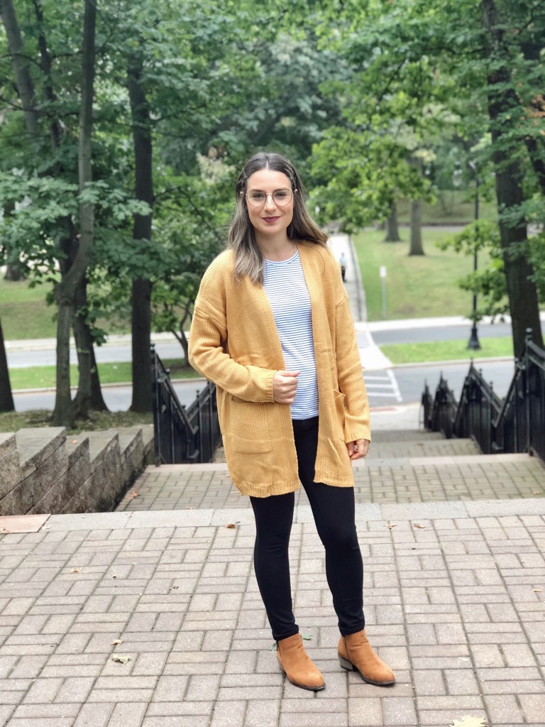 How was your weekend? As of usually, Sundays I always post my weekend outfit and today I wanted to share this cute fall fashion look. Its super comfy and cozy. I love cardigans for this cooler season. This one I picked is from Shein. The color is lovely and so trendy right now. The cardigan is open and has side pockets. Its long enought to cover your back. I paired it with black jeans and a stripped tee shirt. For the shoes I used low cut booties. I love this casual look.