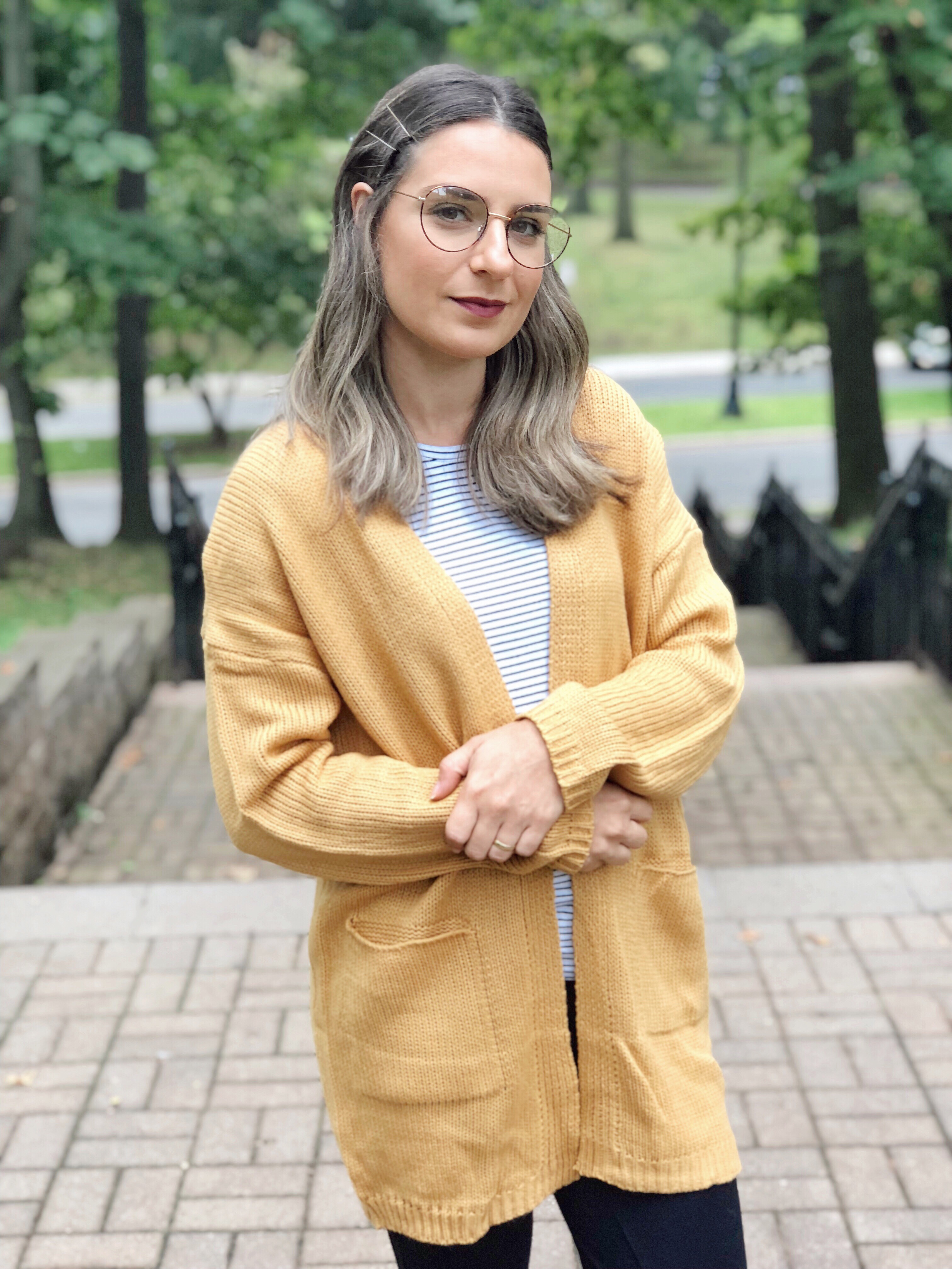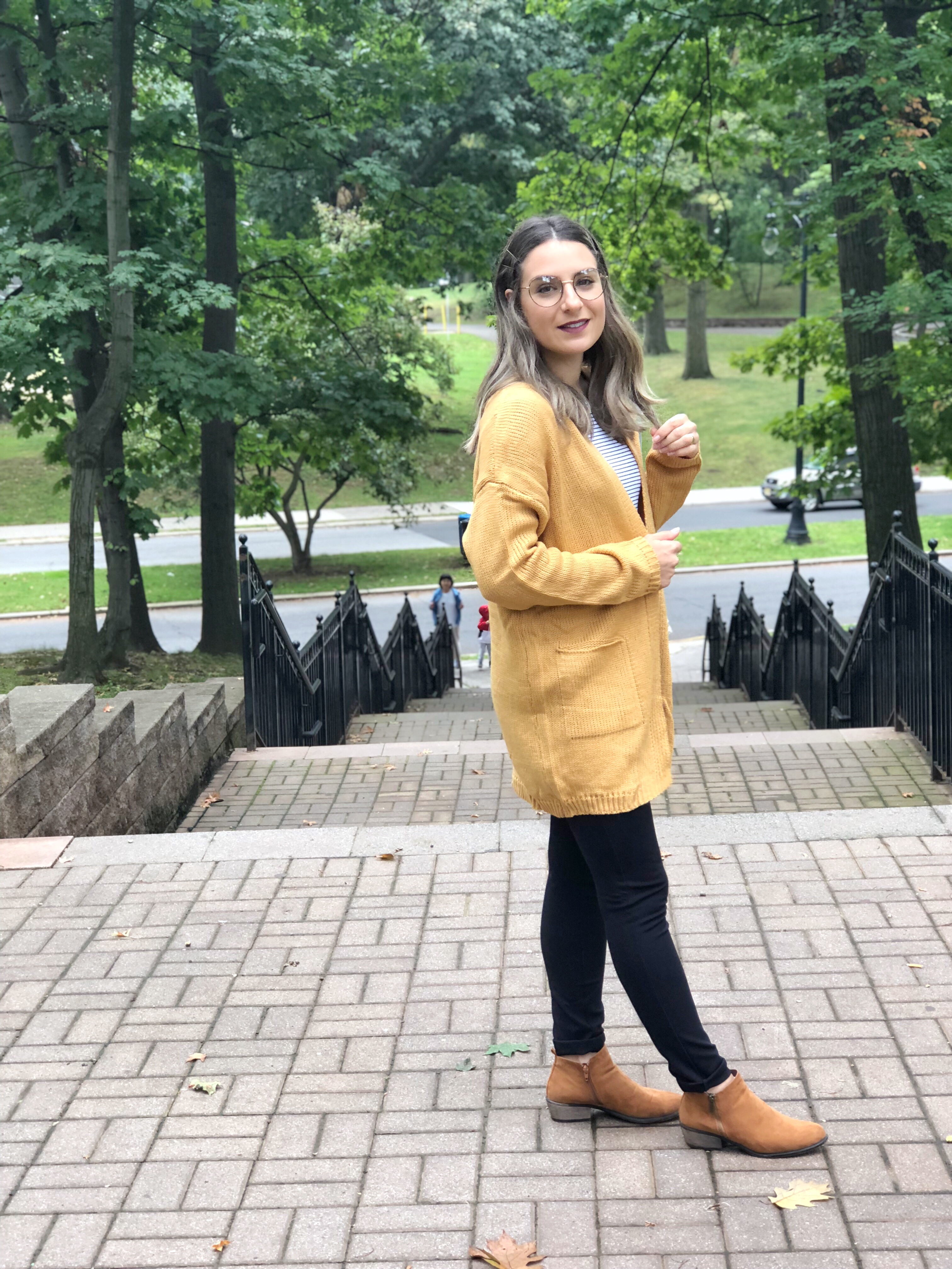 Como foi o seu final de semana? Como sempre, de domingo eu venho mostrar meu look do final de semana e hoje trago meu look de sábado super confortável e quentinho. O outono chegou de vez por aqui e eu adoro usar sueters e cardigans. Escolhi esse cardigan comprido da Shein. Ele tem bolso lateral e é aberto. A cor, um amarelo caramelo super em alta. Combinei com calca jeans preta e camiseta listrada. Nos pés botinha de cano curto. Adorei como ficou super casual e confortável.