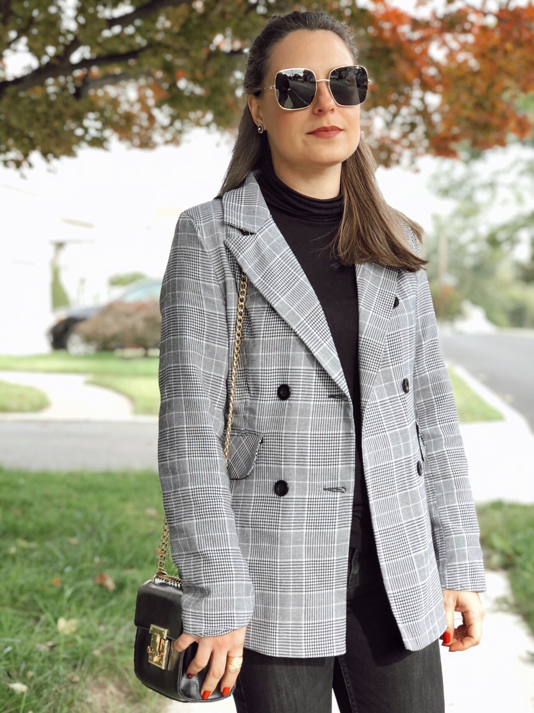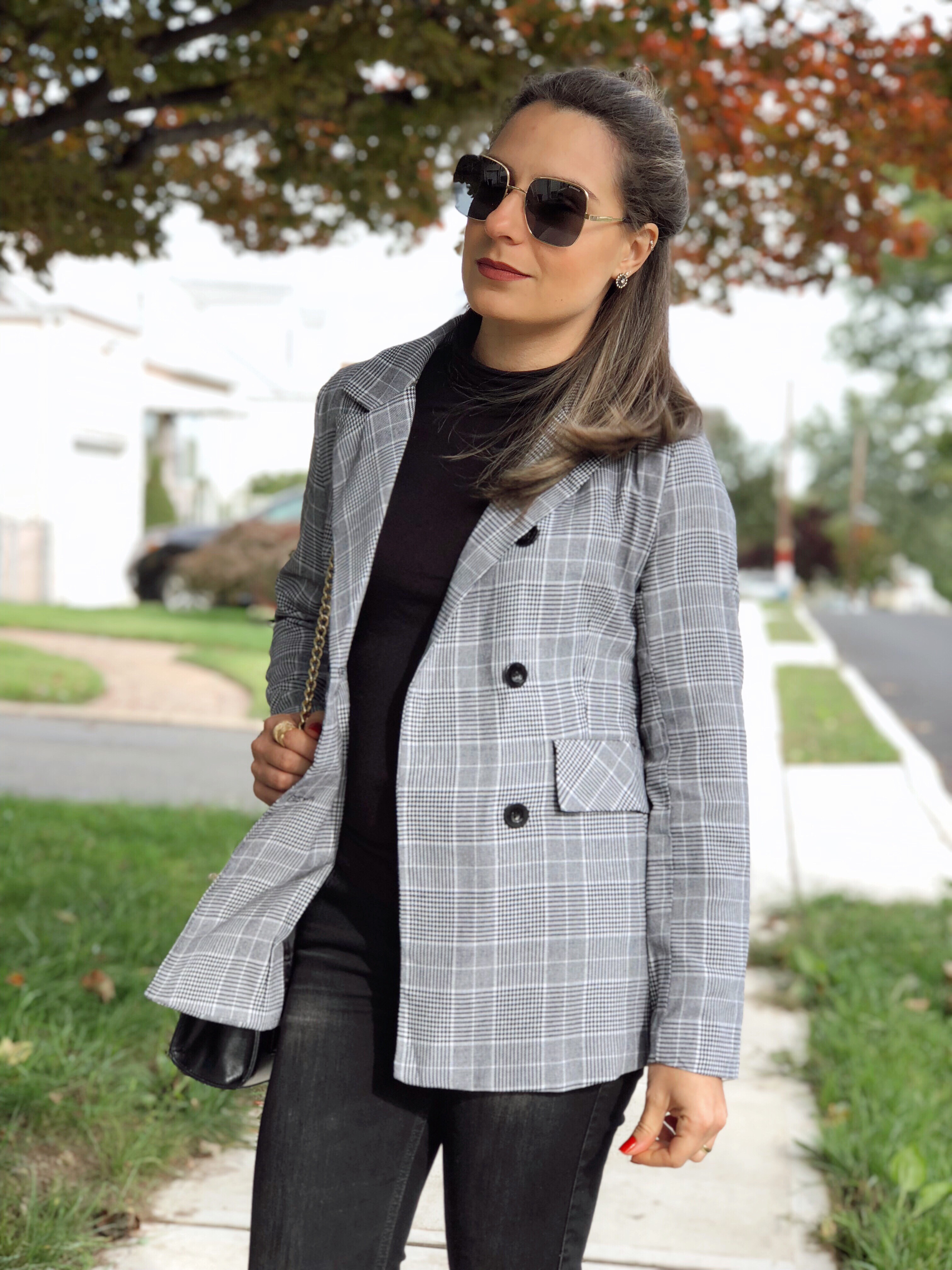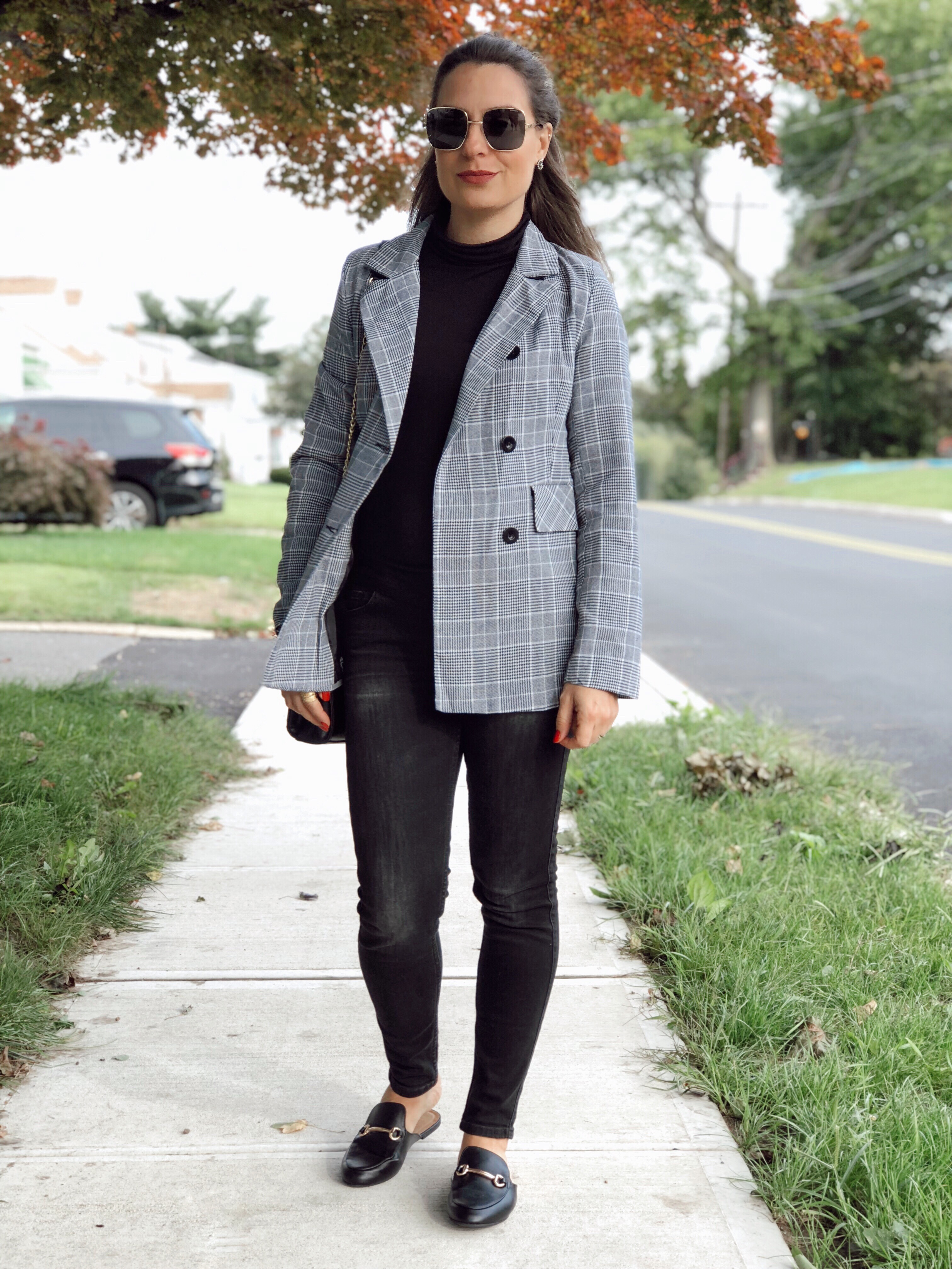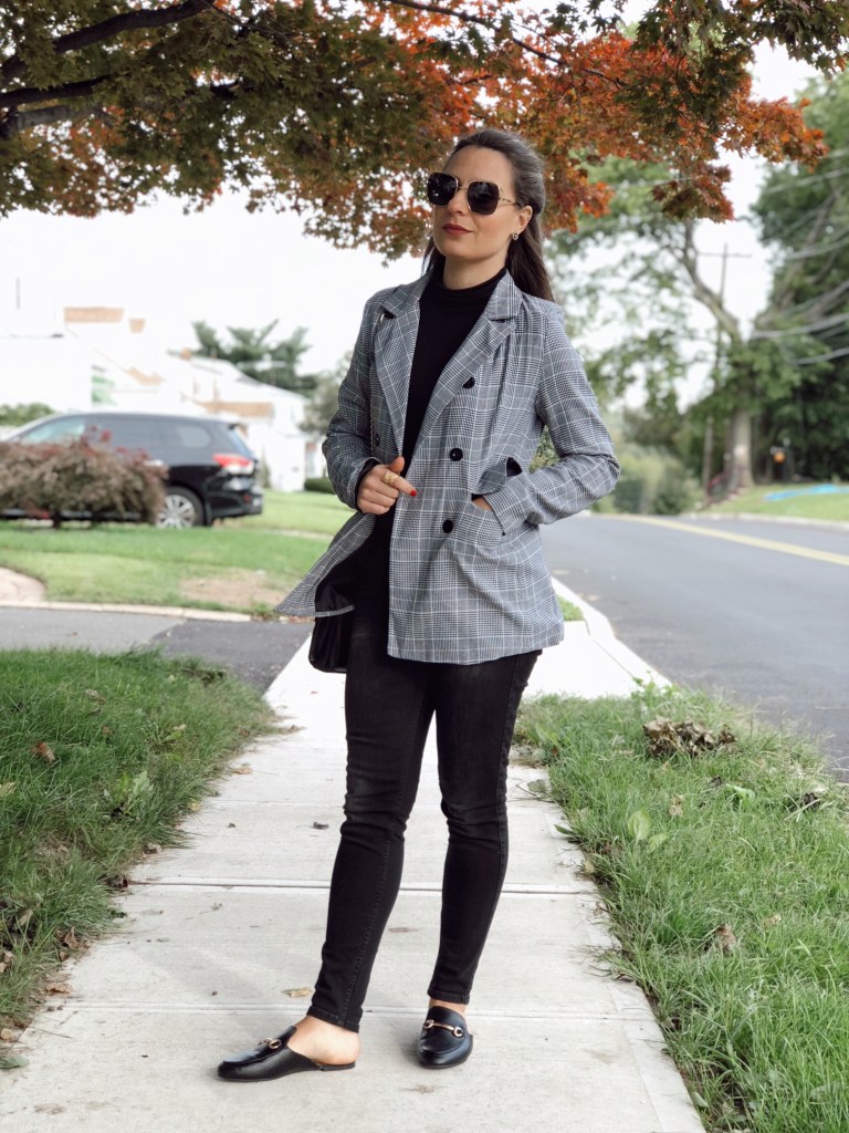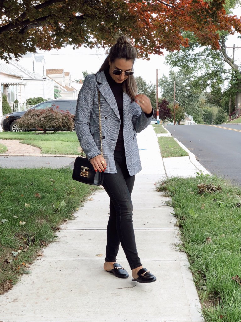 So today I bring one more outfit with my favorite wardrobre piece: blazer! As you guys know, I love this item. Its classic, casual and can dress up any look. For this outfit I choose an all black look and finished with a plaid blazer from Shein. I love how it falls bellow the waist for a more chic vibe. I finished with mules, super comfy and stylish. The days are getting cooler and cooler so a turtleneck was a good option.