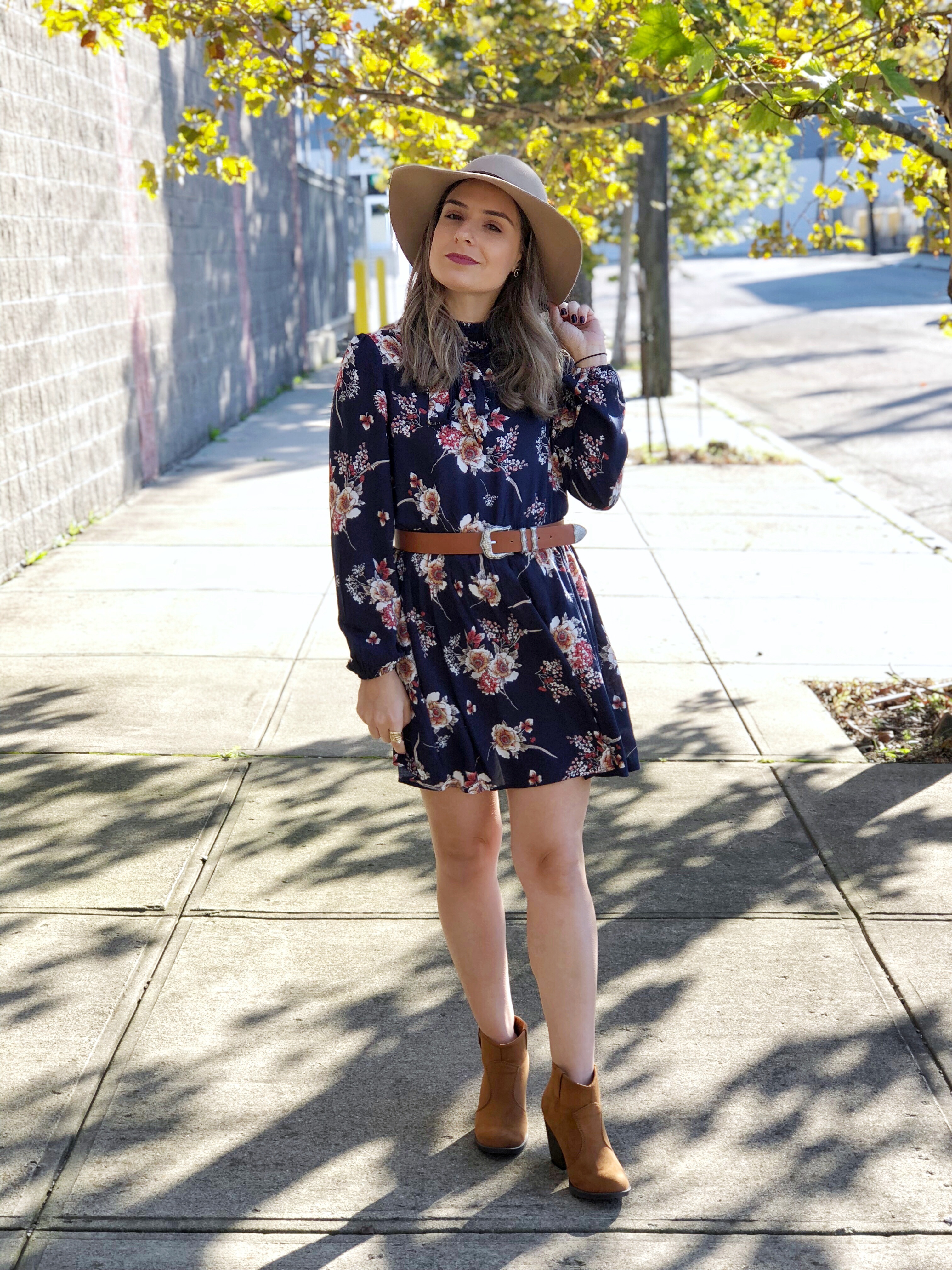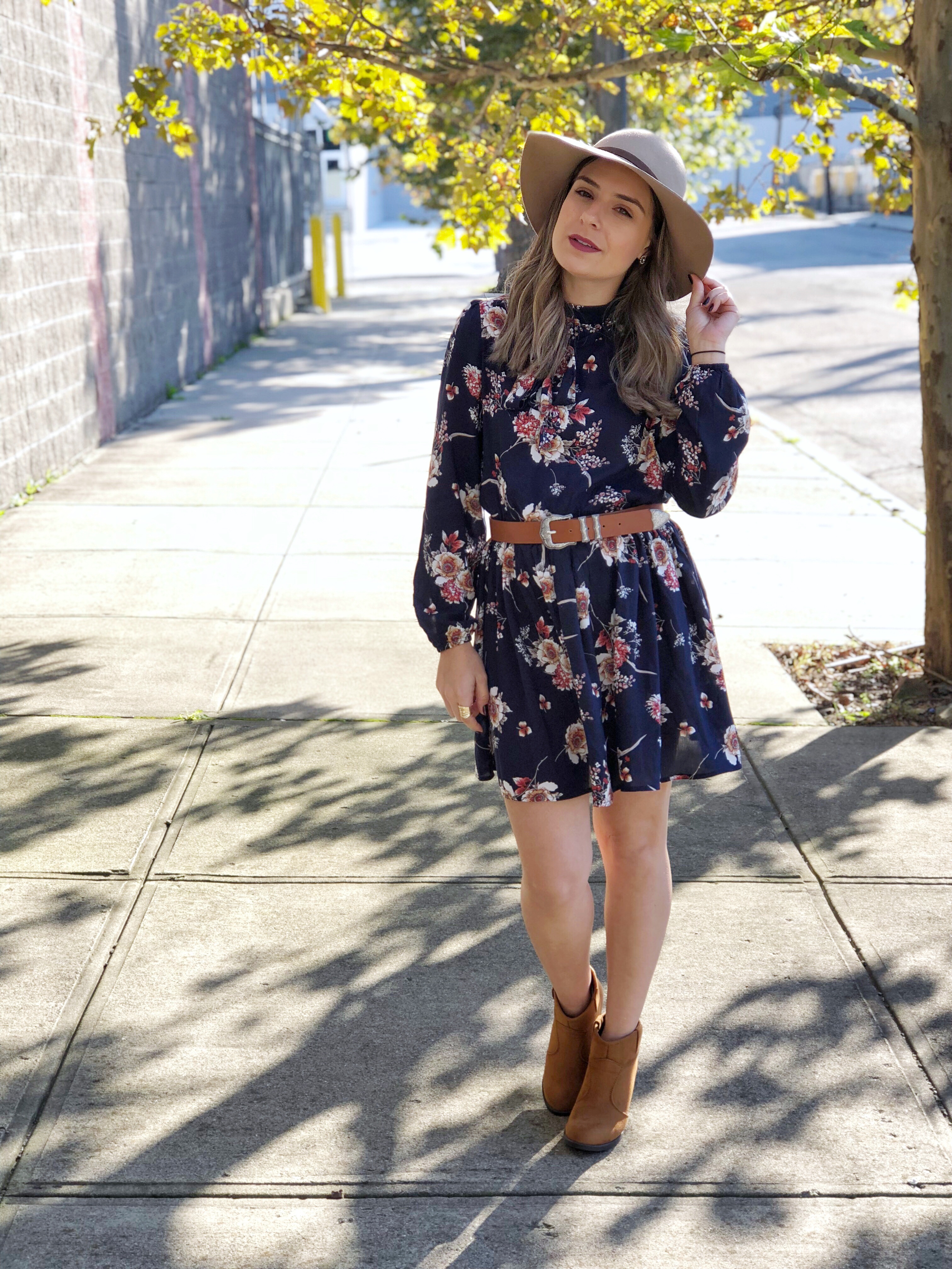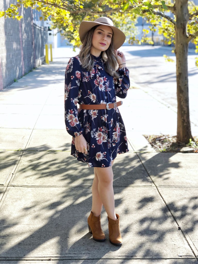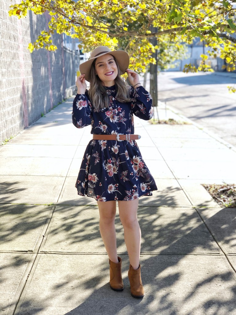 Happy Sunday! Its that time of the year again… boots, dresses, hats. I love to dress up for fall. So today I am going to show you guys this look I wore yesterday. Long sleeve dresses are my favorite for fall. I like to style it with leggings, boots and over the knee boots. This floral dress is from Shein. Its navy blue with floral print. I love this color combo. I paired with booties and a hat for a complete fall vibe. I also added a belt to look more put together.