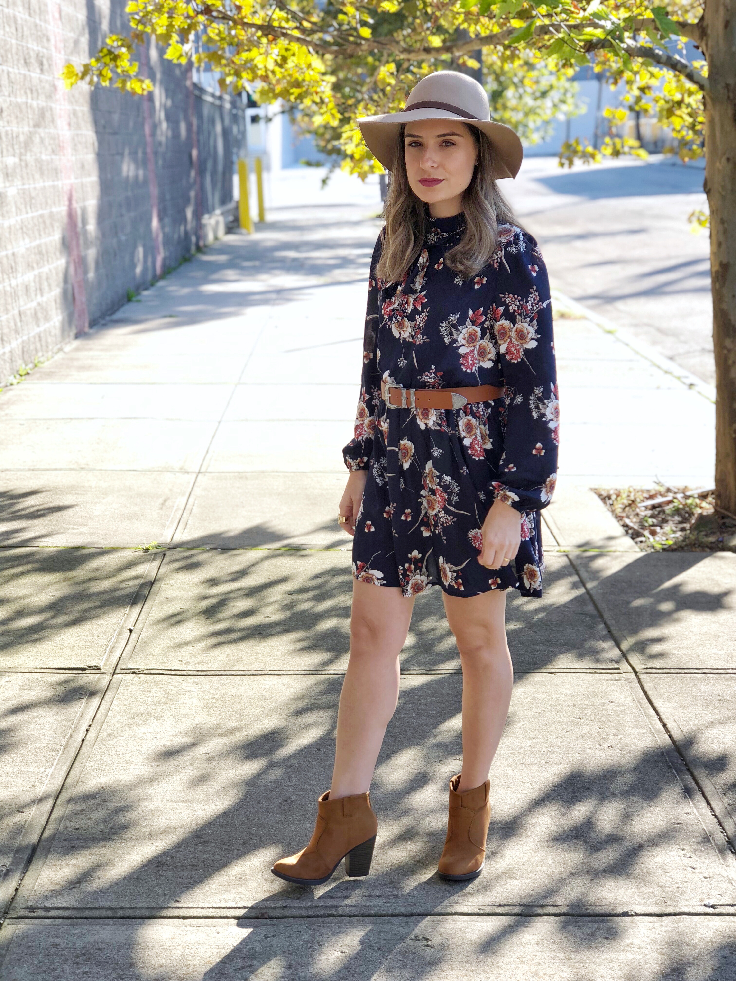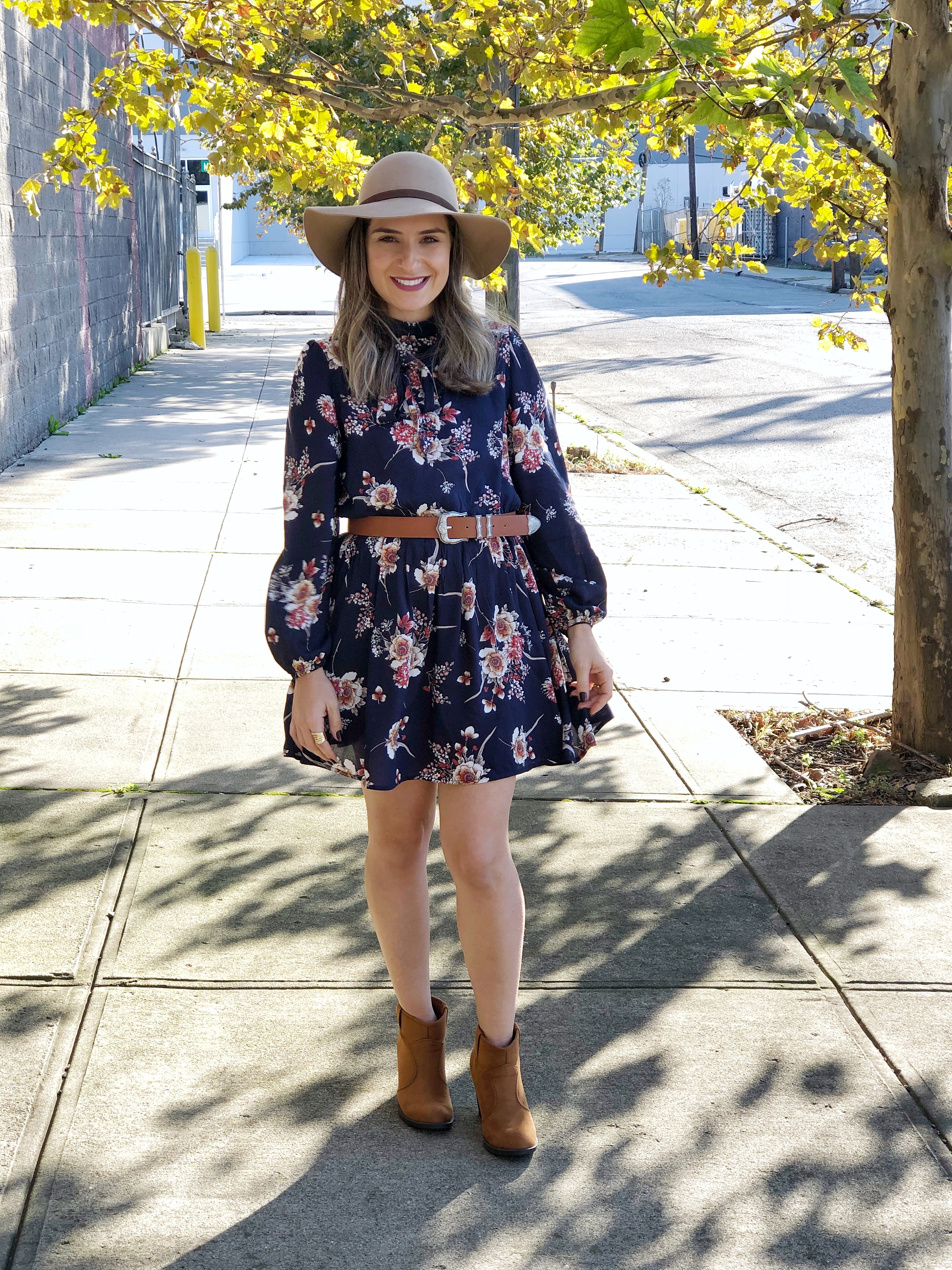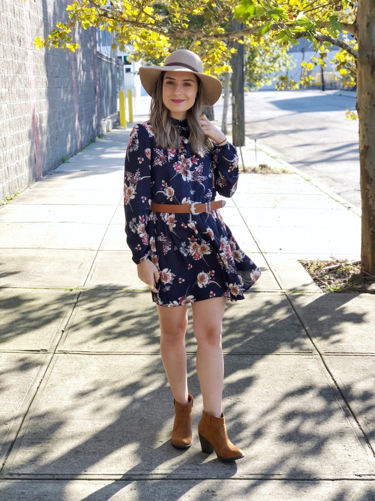 Happy Sunday! Its that time of the year again… boots, dresses, hats. I love to dress up for fall. So today I am going to show you guys this look I wore yesterday. Long sleeve dresses are my favorite for fall. I like to style it with leggings, boots and over the knee boots. This floral dress is from Shein. Its navy blue with floral print. I love this color combo. I paired with booties and a hat for a complete fall vibe. I also added a belt to look more put together.