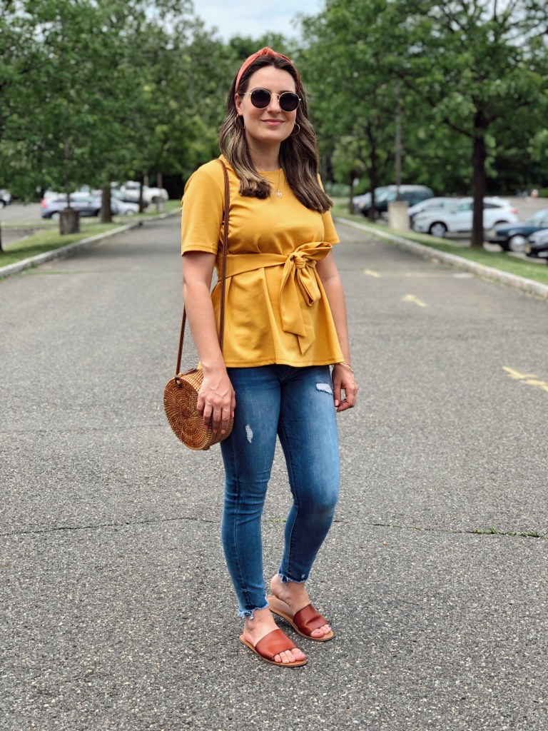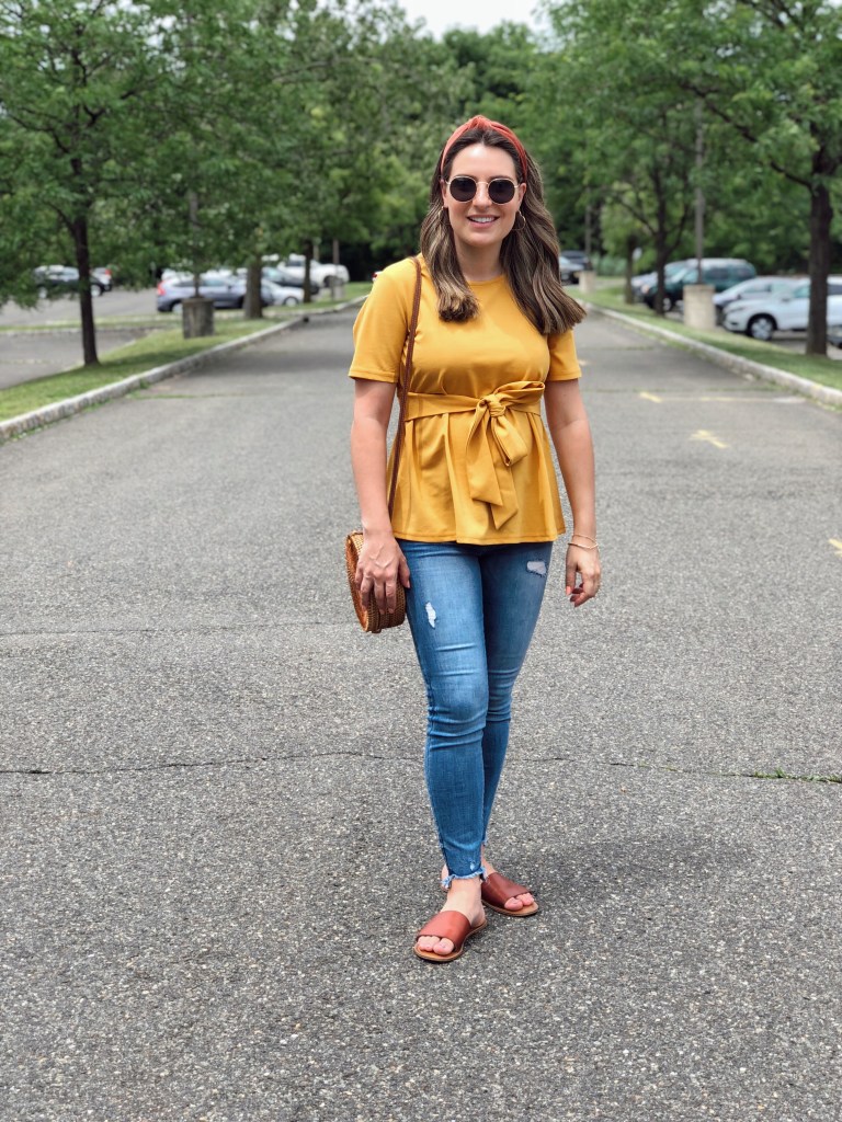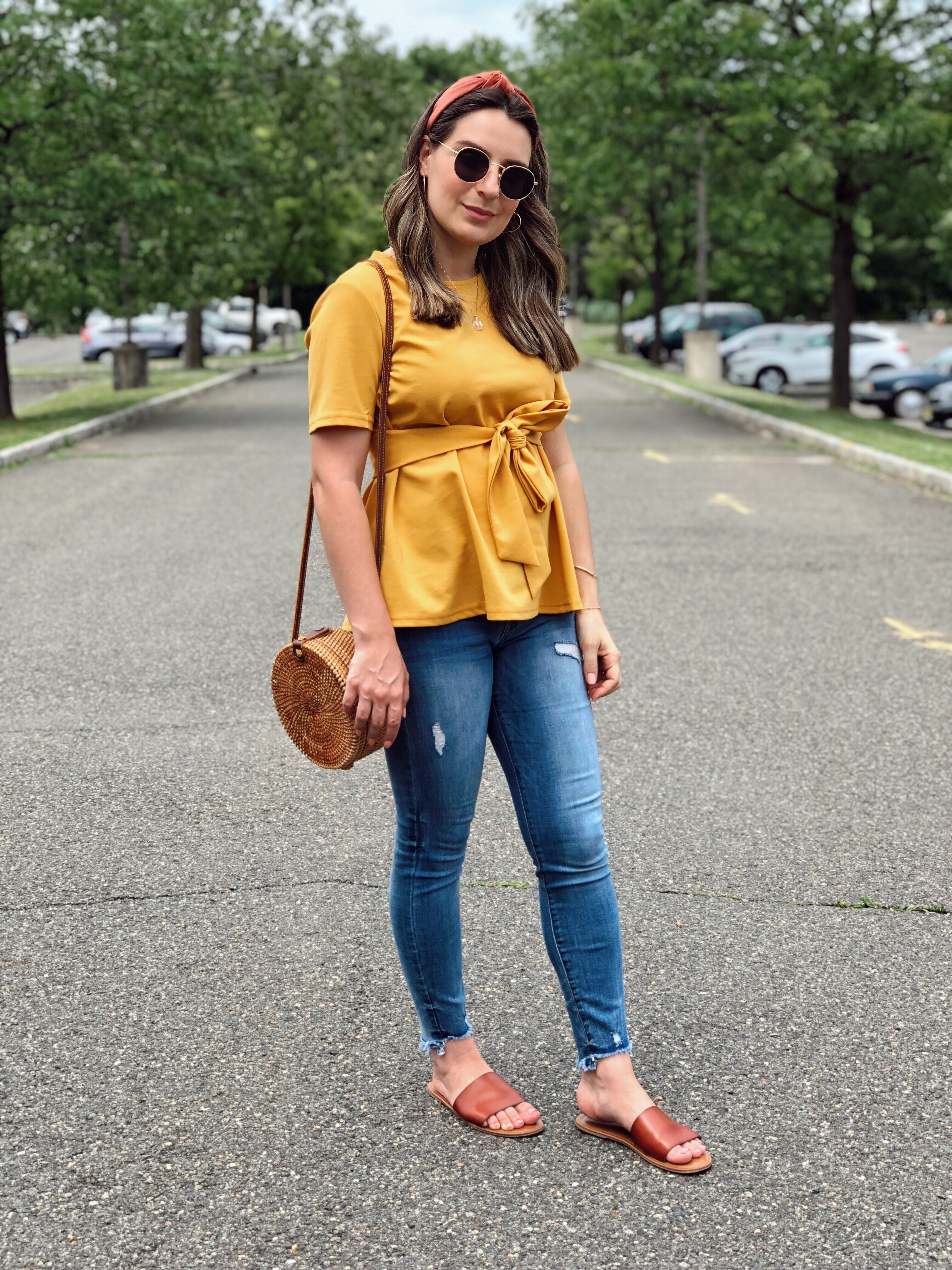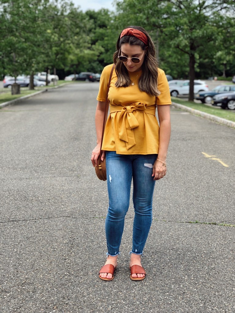 How was your weekend? We had a relaxing one enjoying time with the family. I have been using mostly casual and easy outfits so I can be comfortable to play around with my boys. One of my go to pieces now are tops that are a bit loose around my mid section because I just had a baby and I am not ready to use anything too tight hehe. So I found this pretty yellow mustard top from Shein. It has a built in belt that you tight at the front and gives the look an extra charm. It looks really cute with jeans, skirt or black pants. I wore it very casual with skinny jeans and flat sandals. I am loving this yellow mustard color for summer and I paired it with some caramel/ brown acessories that are so trendy right now. This top was only $9 and the belt on the belly helps hide my post baby belly lol. You can use my code 4padoni20 to get an extra 15% off any purchase at Shein until June 30th! http://bit.ly/2E5JWaY search ID 707170