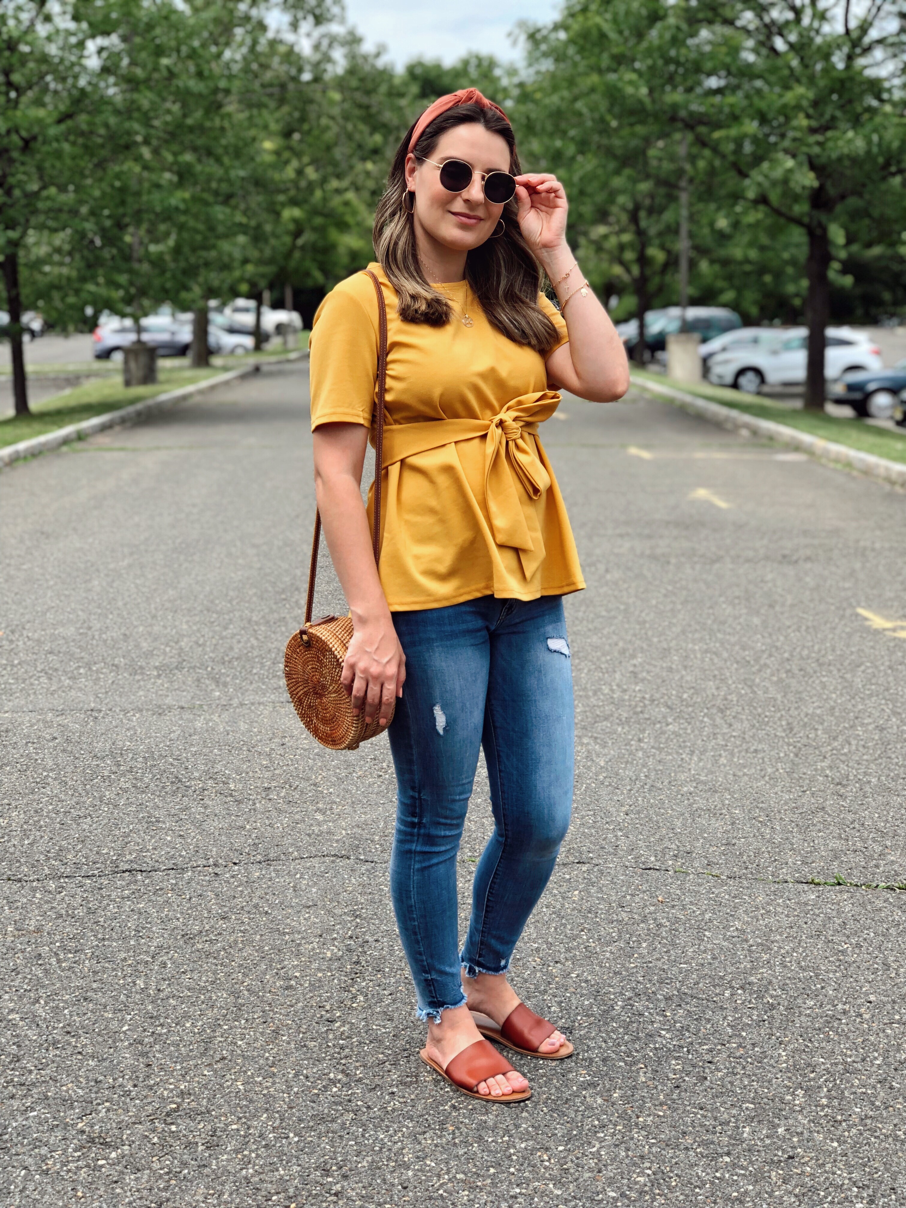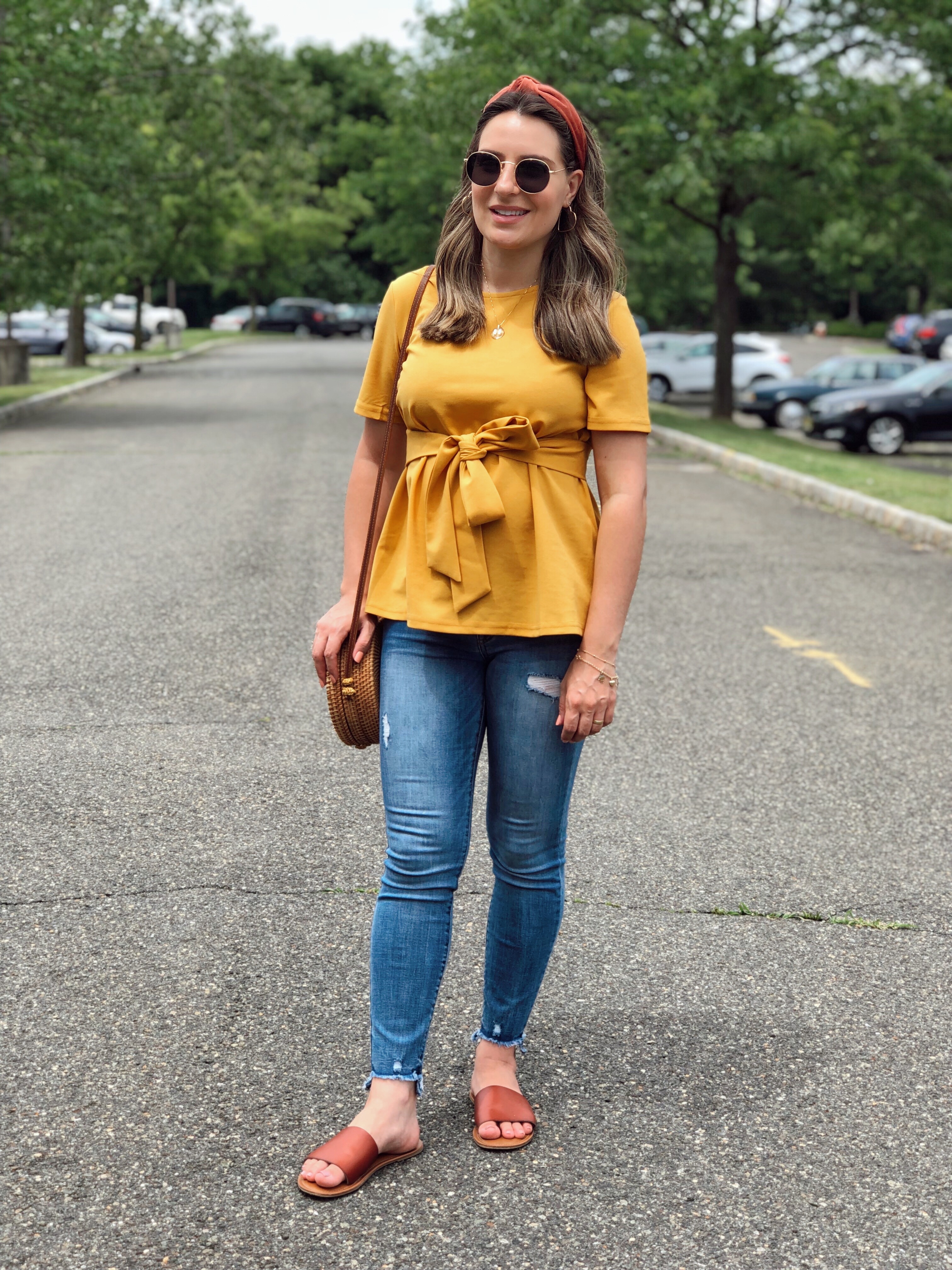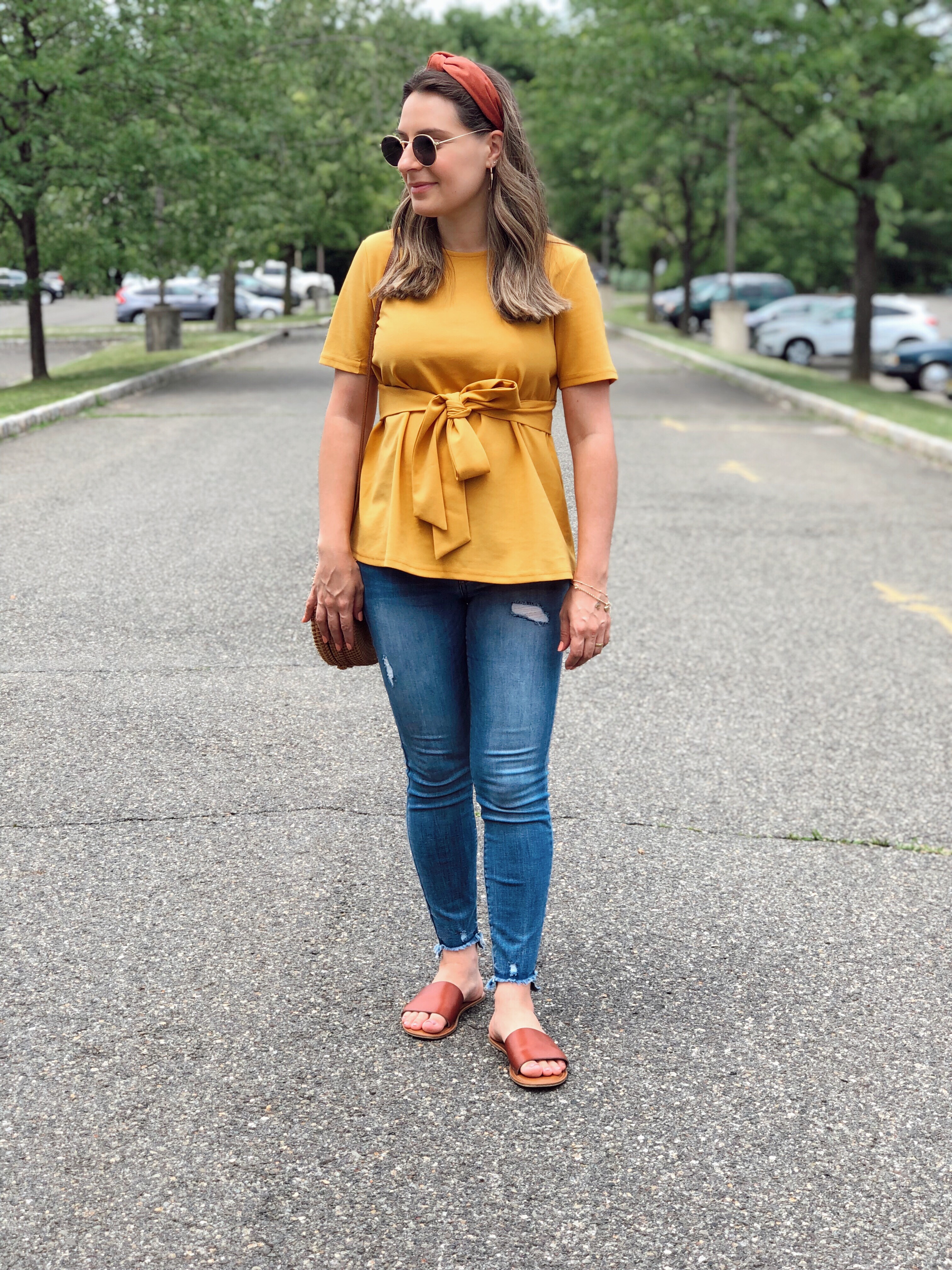 How was your weekend? We had a relaxing one enjoying time with the family. I have been using mostly casual and easy outfits so I can be comfortable to play around with my boys. One of my go to pieces now are tops that are a bit loose around my mid section because I just had a baby and I am not ready to use anything too tight hehe. So I found this pretty yellow mustard top from Shein. It has a built in belt that you tight at the front and gives the look an extra charm. It looks really cute with jeans, skirt or black pants. I wore it very casual with skinny jeans and flat sandals. I am loving this yellow mustard color for summer and I paired it with some caramel/ brown acessories that are so trendy right now. This top was only $9 and the belt on the belly helps hide my post baby belly lol. You can use my code 4padoni20 to get an extra 15% off any purchase at Shein until June 30th! http://bit.ly/2E5JWaY search ID 707170
