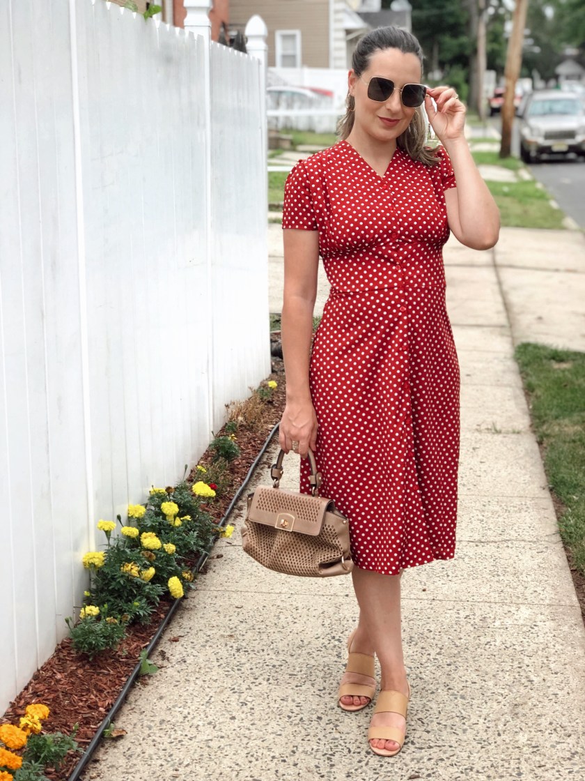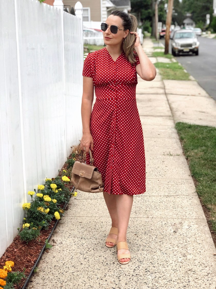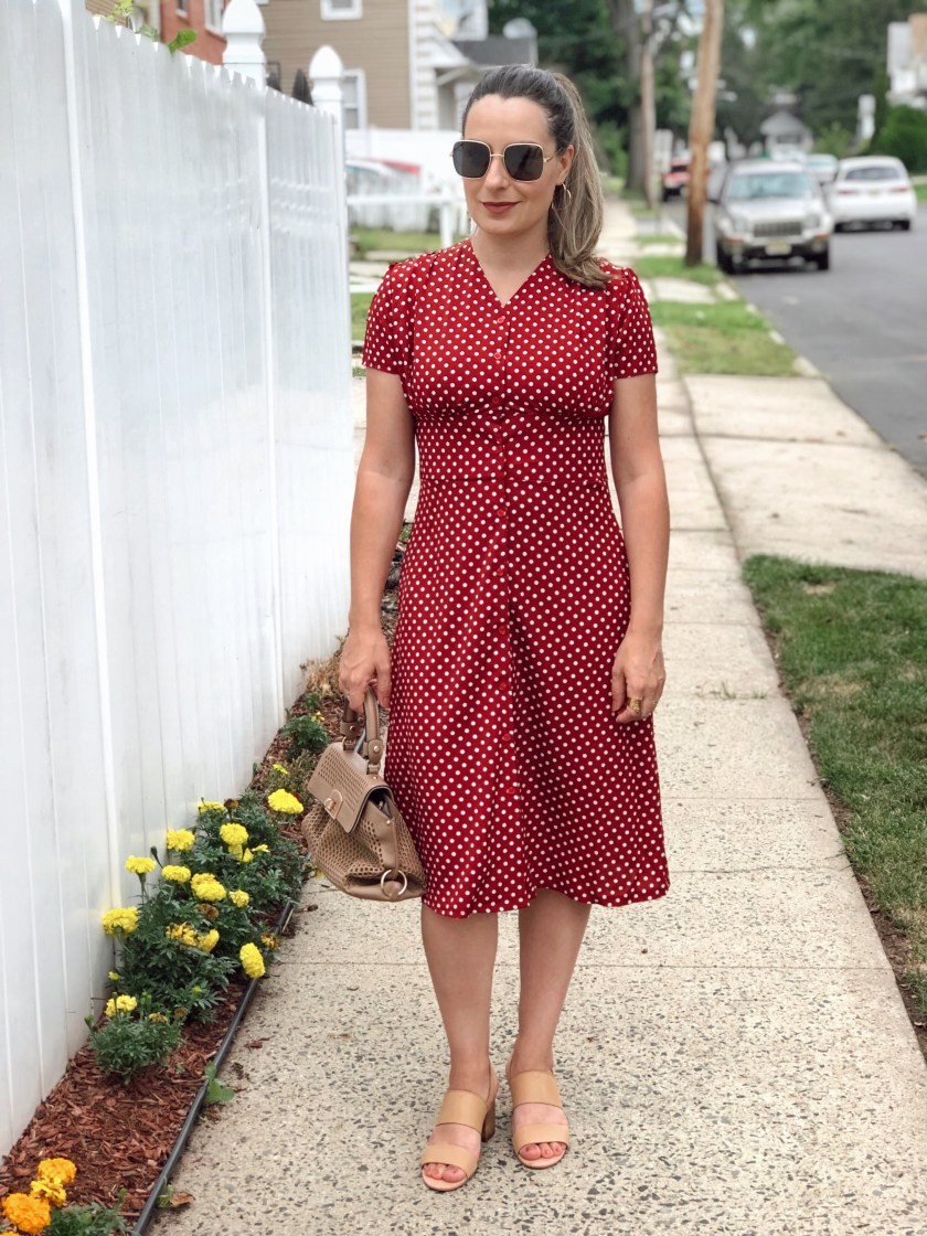 Last year we saw the revival of many retro prints. First up, it was gingham, and then polka dots invaded all of our wardrobes and they are still going strong. The once old fashioned spotty print has been given a makeover and it’s all over the place. I particularly love this print and think is such a classic and lady like. So when I saw this polka dot dress in burgundy I felt in love. A polka dot midi dress requires little-to-no styling, and it’s perfect for this busy mama. I also love that this one is button down which makes it so easy for breastfeeding my baby. This is from Shein and there are a few other colors to choose from and they are only $17. Plus if you use code 4padoni20 you can get an extra 15% off. I paired with nude sandals, but it looks great with slide sandals now for the summer!