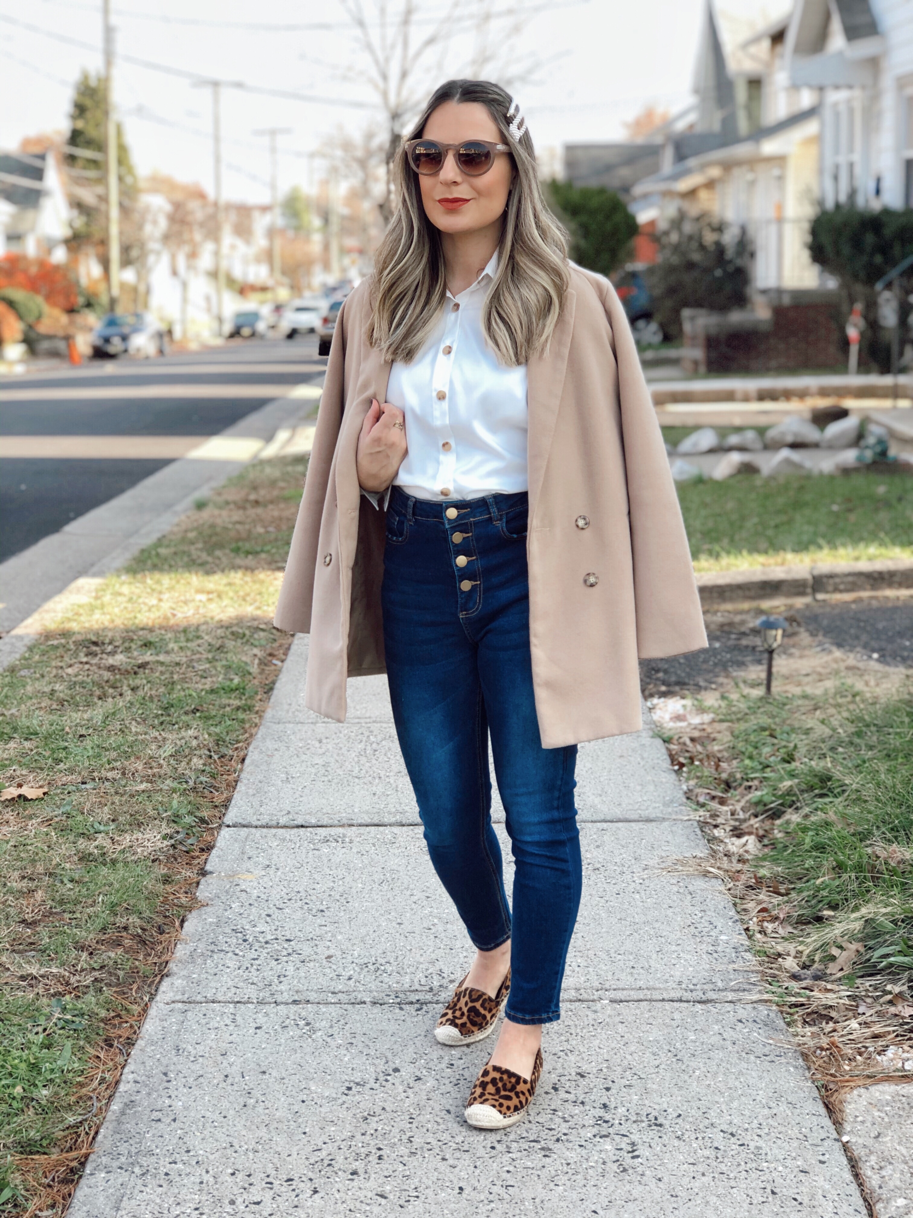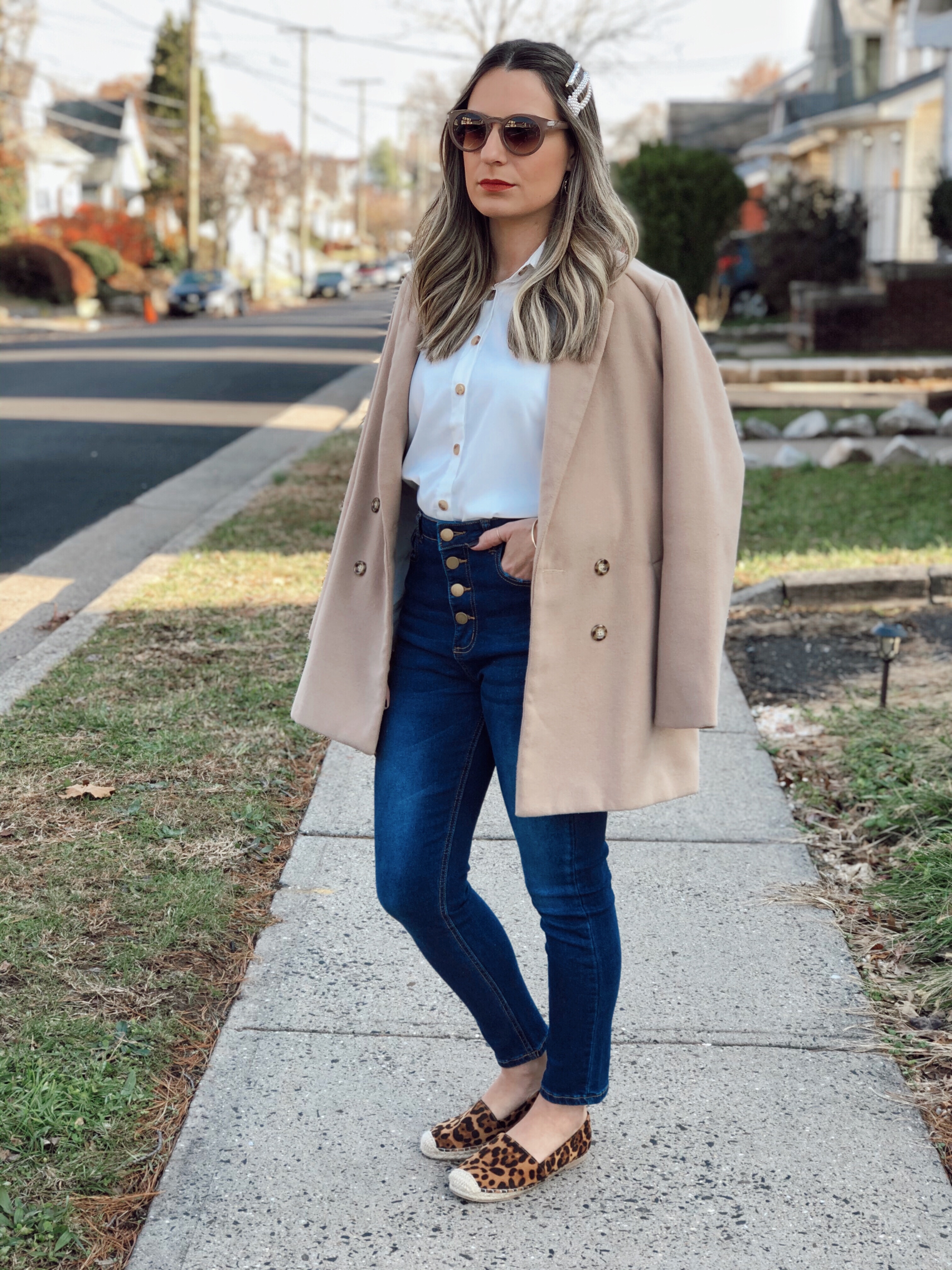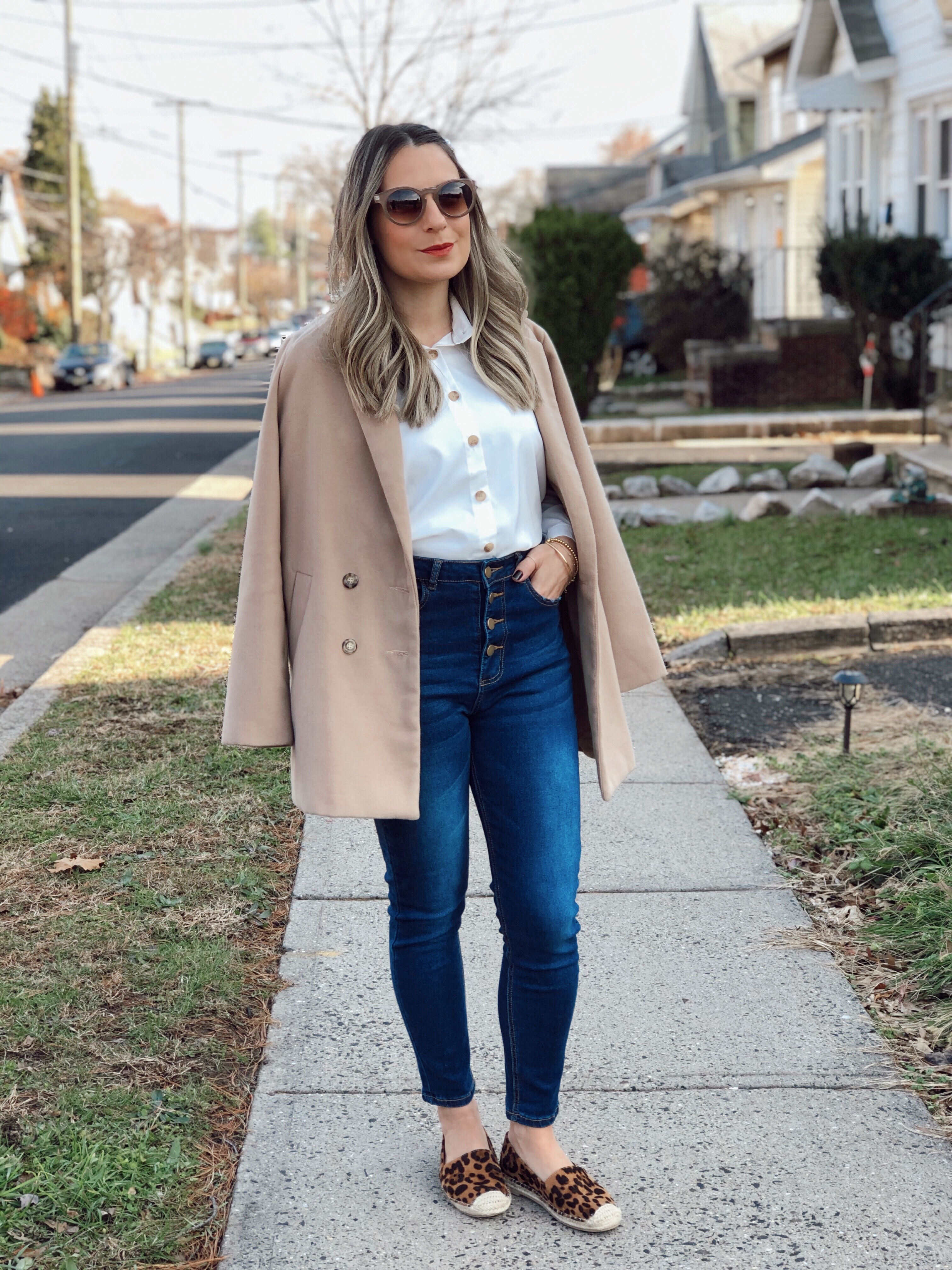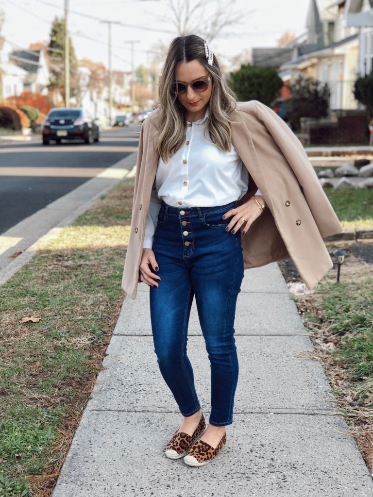 The first look I am using this white shirt that I really love. I am a big fan of white button down shirt. It goes with a lot of outfits and you can dress it up or down. For this outfit I wore the white shirt with button jeans and a peacoat on top. For shoes I chose this very comfortable espadrilles. Its perfect for day to day use.