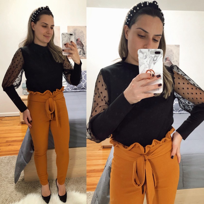 This last outfit is a great option for the holiday parties. I will probably be using this for Christmas with the family. I love the high waisted pants with this beautiful black top. The sleeves are so pretty and add a chic vibe to the outfit.