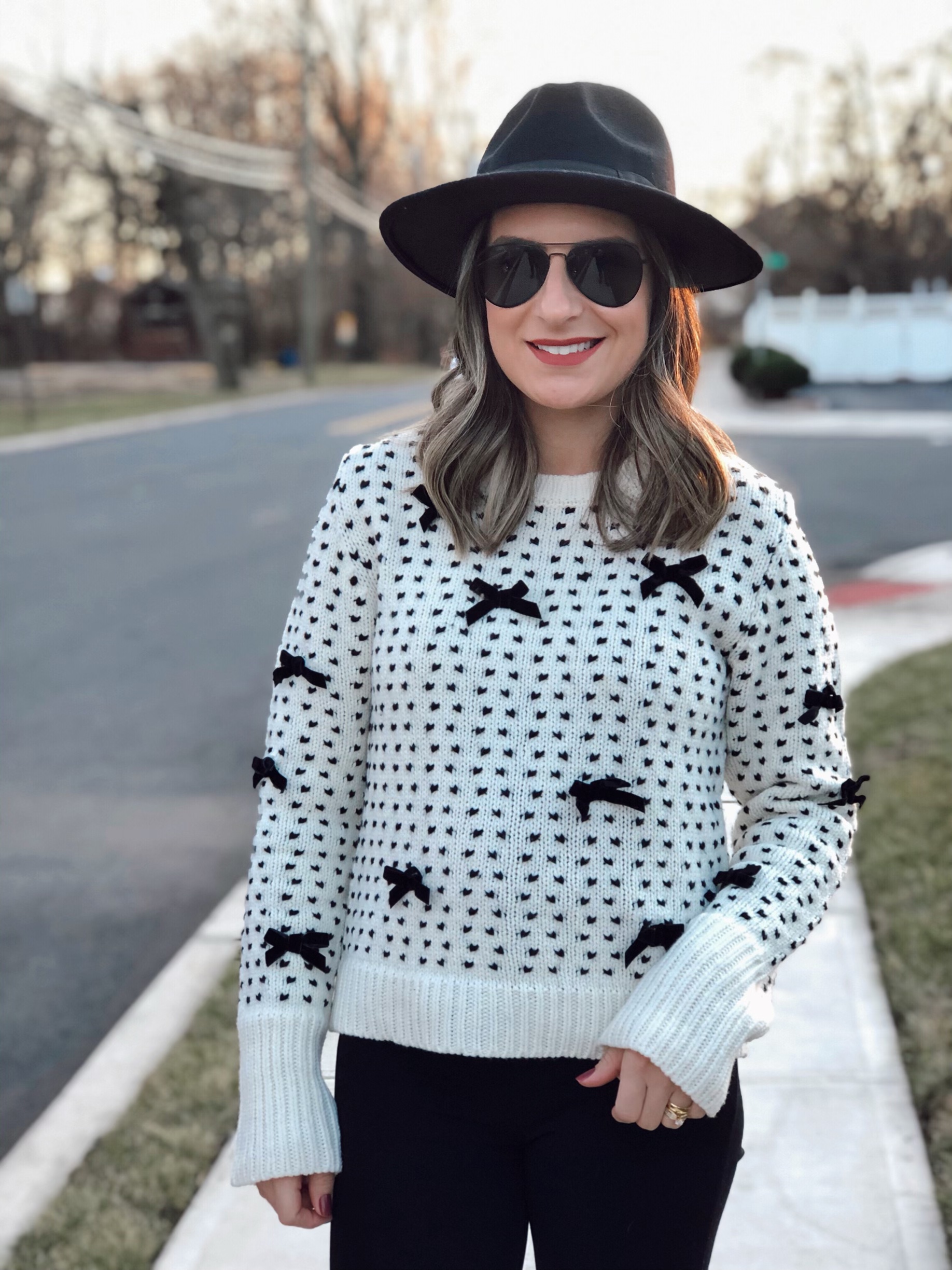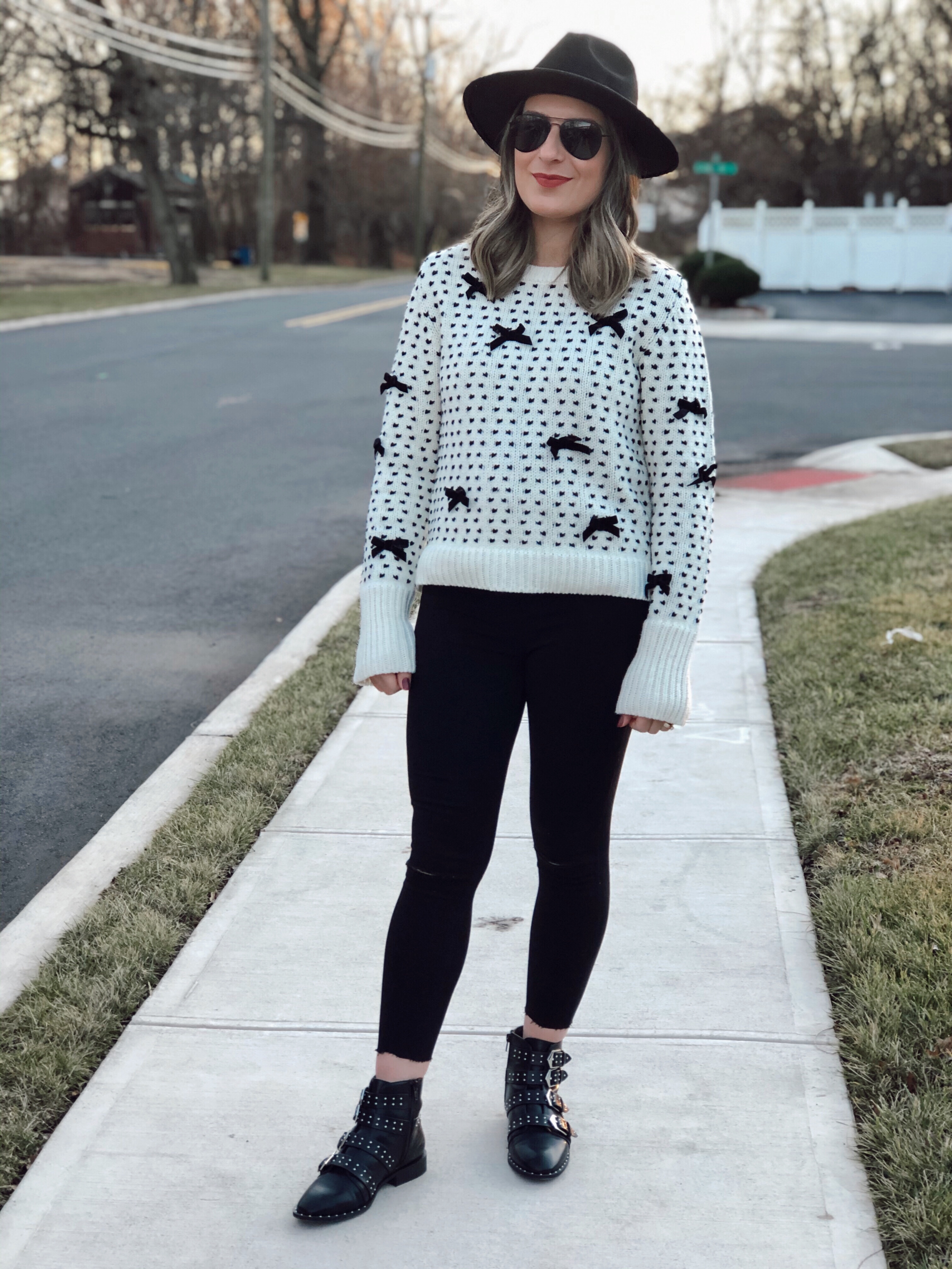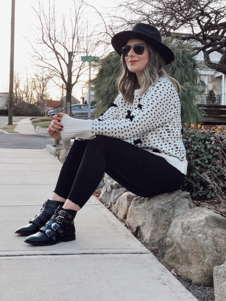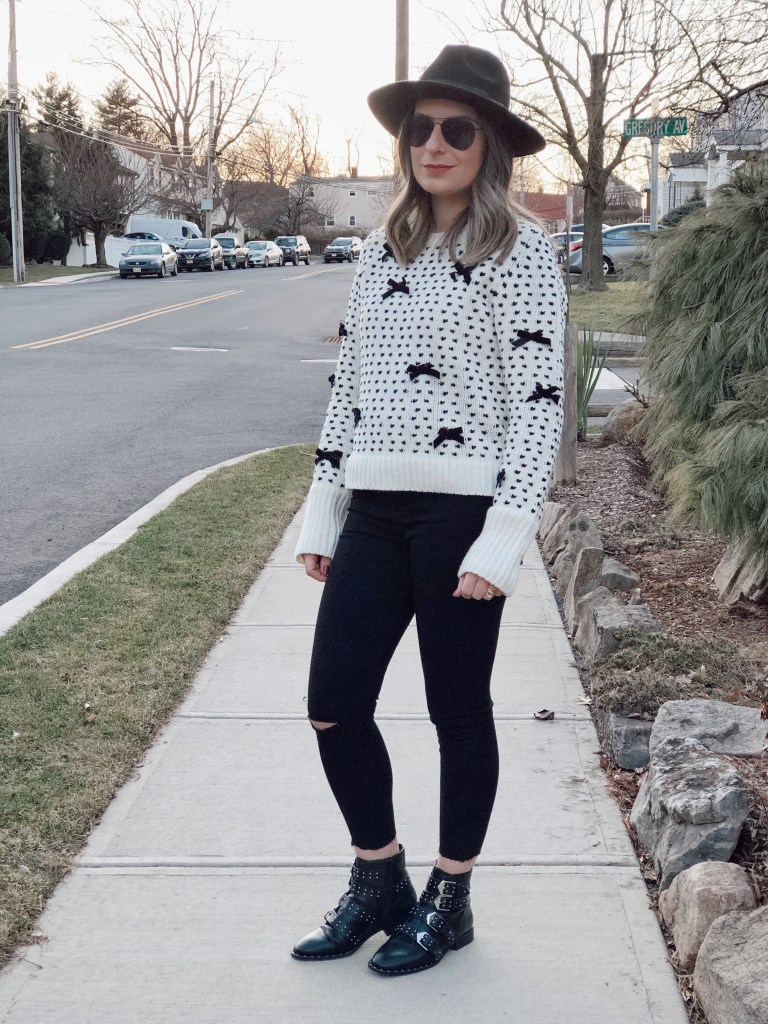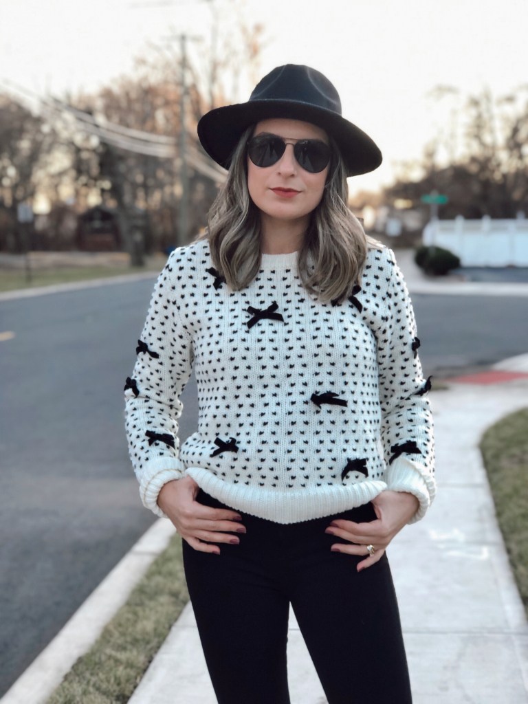 You know that cute sweater you want to keep wearing all winter long? This bow kit sweater is just the one. I love the little touch of bows decoration all over. The color black and white is just my favorite and goes with everything. I was actually eyeing this same sweater at Zara but I did not want to spend $50 on it so when I saw it on Shein for less than $35 I had to get it! I paired it with black skinny jeans and cool low booties. I added a black hat for a more casual look. Get this sweater for under $35 at Shein and use my code Q4PADONI20 to get an extra 15% off. http://shein.top/u3hykbe Search ID 955469