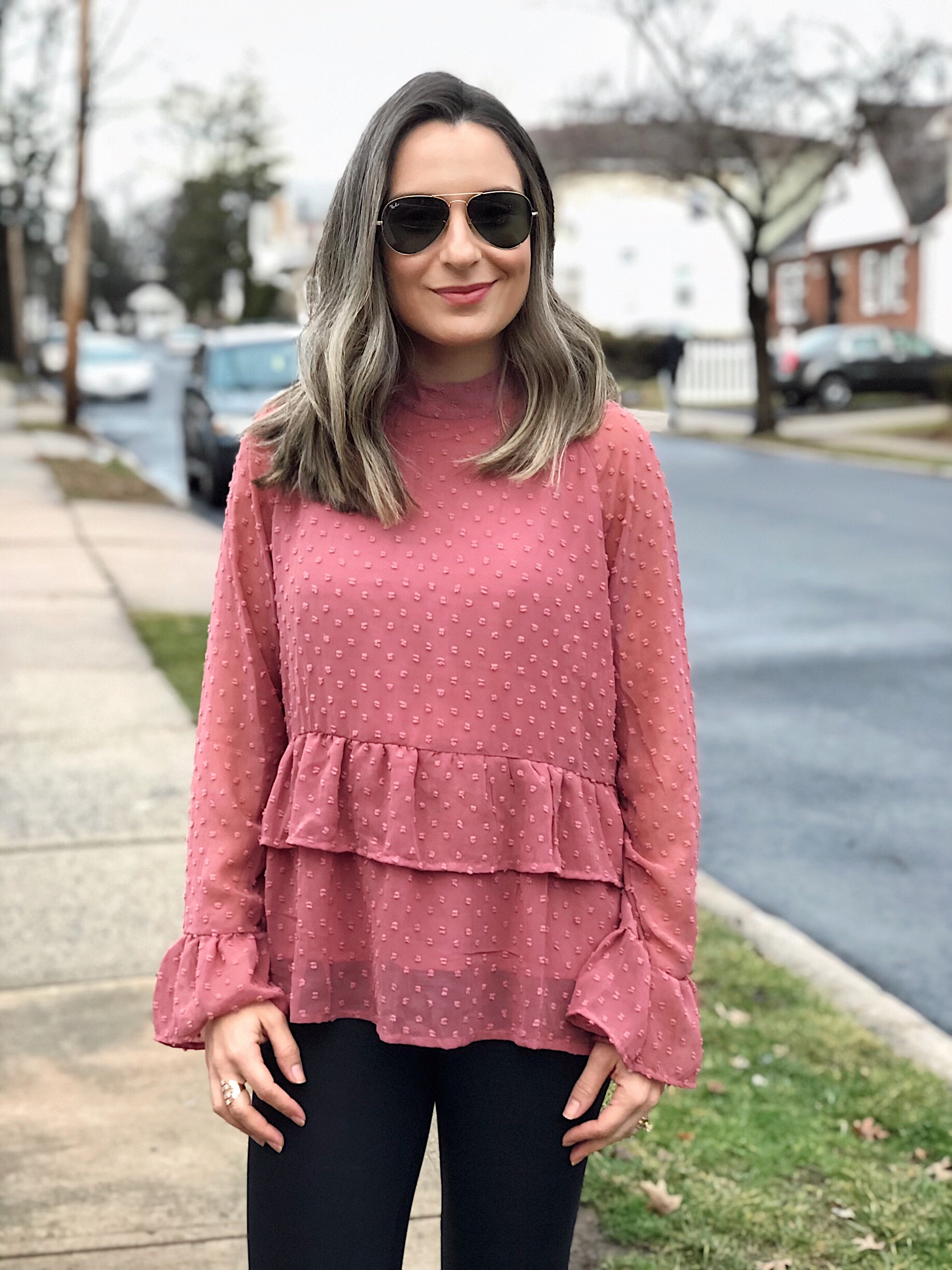 Now if you are looking for a nice blouse to go for a date night or dinner with you loved one this swiss dot peplum blouse is such a great option. I paired with leather leggings and black booties for an easy outfit of the day. http://shein.top/8r386ix ID 957591