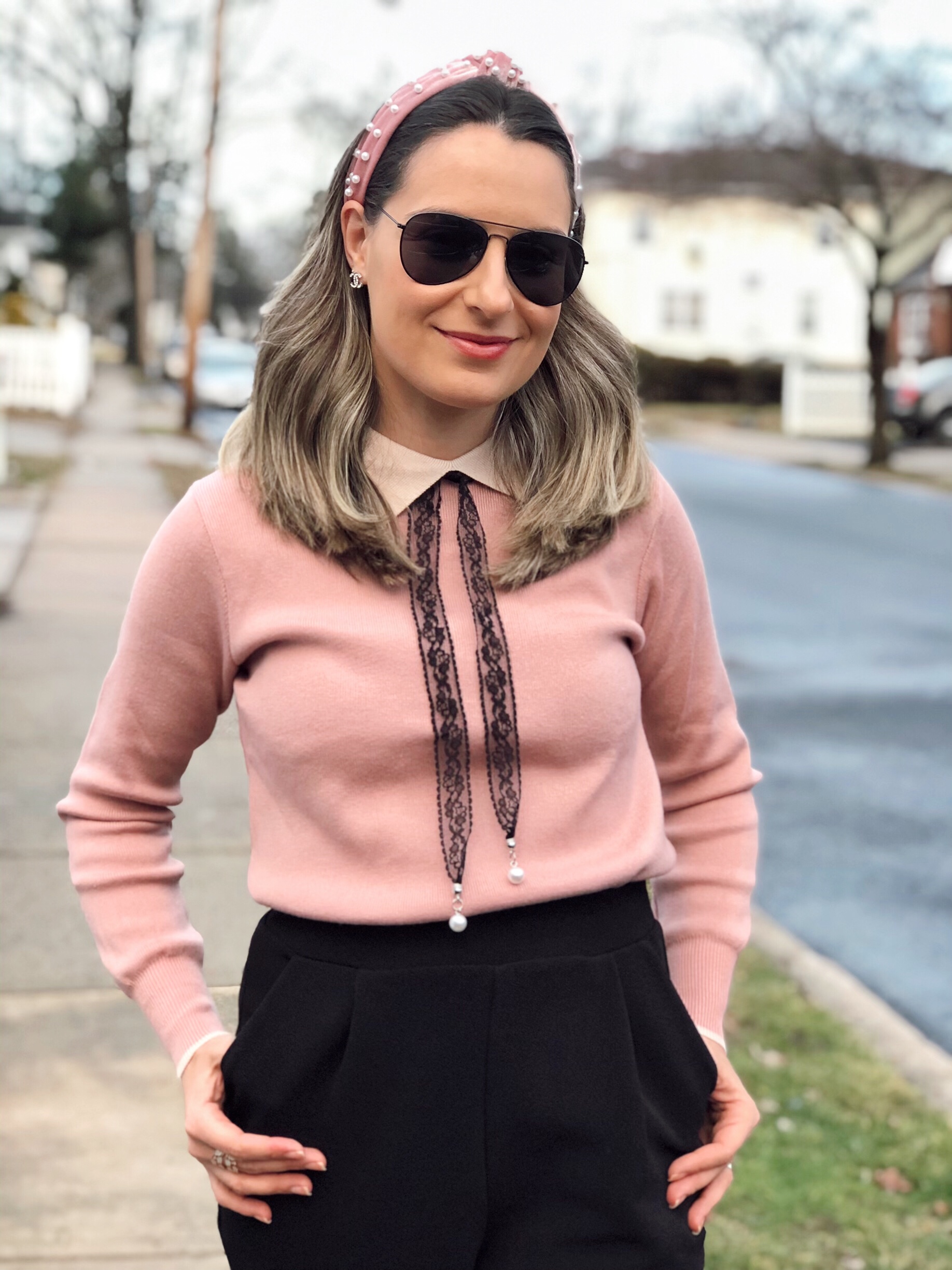 Lastly, a cute pink sweater with pearl detail is very romantic and can be worn with many different outfits like a black skirt or black pants. I love this one because its very girly and beautiful. http://shein.top/q38si25 ID 817008