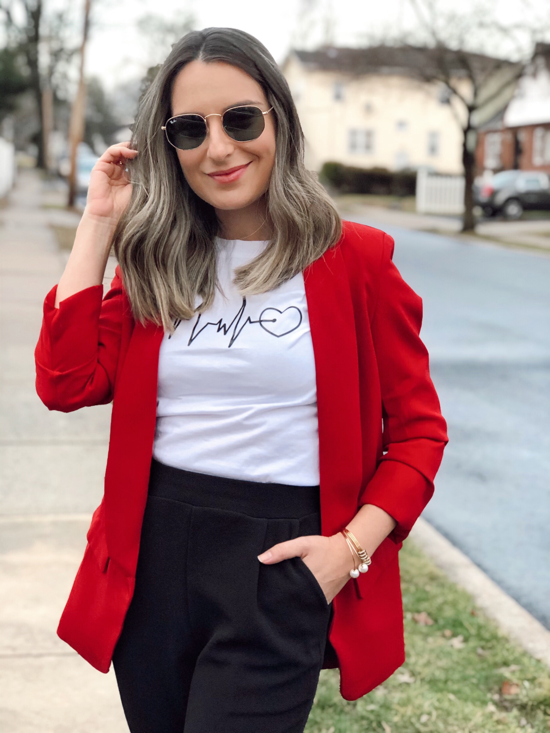 If you work in the office and want to wear a touch of red a nice blazer is a great option. You can dress it down and wear a heart printed tee shirt under it for a cool outfit. http://shein.top/if1tm4g ID 975000