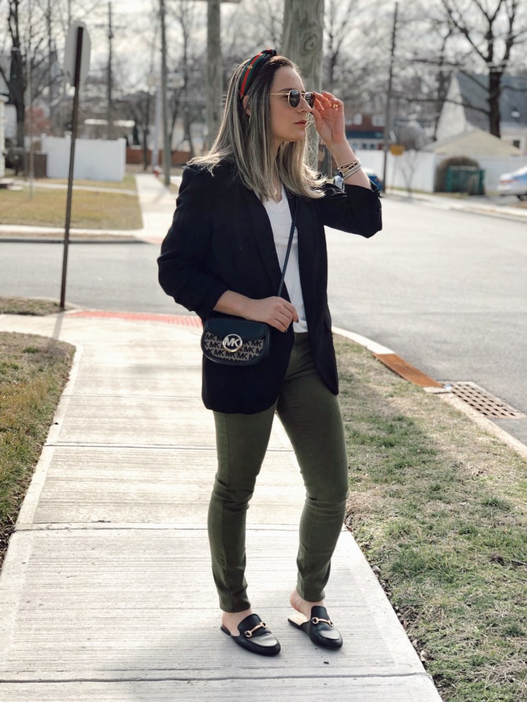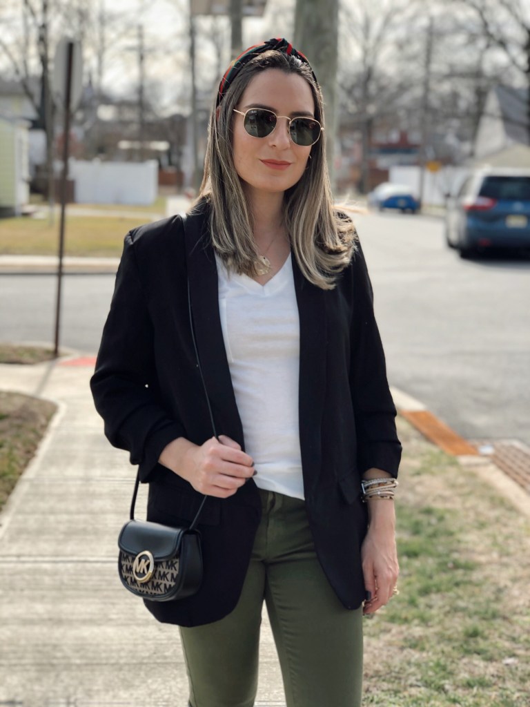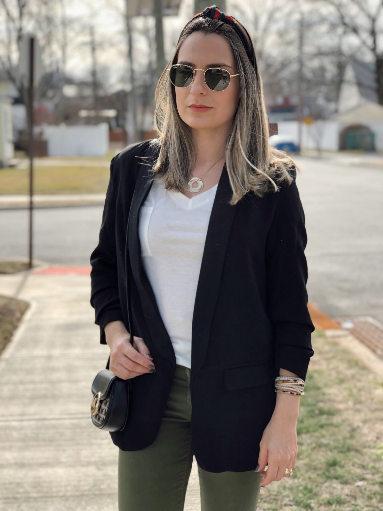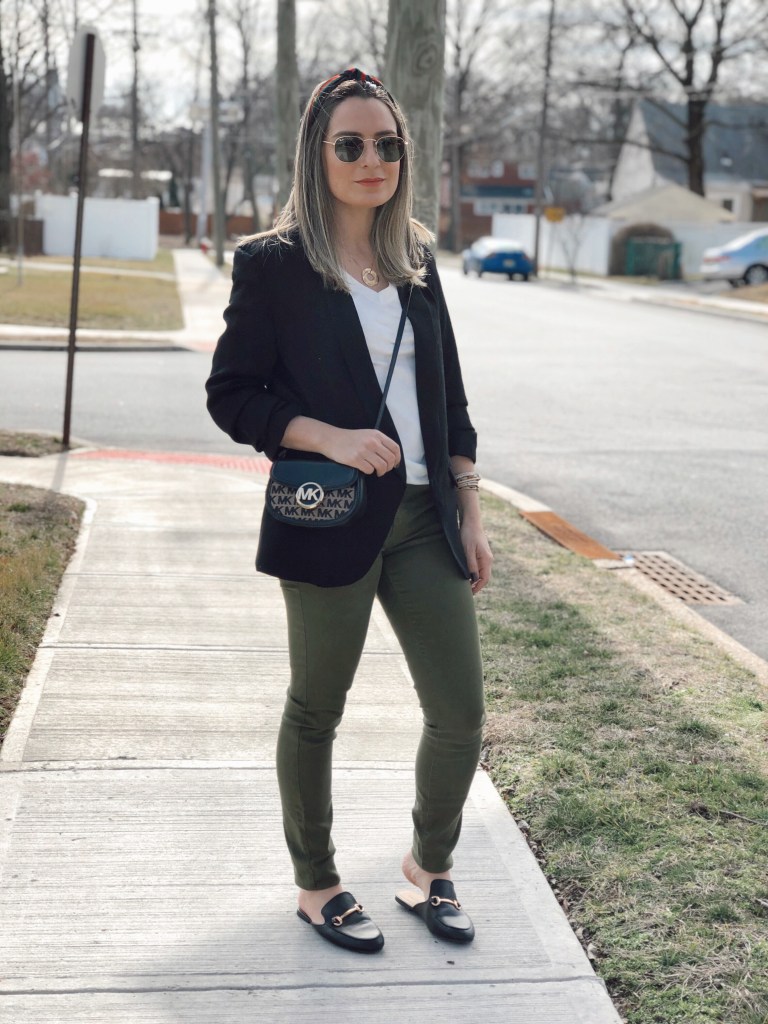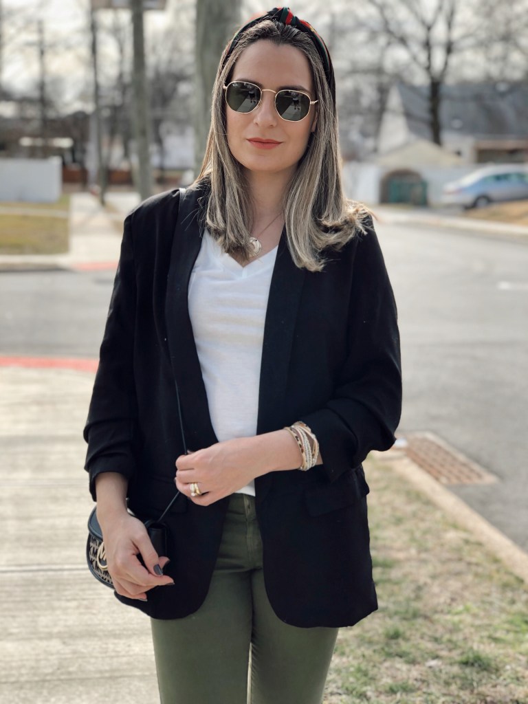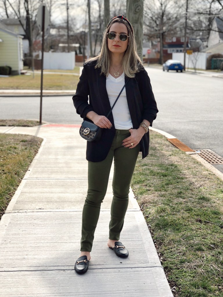 Happy Monday! Sharing with you today’s outfit which is very basic with key pieces that I always reach for in my wardrobe. I think everyone needs a black blazer because it goes with everything. I love to pair with jeans, skirt, denim shorts you name it… Today I paired with a basic white tee shirt and green jeans. It’s that classic piece that can be dressed down or up. This one is from Shein and has a slouch sleeve. Get an extra 15% off using code Q4padoni20 on any purchase.