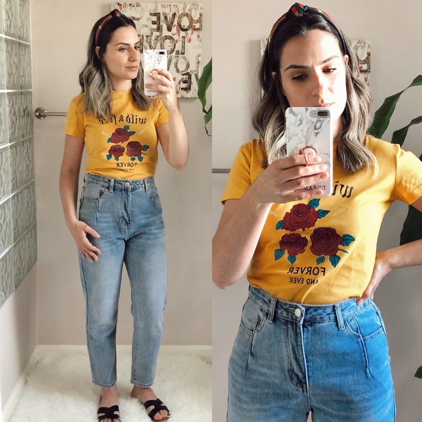 I missed wearing jeans sooo much that when I tried this must have mom jeans I did not want to take it out. Its super comfy and even though the fit is more relaxed it hugs you in all the right places. I love that is super high waisted so I paired it with this cute yellow mustard tee shirt tucked inside. Definetly one of my go to daily outfits but since we are not leaving the house I just tend to wear joggers or pajamas. Haha.
