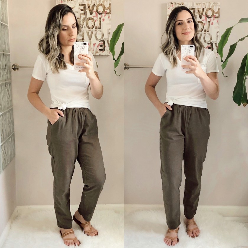 White tee shirt goes with everything and is a must. Now pair it with some loose drawstring waist pants and you are ready for the day. These pants are super comfortable and they adjust in the waist as you like.