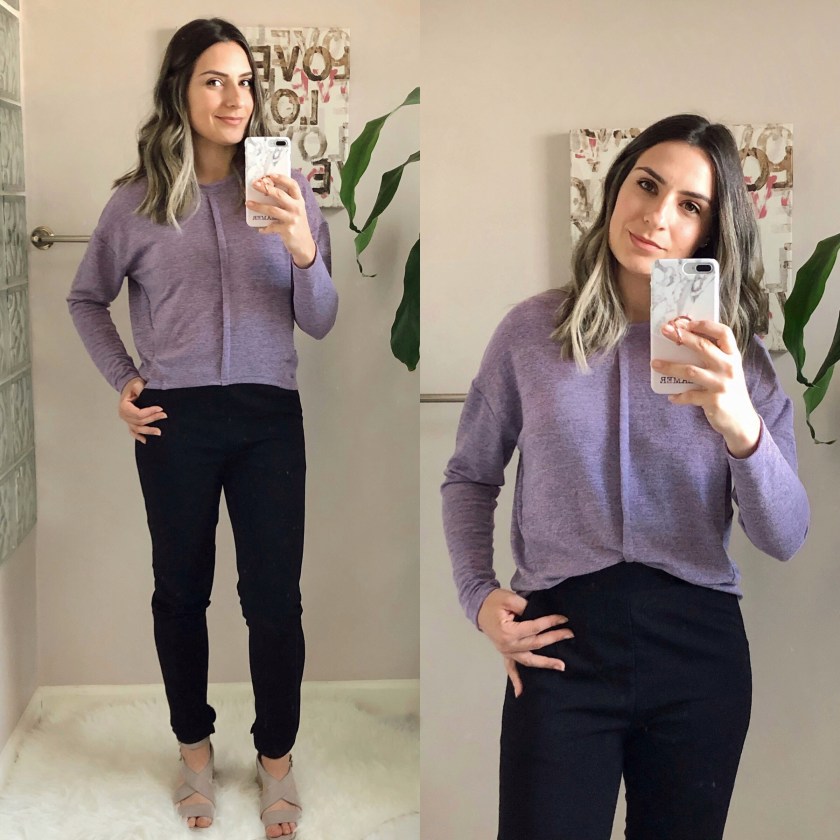 You cant go wrong with simple comfy black pants and a long sleeve thin sweater. These days that you are looking for comfy clothes or are working from home and does not want to be wearing sweatpants, this black pants are a great option. If you need to be on a conference call with your boss, for example, you are going to be looking presentable. I love this lilac sweater, perfect for spring and warmer days.